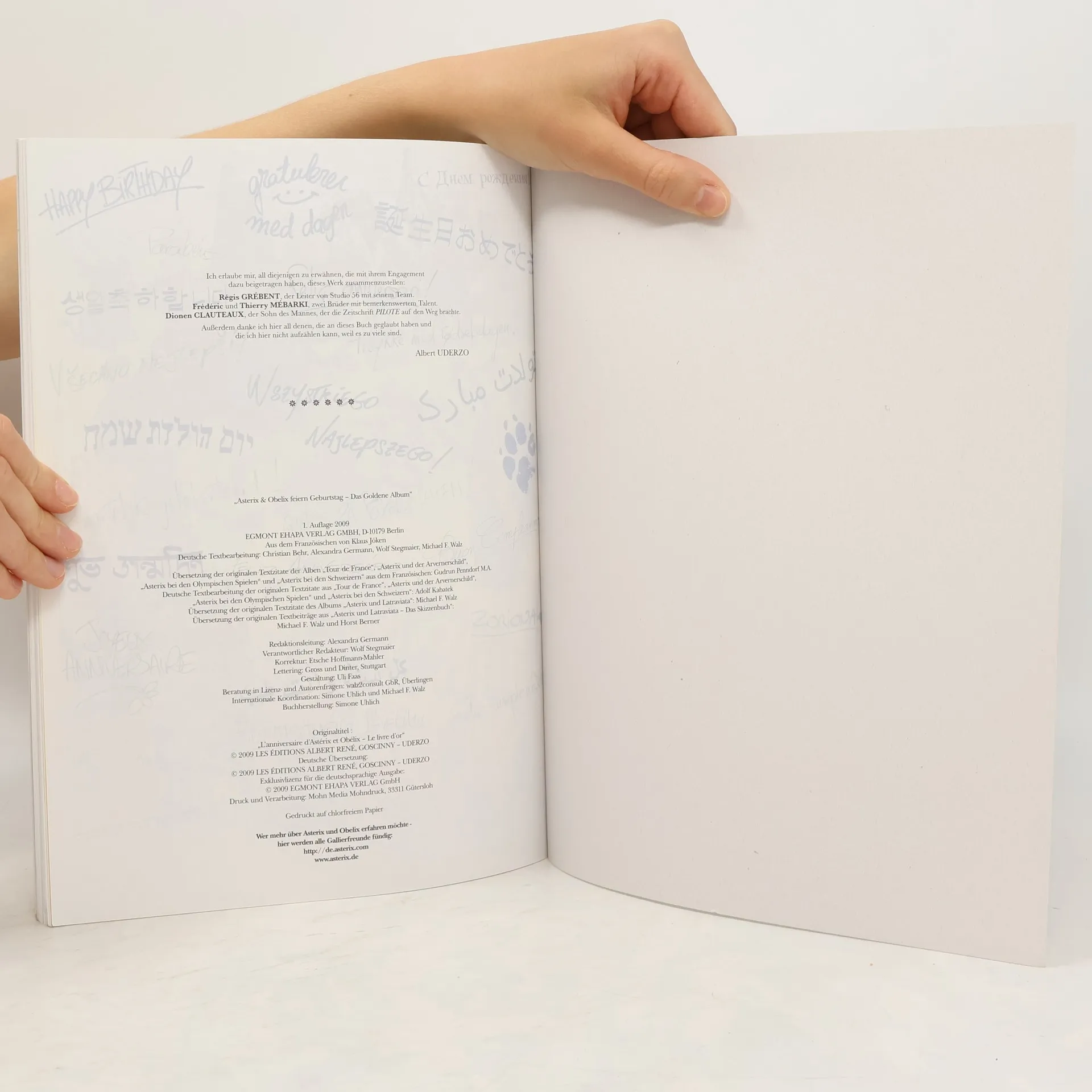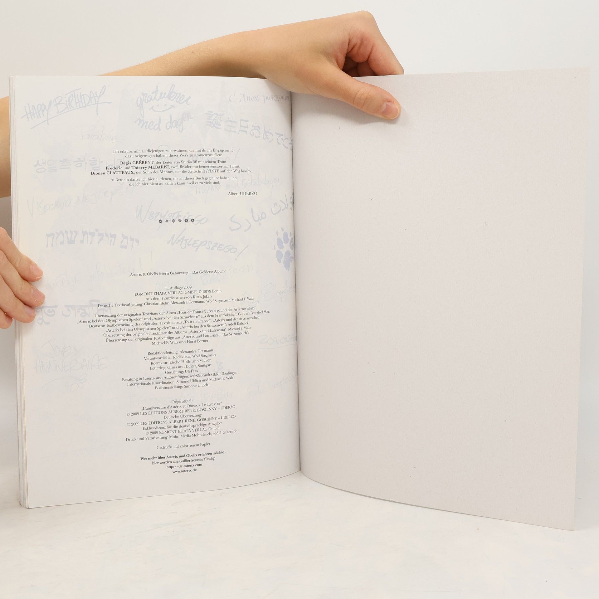 Anlässlich der Festlichkeiten zum fünfzigjährigen Jubiläum von Asterix, der am 29. Oktober 1959 seinen ersten Blick aus einem Comicpanel in der französischen Zeitschrift Pilote warf, hat Albert Uderzo sich ein besonderes Geschenk ausgedacht, um mit seinen Helden und ihren Millionen von Lesern in der ganzen Welt zu feiern. Er schuf ein Album mit Asterix-Kurzgeschichten zum Thema «Geburtstag» mit 56 Seiten bisher unveröffentlichter Comics! Während Asterix und Obelix im Wald um das gallische Dorf auf Wildschweinjagd waren, hat Majestix außerdem einen Großteil der 400 Personen aus den Asterix-Alben versammelt, um das Jubiläum der beiden Freunde vorzubereiten.