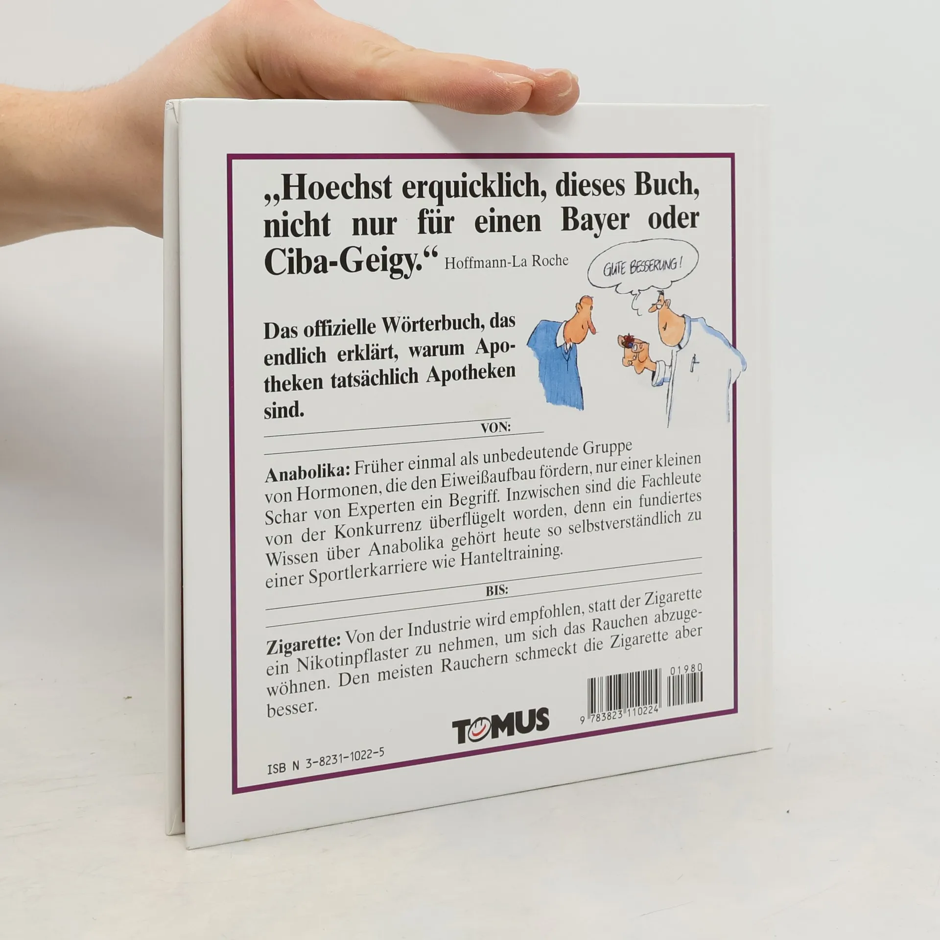Hoechst erquicklich, dieses Buch, nicht nur für einen Bayer oder Ciba-Geigy. Das offizielle Wörterbuch, das endlich erklärt, warum Apotheken tatsächlich Apotheken sind. VON: Antibiotika: Früher einmal als unbedeutende Gruppe von Hormonen, die den Eiweißaufbau fördern, nur einer kleiner Schar von Experten ein Begriff. Inzwischen sind die Fachleute von der Konkurrenz überflügelt worden, denn ein fundiertes Wissen über Anabolika gehört heute so selbstverständlich zu einer Sportlerkarriere wie Hanteltraining. BIS: Zigarette: Von der Industrie wird empfohlen, statt der Zigarette ein Nikotinpflaster zu nehmen, um sich das Rauchen abzugewöhnen. Den meisten Rauchern schmeckt die Zigarette aber besser.