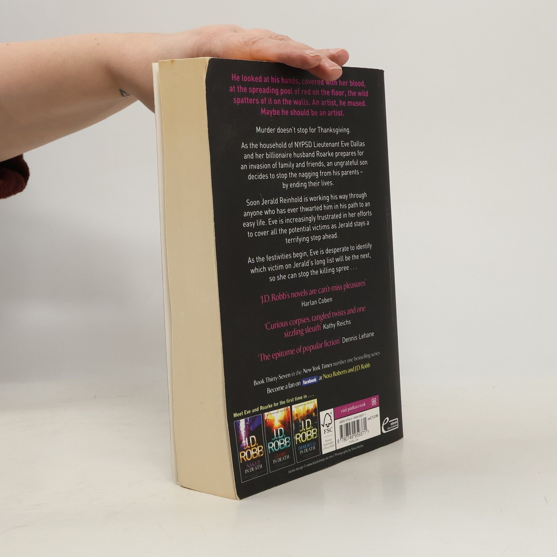 He looked at his hands, covered with her blood, at the spreading pool of red on the floor, the wild spatters of it on the walls. An artist, he mused. Maybe he should be an artist. Murder doesn't stop for Thanksgiving. As the household of NYPSD Lieutenant Eve Dallas and her billionaire husband Roarke prepares for an invasion of family and friends, an ungrateful son decides to stop the nagging from his parents - by ending their lives. Soon Jerald Reinhold is working his way through anyone who has ever thwarted him in his path to an easy life. Eve is increasingly frustrated in her efforts to cover all the potential victims as Jerald stays a terrifying step ahead. As the festivities begin, Eve is desperate to identify which victim on Jerald's long list will be the next, so she can stop the killing spree...