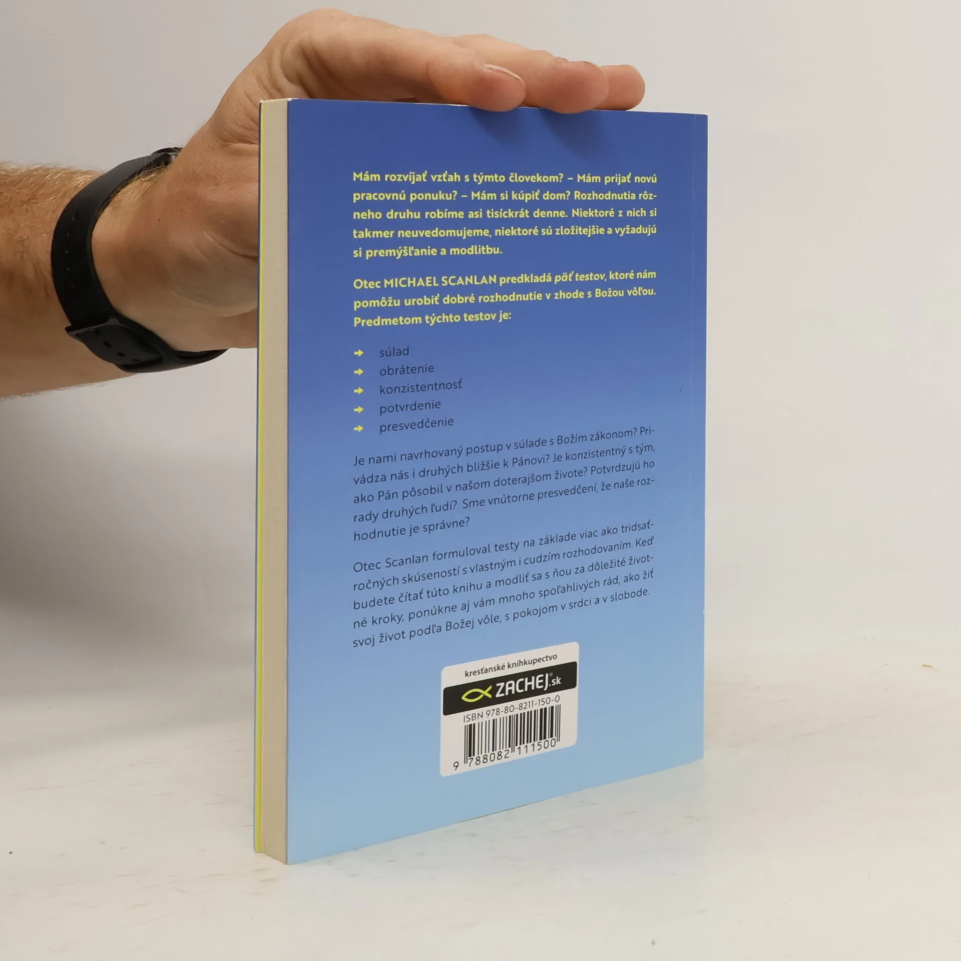 Mám rozvíjať vzťah s týmto človekom? - Mám prijať novú pracovnú ponuku? - Mám si kúpiť dom? Rozhodnutia rôzneho druhu robíme asi tisíckrát denne. Niektoré z nich si takmer neuvedomujeme, niektoré sú zložitejšie a vyžadujú si premýšľanie a modlitbu.Otech MICHAEL SCANLAN predkladá päť testov, ktoré nám pomôžu urobiť dobré rozhodnutie v zhode s Božou vôľou. Predmetom týchto testov je: - súlad - obrátenie - konzistentnosť - potvrdenie - presvedčenieJe nami navrhovaný postup v súlade s Božím zákonom? Privádza nás i druhých bližšie k Pánovi? Je konzistentný s tým, ako Pán pôsobil v našom doterajšom živote? Potvrdzujú ho rady druhých ľudí? Sme vnútorne presvedčení, že naše rozhodnutie je správne?Otec Scanlan formuloval testy na základe viac ako tridsaťročných skúseností s vlastným i cudzím rozhodovaním. Keď budete čítať túto knihu a modliť sa s ňou za dôležité životné kroky, ponúkne aj vám mnoho spoľahlivých rád, ako žiť svoj život podľa Božej vôle, s pokojom v srdci a v slobode.
