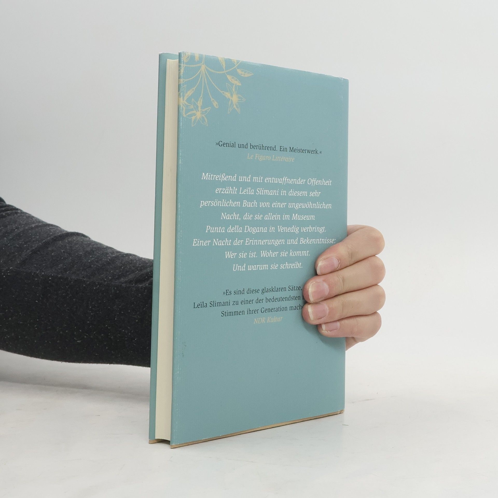 »Es sind diese glasklaren Sätze, die Leila Slimani zu einer der bedeutendsten französischen Stimmen ihrer Generation machen.« NDR Kultur Sie begeistert weltweit. Sie ist mutig. Sie scheut keine Tabus: Die französisch-marokkanische Schriftstellerin Leila Slimani ist ein »Star der französischen Gegenwartsliteratur« (ttt). Mitreißend und mit entwaffnender Offenheit erzählt sie in diesem sehr persönlichen Buch von einer ungewöhnlichen Nacht, die sie allein im Museum Museo Punta della Dogana in Venedig verbringt, dem einstigen Zollgebäude der Serenissima. Einem Ort, an dem sich seit jeher Orient und Okzident begegnen und der zum Sinnbild ihrer eigenen Geschichte wird. Leïla Slimani nimmt uns mit auf eine Reise durch ihr Leben. Fesselnd erzählt sie von ihrer Familie und ihrer Kindheit in Rabat, vom Alltag in Paris als Mutter und Schriftstellerin, vom Leben zwischen den Kulturen, ihrer Aufgabe als Schriftstellerin und gesellschaftspolitisch engagierter Frau – und letztlich von der Kraft der Literatur.