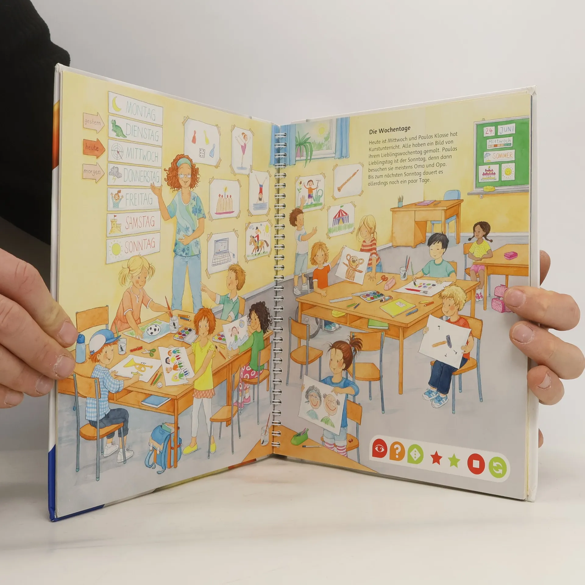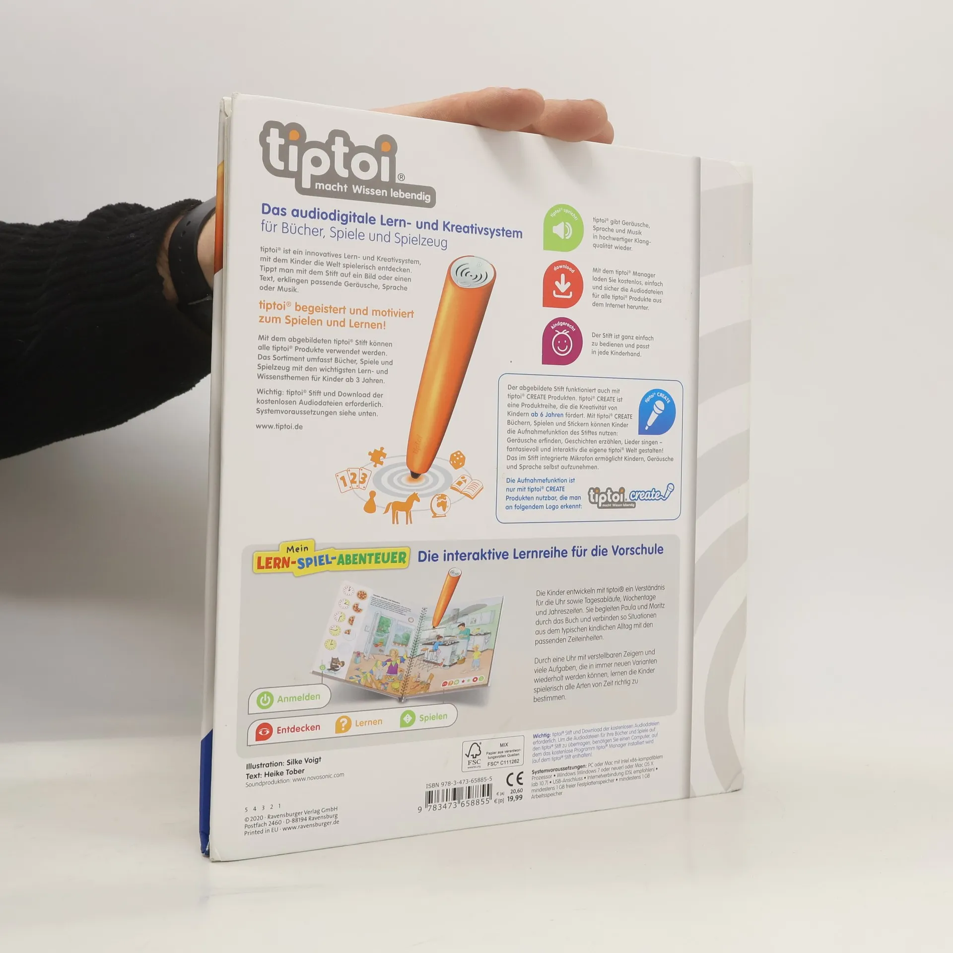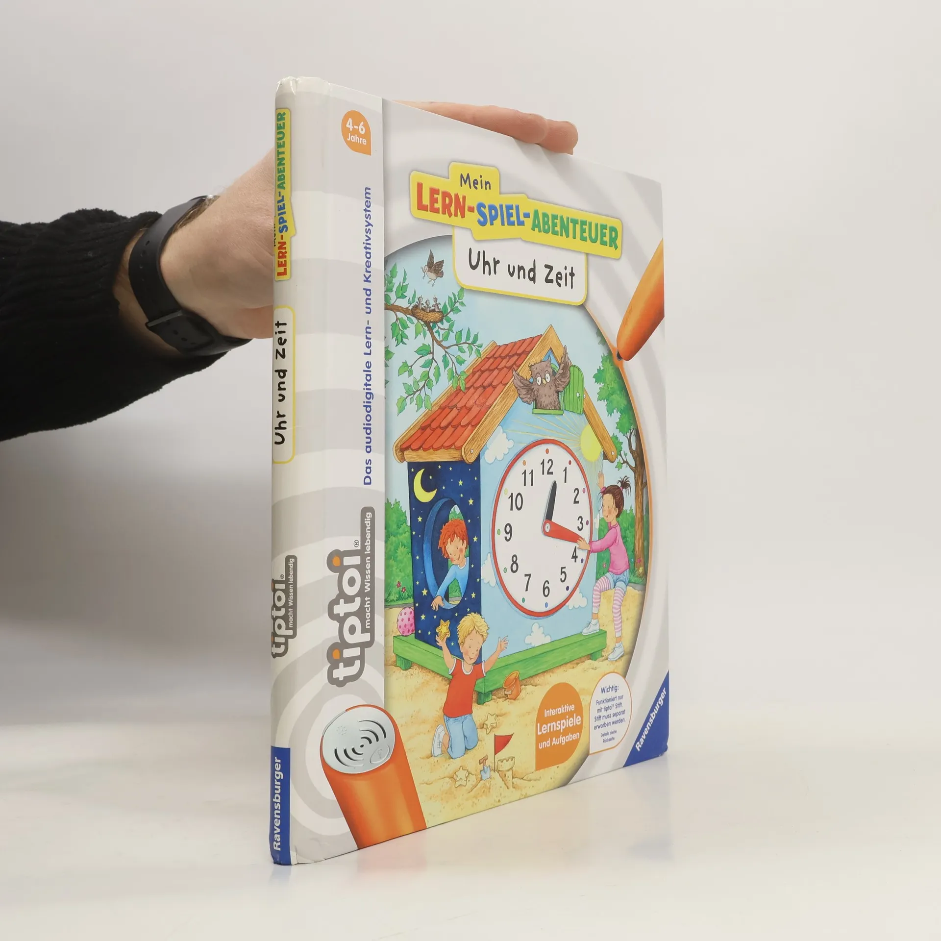 Ein weiteres "Lern-Spiel-Abenteuer" (vgl. "Erstes Englisch"), das sich perfekt für Vorschulkinder, aber auch noch für Kinder der 1. oder 2. Klasse eignet (auch wenn der Verlag es nur für 4 bis 6 Jahre empfiehlt). Man erfährt dabei etwas über die Jahreszeiten und die Wochentage, ausserdem über Tages- und Nachtzeiten und - kindgerecht aufbereitet - die verschiedenen Zeitzonen. Auch das Uhrlesen und -stellen kann man üben (volle Stunden, Viertel- und halbe Stunden), wobei die sehr solide gemachte Uhr mit verstellbarem Stunden- und Minutenzeiger auf der Ausklappseite am Ende des Buches hilft. Der tiptoi-Stift sagt dann, ob man's richtig oder falsch gemacht hat. Sehr unterhaltsam wird das Ganze durch 17 verschiedene Lernspiele (z.B. Uhr stellen; Gegenstände suchen, die es früher schon gab; Jahreszeiten zuordnen; Wochentagsrätsel; Zählen üben), neun weitere Spiele (meist Suchspiele, auch à la "Ich packe meinen Koffer ...") und zwei Lieder. Stimmig auch das Kapitel "Früher und heute", der Vergleich mit Omas Zeiten. Toll gemacht und vorrangig empfohlen für alle tiptoi-Bestände und zum Lernen der Uhr. Ab 4