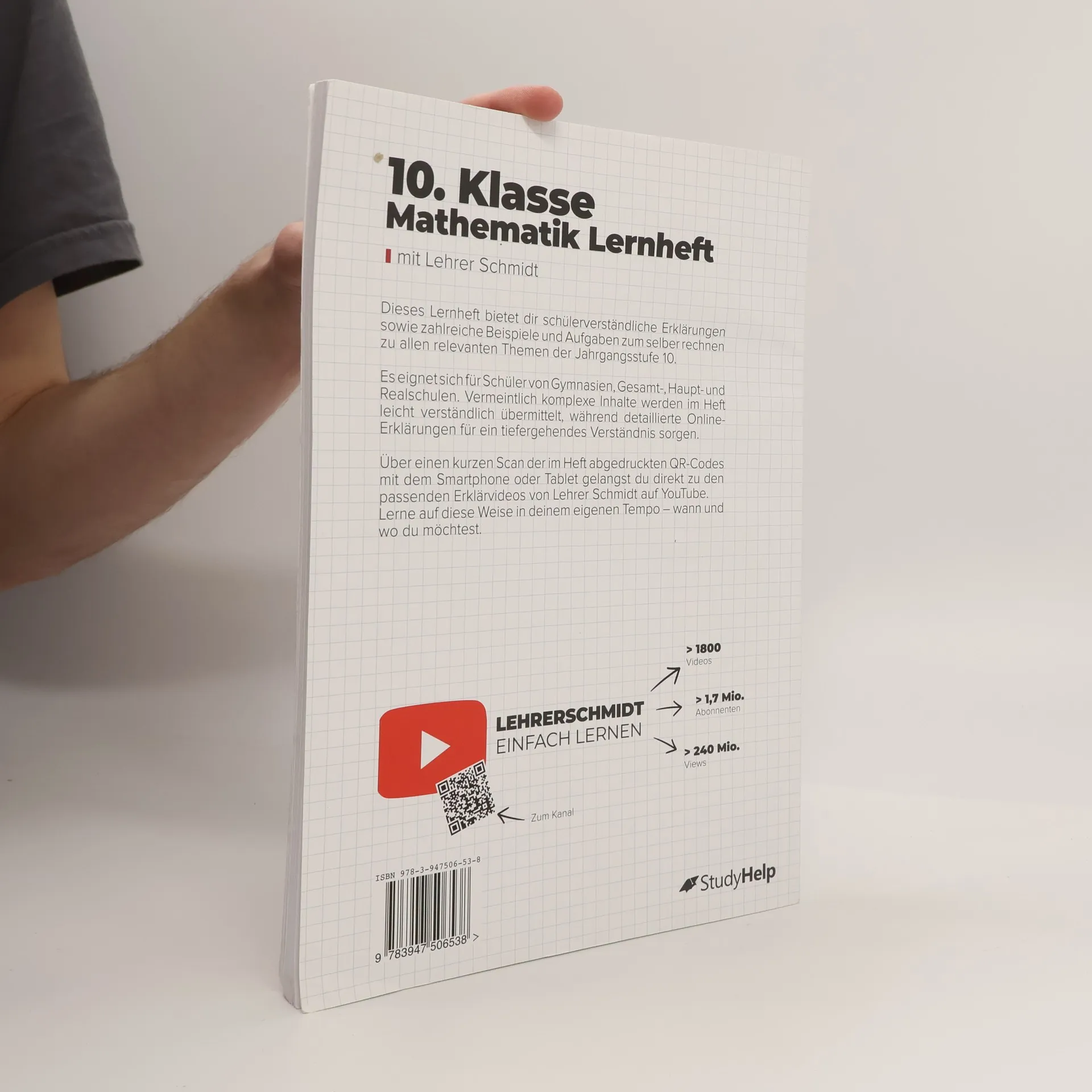Unser Lernheft ist die ideale Ergänzung zu deinem Schulbuch und hilft dir, mit Lernvideos von Lehrer Schmidt, Wissenslücken zu schließen und nicht den Anschluss zu verlieren. 92 Seiten anschauliche Erklärungen 41 Lernvideos von Lehrer Schmidt 45 Aufgaben inkl. Lösungen In diesem Lernheft für die Sekundarstufe I findest du Erklärungen und Beispielaufgaben zu allen relevanten Themen der 10. Klasse für Gymnasien, Gesamt-, Haupt- und Realschulen . Vermeintlich komplizierte Zusammenhänge sind in einer für dich vollkommen verständlichen Sprache dargestellt. Außerdem findest du zu den Themen alle Formeln, Skizzen und was sonst noch notwendig ist, um den Sachverhalt zu verstehen. Jedes Kapitel verfügt über Aufgaben zum selber rechnen mit ausführlichen Lösungswegen. Als ergänzendes Lernmaterial stehen dir dank der QR-Codes im Heft themenbasierte Erklärvideos von Lehrer Schmidt sofort zur Verfügung. Scanne hierzu mit deinem Smartphone oder Tablet den QR-Code ab und sieh dir ein auf dein Kapitel zugeschnittenes Video an. Auf diese Weise kannst du dich optimal auf mathematische Inhalte vorbereiten und wichtige Themen wiederholen . Inhaltsverzeichnis Quadratische Gleichungen Lineare Gleichungssysteme Potenzen, Wurzeln und Potenzfunktionen Trigonometrische Funktionen Formeln Anwenden Körper berechnen Statistik (Daten) Stochastik (Wahrscheinlichkeiten) Lösungen