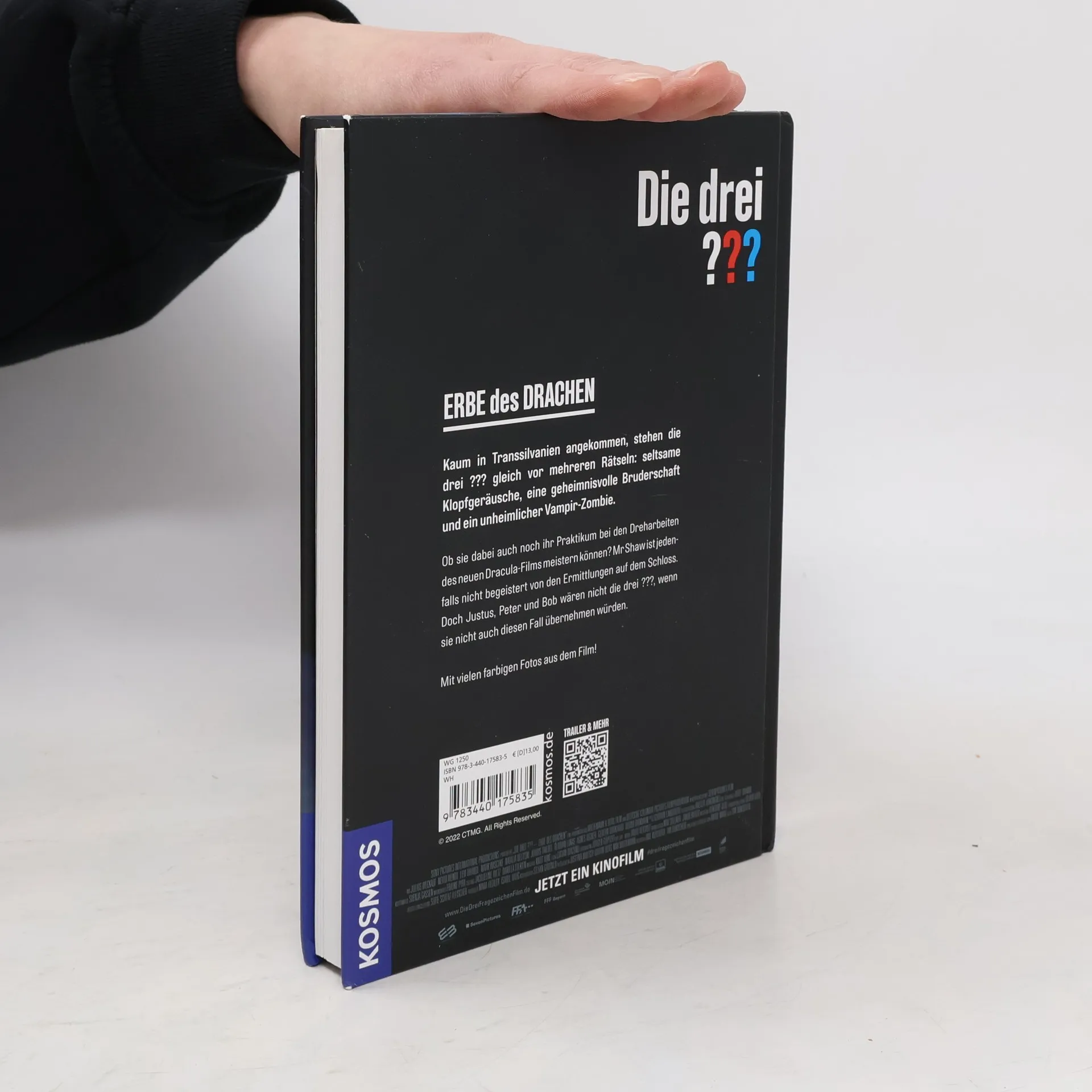 Die drei ??? übernehmen jeden Fall. Ein Leseabenteuer mit Kino-Feeling: Noch vor dem Start von „Die drei ??? – Erbe des Drachen“, dem neuen Kinofilm, erscheint bei Kosmos das Buch mit der spannenden Story. Ein Praktikum am Filmset von „Dracula Rises“ führt die Detektive tief hinein nach Transsilvanien und auf die Spur des mysteriösen Drachenordens. Nervenkitzel mit Gruselfaktor, illustriert mit tollen Fotos aus dem Film.