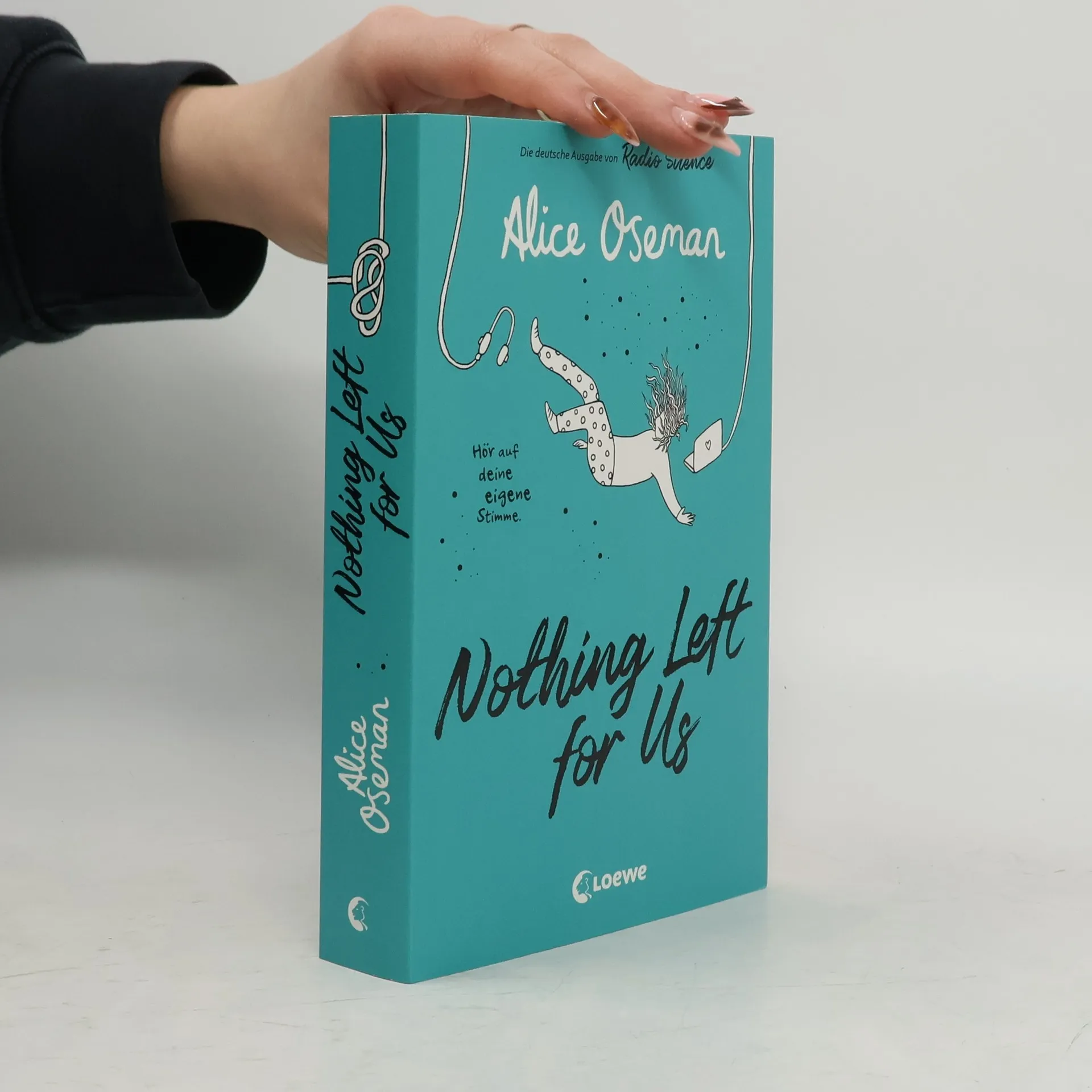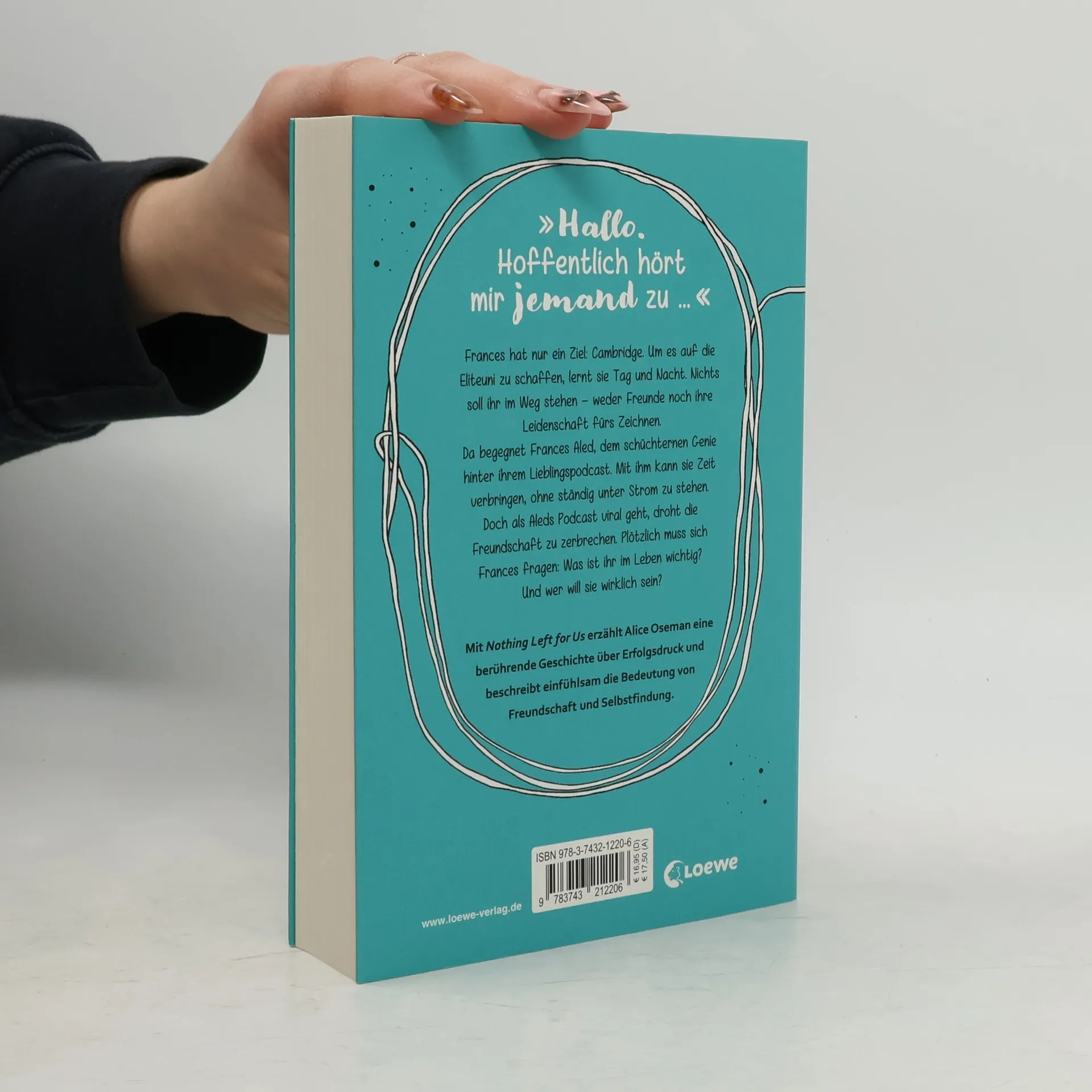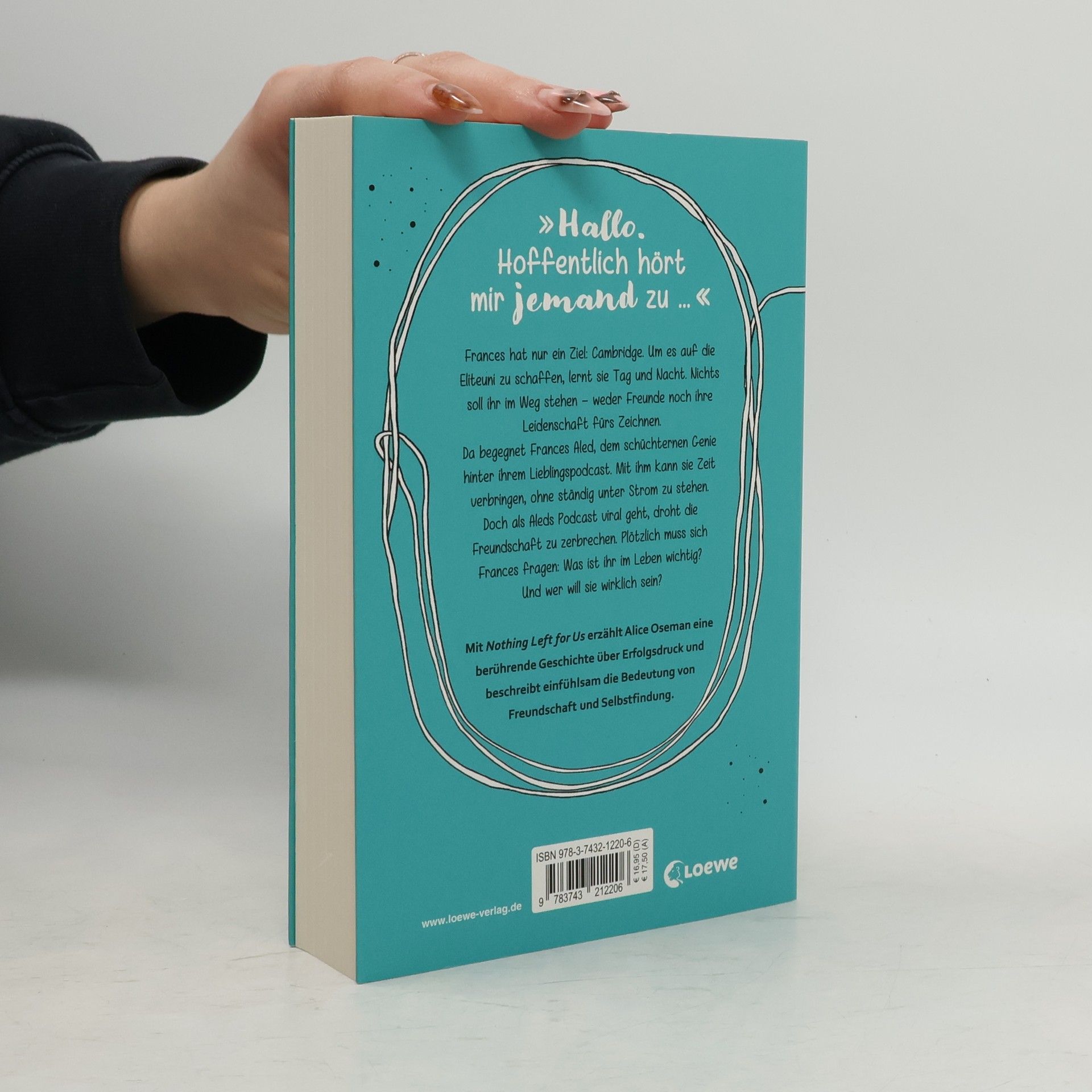 Das Buch ist bei deiner Buchhandlung vor Ort und bei vielen Online-Buchshops erhältlich! Die deutsche Ausgabe des Erfolgsromans Radio Silence Von der Heartstopper-Autorin Alice Oseman „Hallo. Hoffentlich hört mir jemand zu …“ Frances hat nur ein Ziel: Cambridge. Um es auf die Eliteuni zu schaffen, lernt sie Tag und Nacht. Nichts soll ihr im Weg stehen – weder Freunde noch ihre Leidenschaft fürs Zeichnen. Da begegnet Frances Aled, dem schüchternen Genie hinter ihrem Lieblingspodcast. Mit ihm kann sie Zeit verbringen, ohne ständig unter Strom zu stehen. Doch als Aleds Podcast viral geht, droht die Freundschaft zu zerbrechen. Plötzlich muss sich Frances fragen: Was ist ihr im Leben wichtig? Wer will sie wirklich sein? Finde dich selbst in dieser außergewöhnlichen und tiefgründigen Geschichte Mit ihrem Coming of Age-Roman Nothing Left for Us erzählt Alice Oseman eine eindrückliche Geschichte über Erfolgsdruck und beschreibt durch den Einsatz von Podcast-, Mail- und Chatnachrichten einfühlsam die Bedeutung von Freundschaft und Selbstfindung. Alice Oseman trifft das Lebensgefühl der jungen Lesenden Mit ihrem feinen Gespür für die Gefühle junger Menschen auf ihrer Suche nach Identität und Selbstbewusstsein begeistert Alice Oseman eine ganze Generation. Graphic Novels aus dem Heartstopper-Universum: Heartstopper Volume 1 Heartstopper Volume 2 Heartstopper Volume 3 Heartstopper Volume 4 Heartstopper Volume 5Heartstopper Volume 6 - folgt Romane aus dem Heartstopper-Universum: Nick & Charlie This Winter Weitere Jugendbuchromane von Alice Oseman bei Loewe: Loveless Nothing Left for Us (die deutsche Übersetzung von Radio Silence) Solitaire I was Born for ThisKlimaneutrales Produkt – Wir unterstützen ausgewählte Klimaprojekte!