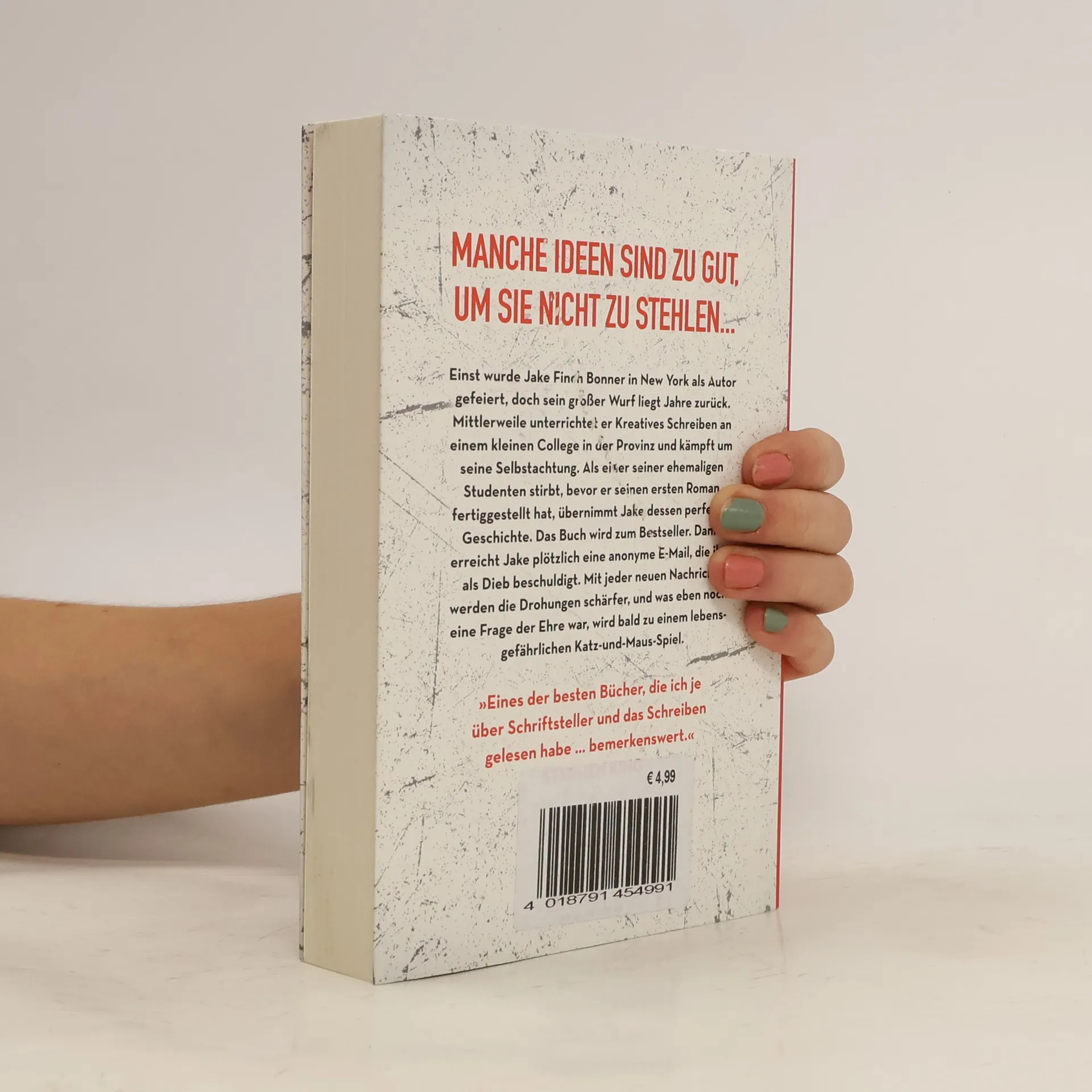 Der New-York-Times-Bestseller: klug, überraschend, nervenaufreibend spannend Einst wurde Jake Finch Bonner in New York als Autor gefeiert. Doch sein großer Wurf liegt Jahre zurück und mittlerweile unterrichtet er Kreatives Schreiben an einem kleinen College in der Provinz. Als einer seiner ehemaligen Studenten stirbt, bevor er seinen ersten Roman fertiggestellt hat, übernimmt Jake dessen perfekte Geschichte. Das Buch wird über Nacht zum Bestseller. Dann erreicht Jake plötzlich eine anonyme E-Mail, die nur einen Satz enthält: „Du bist ein Dieb“. Mit jeder neuen Nachricht werden die Drohungen schärfer, und was eben noch eine Frage der Ehre und Karriere war, wird bald zu einem lebensgefährlichen Katz-und-Maus-Spiel. „Wahnsinnig lesenswert“ Stephen King Manche Ideen sind zu gut, um sie nicht zu stehlen... „Wenn Sie Bücher mögen, in denen eine einzige falsche Entscheidung einen unkontrollierbaren Schneeballeffekt auslöst, dann ist das hier genau das Richtige. Was für eine spektakuläre Lawine.“ New York Times Für Fans von Donna Tartt und Joël Dicker Serienverfilmung mit Oscarpreisträger Mahershala Ali in Planung Der New-York-Times-Bestseller: klug, überraschend, nervenaufreibend spannend