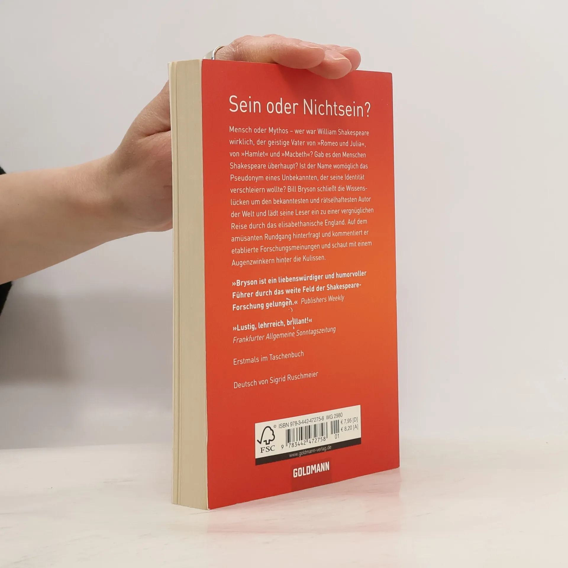 Typisch Bill Bryson: eine humorvolle und leicht verständliche Einführung in Shakespeares Leben, seine Werke und seine Zeit Mensch oder Mythos – wer war William Shakespeare wirklich, der geistige Vater von Romeo und Julia, von Hamlet und Macbeth? Gab es den Menschen Shakespeare überhaupt? Ist der Name womöglich das Pseudonym eines Unbekannten, der seine Identität verschleiern wollte? Bill Bryson schließt die Wissenslücken um den bekanntesten und rätselhaftesten Autor der Welt. Dabei lädt er seine Leser ein zu einer vergnüglichen Reise durch das elisabethanische England. Ein echter Bill Bryson: eloquent, klug und mit einem Augenzwinkern geschrieben.