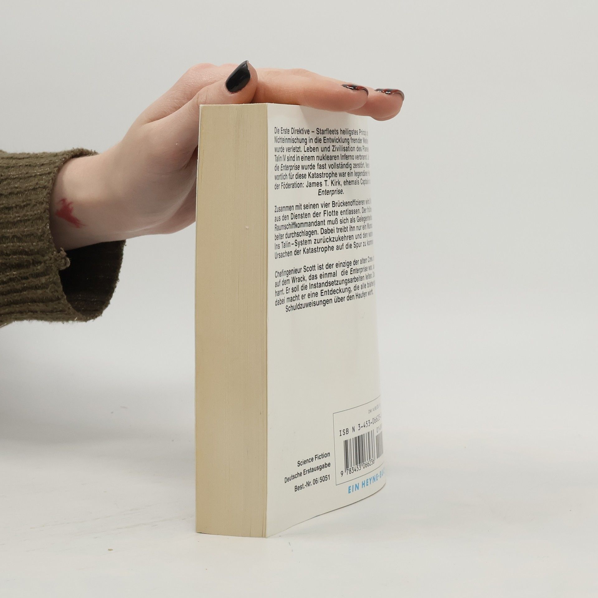 Die Erste Direktive - Starfleets heiligstes Prinzip der Nichteinmischung in die Entwicklung fremder Welten - wurde verletzt. Leben und Zivilisation des Planeten Talin IV sind in einem nuklearen Inferno verbrannt. Und die Enterprise wurde fast vollständig zerstört. Verantwortlich für diese Katastrophe war ein legendärer Held der Föderation: James T. Kirk, ehemals Captain der Enterprise. Zusammen mit seinen vier Brückenoffizieren wird Kirk aus den Diensten der Flotte entlassen. Der frühere Raumschiffkommandant muß sich als Gelegenheitsarbeiter durchschlagen. Dabei treibt ihn nur ein Wunsch: Ins Talin —System zurückzukehren und den wahren Ursachen der Katastrophe auf die Spur zu kommen. Chefingenieur Scott ist der einzige der alten Crew, der auf dem Wrack, das einmal die Enterprise war, ausharrt. Er soll die Instandsetzungsarbeiten leiten. Doch dabei macht er eine Entdeckung, die alle bisherigen Schuldzuweisungen über den Haufen wirft. Science Fiction Deutsche Erstausgabe
