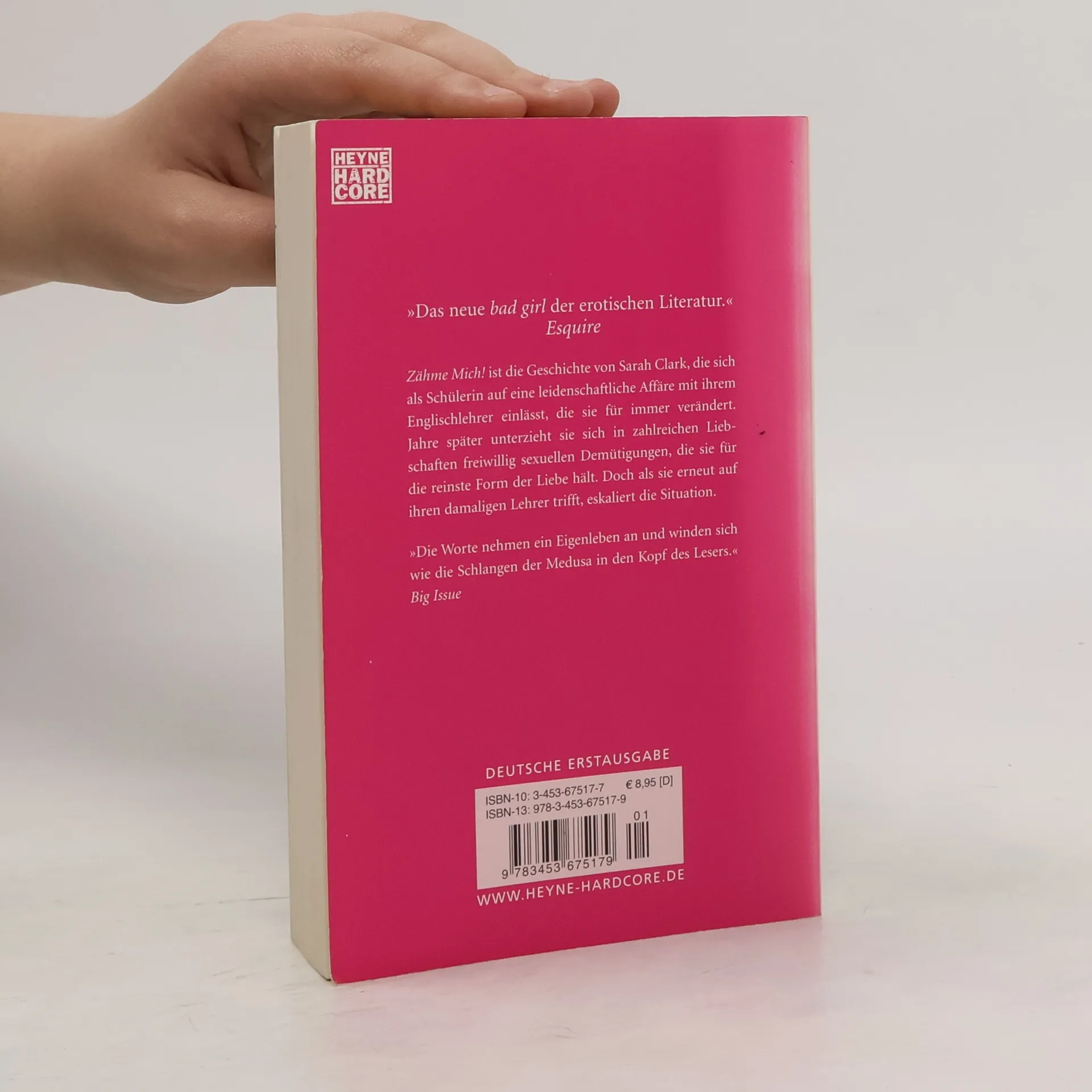 „Zähme mich!“ ist die Geschichte von Sarah Clark, die sich als Schülerin auf eine leidenschaftliche Affäre mit ihrem Englischlehrer einlässt, die sie für immer verändert. Jahre später unterzieht sie sich in zahlreichen Liebschaften freiwillig sexuellen Demütigungen, die sie für die reinste Form der Liebe hält. Als sie erneut auf ihren damaligen Englischlehrer trifft, eskaliert die Situation. Ein packender Roman über das Erwachsenwerden und die Macht der Leidenschaft, und gleichzeitig das Aufsehen erregende Debüt einer jungen Autorin, die ohne Tabus über sexuelle Obsessionen schreibt.