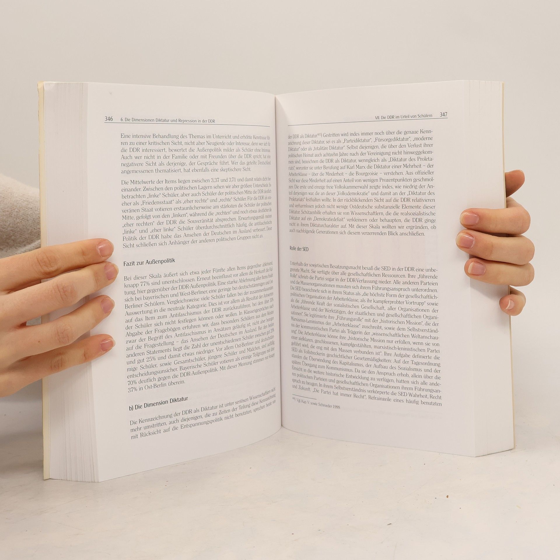 Das Buch basiert auf einer umfassenden Befragung von über 5.200 Schülern aus Bayern, Ost- und West-Berlin, Brandenburg und Nordrhein-Westfalen zu ihren Kenntnissen und Meinungen über die DDR und das geteilte Deutschland. Zusätzlich wurden hunderte Schüler in Einzel- und Gruppengesprächen nach den Gründen für ihre Bewertungen befragt. Um die Ergebnisse einordnen zu können, enthält es Kapitel über Geschichtsbilder und Geschichtspolitik, Geschichtskenntnisse in der Bevölkerung sowie das Bild der DDR in der ost- und westdeutschen Bevölkerung und Wissenschaft. Es wird deutlich, dass viele, insbesondere ostdeutsche Schüler, eine verharmlosende Sicht auf die SED-Diktatur haben, die auch in der (ostdeutschen) Bevölkerung und unter Wissenschaftlern verbreitet ist. Die Autoren stellen fest, dass die Schüler ihr „Wissen“ über die DDR hauptsächlich aus der Familie und Filmen beziehen, weniger aus der Schule, wo das Thema oft kaum behandelt wird. Das Buch bietet grundlegende Informationen zu den Dimensionen von Staat und Gesellschaft der DDR und der (alten) Bundesrepublik sowie Hinweise auf weiterführende Literatur, sodass es von Lehrern, Studenten und Schülern als einführendes Kompendium in die DDR-Geschichte genutzt werden kann.
