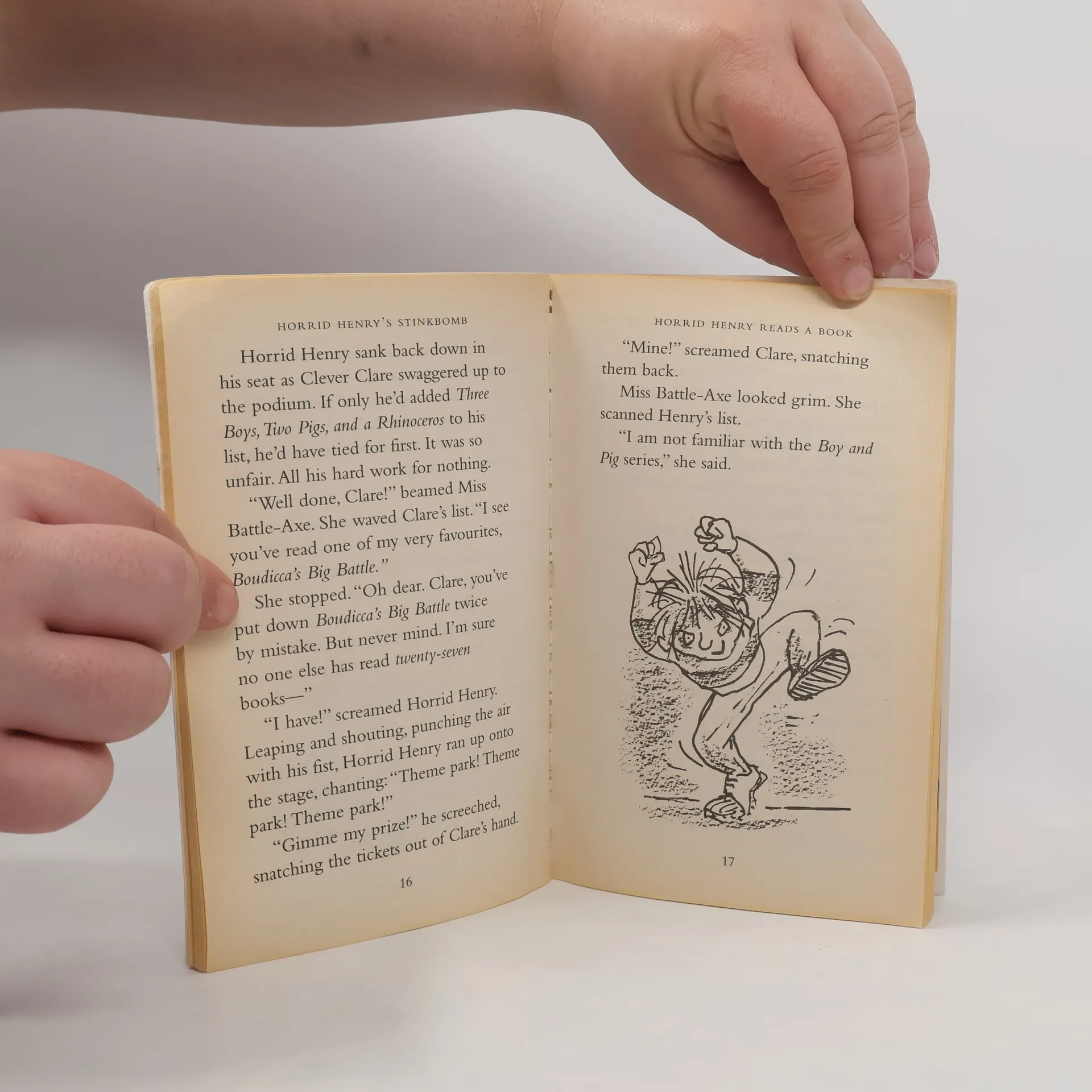 A stinkbomb becomes a deadly weapon in Horrid Henry's long-running war with Moody Margaret; he uses all his guile to win the school reading competition, only to find the longed-for prize is not what he expected; he goes for a sleepover and retreats in horror when he finds that other people's houses aren't always as nice as his own; and he has the joy of seeing Miss Battle-Axe ticked off by the Head when he knows it was all his fault. In short, another vintage HORRID HENRY title!