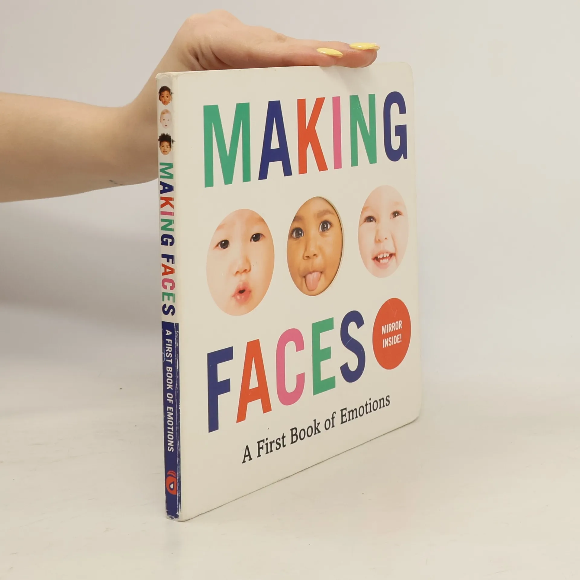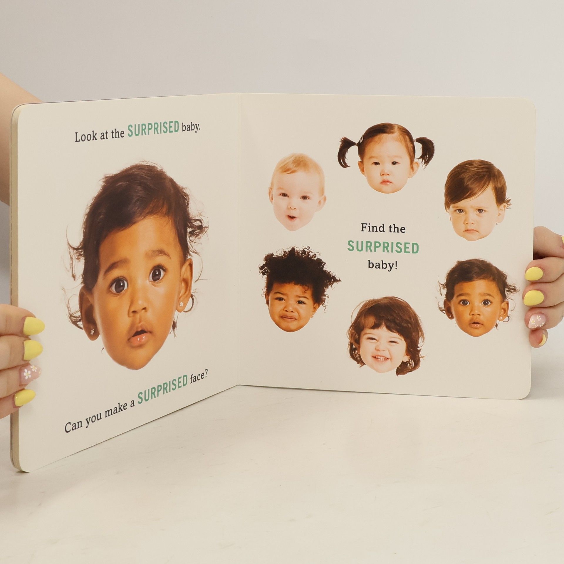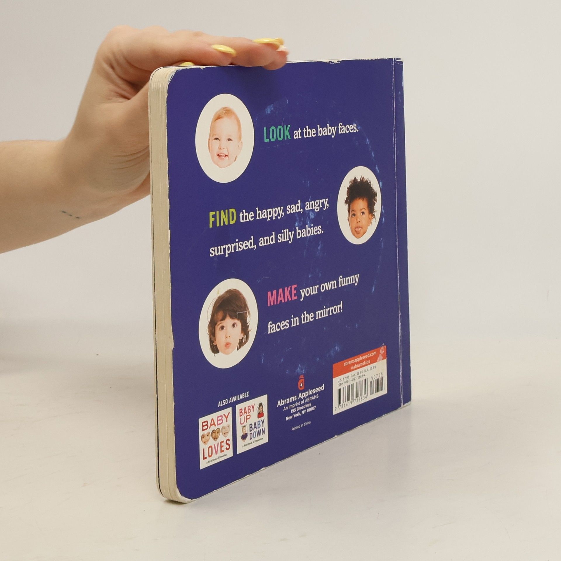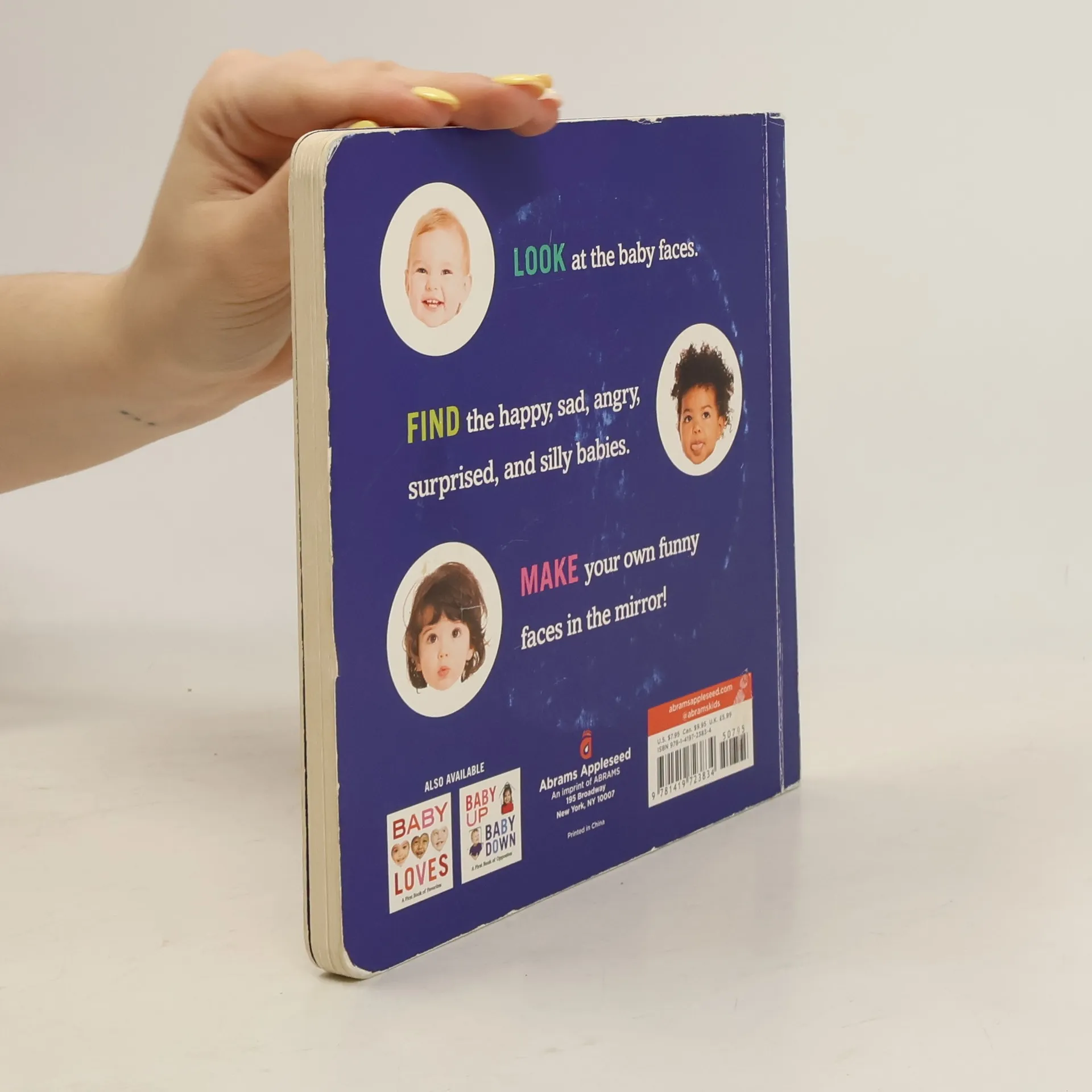 Look at the happy baby. Can you make a happy face? Find the happy baby This bold, beautiful board book introduces five essential expressions: happy, sad, angry, surprised, and silly. Each is introduced with a large image of a baby's face. Readers are asked to mimic the face, then pick it out from a group of other babies. The very last spread includes all of the expressions from the previous pages, and a mirror so readers can watch themselves make any face they please.