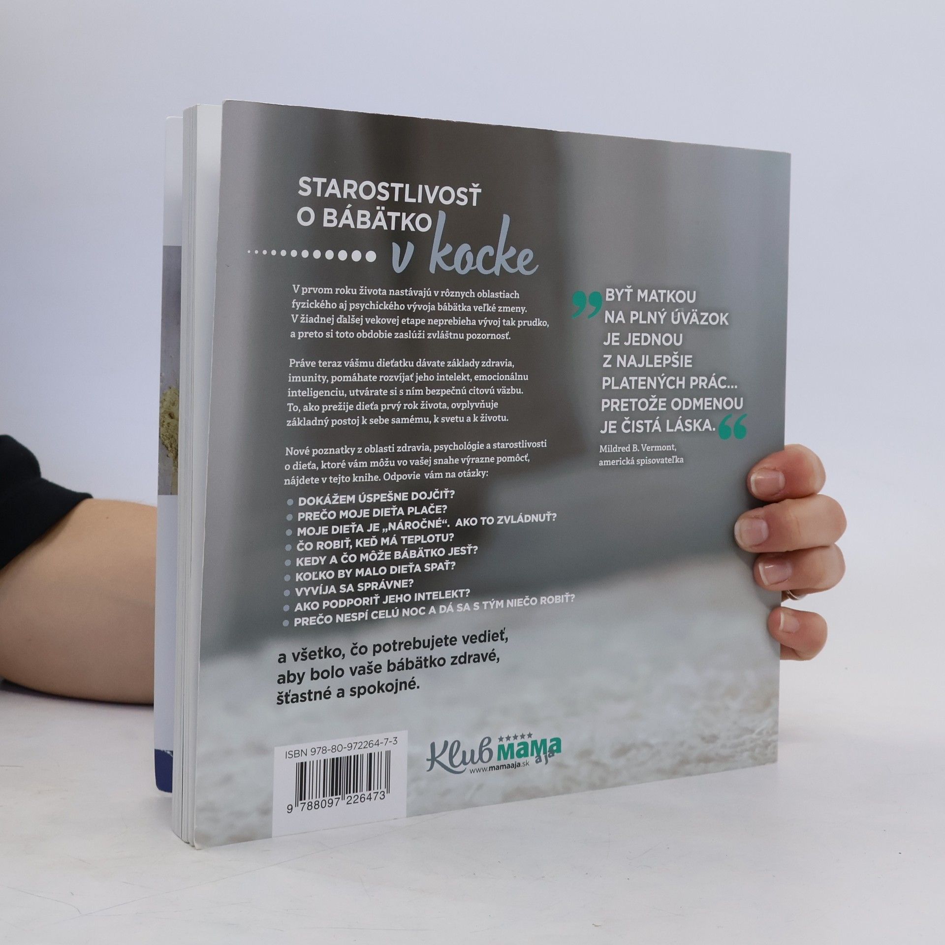 Starostlivosť o bábätko v kocke. V prvom roku života nastávajú v rôznych oblastiach fyzického aj psychického vývoja bábätka veľké zmeny. V žiadnej ďalšej vekovej etape neprebieha vývoj tak prudko, a preto si toto obdobie zaslúži zvláštnu pozornosť. Práve teraz vášmu dieťatku dávate základy zdravia, imunity, pomáhate rozvíjať jeho intelekt, emocionálnu inteligenciu, utvárate si s ním bezpečnú citovú väzbu.To, ako prežije dieťa prvý rok života, ovplyvňuje základný postoj k sebe samému, ku svetu a k životu. Nové poznatky z oblasti zdravia, psychológie a starostlivosti o dieťa, ktoré vám môžu vo vašej snahe výrazne pomôcť, nájdete v tejto knihe. Odpovie vám na vaše otázky: Dokážem úspešne dojčiť? Prečo moje dieťa plače? Moje dieťa je náročné. Ako to zvládnuť? Čo robiť, keď má teplotu? Kedy a čo môže bábätko jesť? Koľko by malo dieťa spať? Vyvíja sa správne? Ako podporiť jeho intelekt? Prečo nespí celú noc a dá sa s tým niečo robiť? Čo treba vybaviť na úradoch a na čo mám nárok? a všetko, čo potrebujete vedieť, aby bolo vaše bábätko zdravé, šťastné a spokojné.