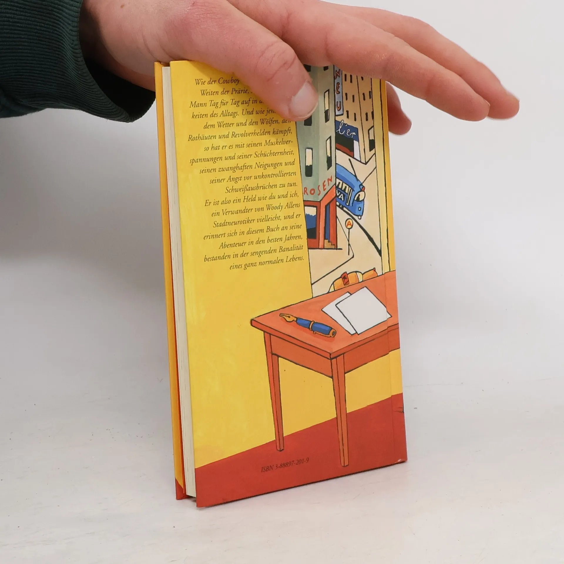 Wie der Cowboy hinausreitet in die Weiten der Prärie, so bricht unser Mann Tag für Tag auf in die Widrigkeiten des Alltags. Und wie jener mit dem Wetter und den Wölfen, den Rothäuten und Revolverhelden kämpft, so hat er es mit seinen Muskelverspannungen und seiner Schüchternheit, seinen zwanghaften Neigungen und seiner Angst vor unkontrollierten Schweißausbrüchen zu tun. Er ist also ein Held wie du und ich, ein Verwandter von Woody Allens Stadtneurotiker vielleicht, und er erinnert sich in diesem Buch an seine Abenteuer in den besten Jahren, bestanden in der sengenden Banalität eines ganz normalen Lebens.