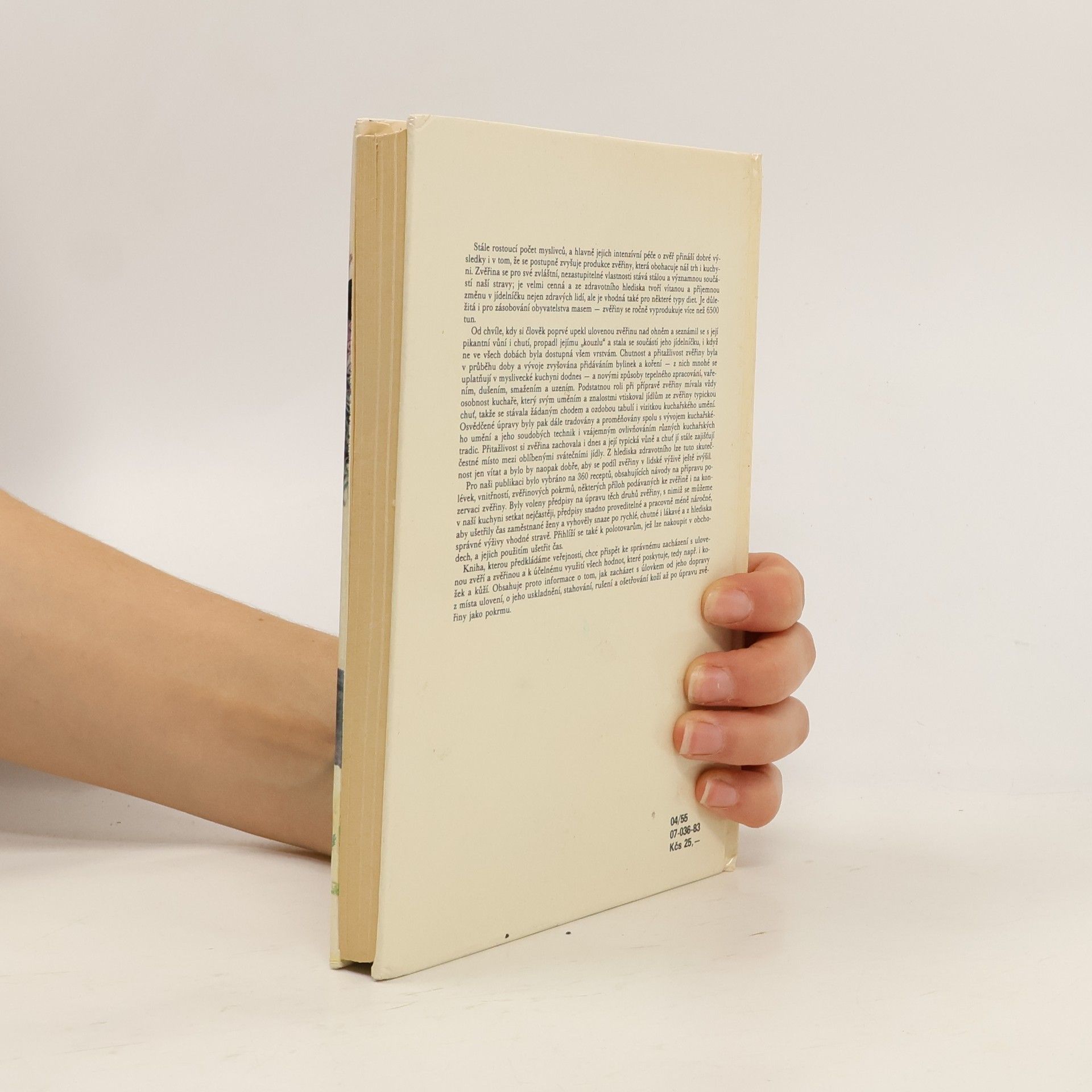 Pro publikaci bylo vybráno na 360 receptů, obsahujících návody na přípravu polévek, vnitřností, zvěřinových pokrmů, některých příloh podávaných ke zvěřině i na konzervaci zvěřiny. Byly voleny předpisy na úpravu těch druhů zvěřiny, s nimiž se můžeme v naší kuchyni setkat nejčastěji, předpisy snadno proveditelné a pracovně méně náročné, aby ušetřily čas zaměstnané ženy a vyhověly snaze po rychlé, chutné i lákavé a z hlediska správné výživy vhodné stravě. Přihlíží se také k polotovarům, jež lze nakoupit v obchodech, a jejich použitím ušetřit čas. Kniha chce přispět ke správnému zacházení s ulovenou zvěří a zvěřinou a k účelnému využití všech hodnot, které poskytuje, tedy např. i kožek a kůží. Obsahuje proto informace o tom, jak zacházet s úlovkem od jeho dopravy z místa ulovení, o jeho uskladnění, rušení a ošetřování koží až po úpravu zvěřiny jako pokrmu.