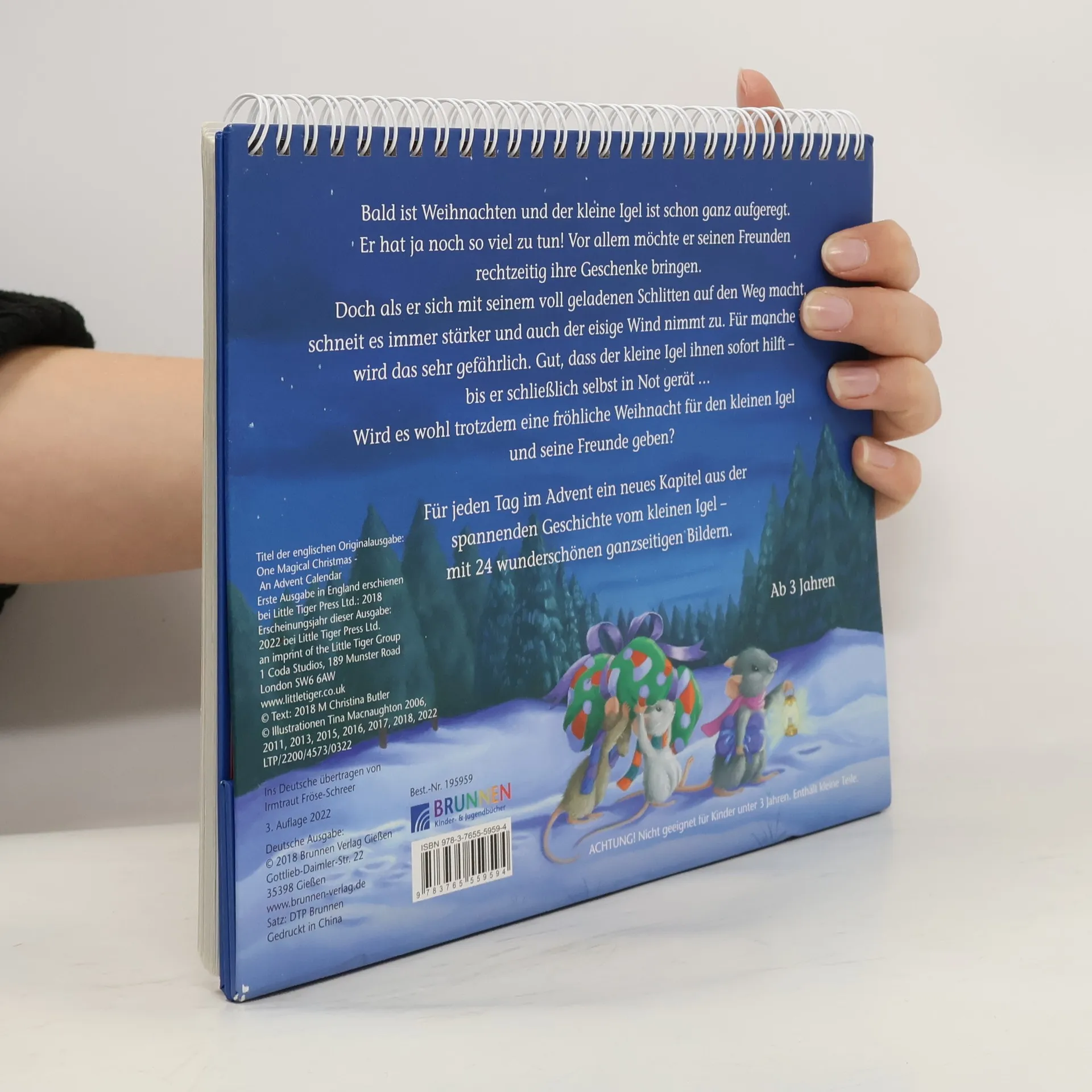 Bald ist Weihnachten und der kleine Igel ist schon ganz aufgeregt. Er hat ja noch so viel zu tun! Vor allem möchte er seinen Freunden rechtzeitig ihre Geschenke bringen. Doch als er sich mit seinem schwer beladenen Schlitten auf den Weg macht, schneit es immer stärker und auch der eisige Wind nimmt zu. Für manche Tiere wird das sehr gefährlich. Gut, dass der kleine Igel ihnen sofort hilft. Doch dann gerät er selbst in Not ... Wird es wohl trotzdem eine fröhliche Weihnacht für den kleinen Igel und seine Freunde geben? Für Kinder ab 3 Jahren.