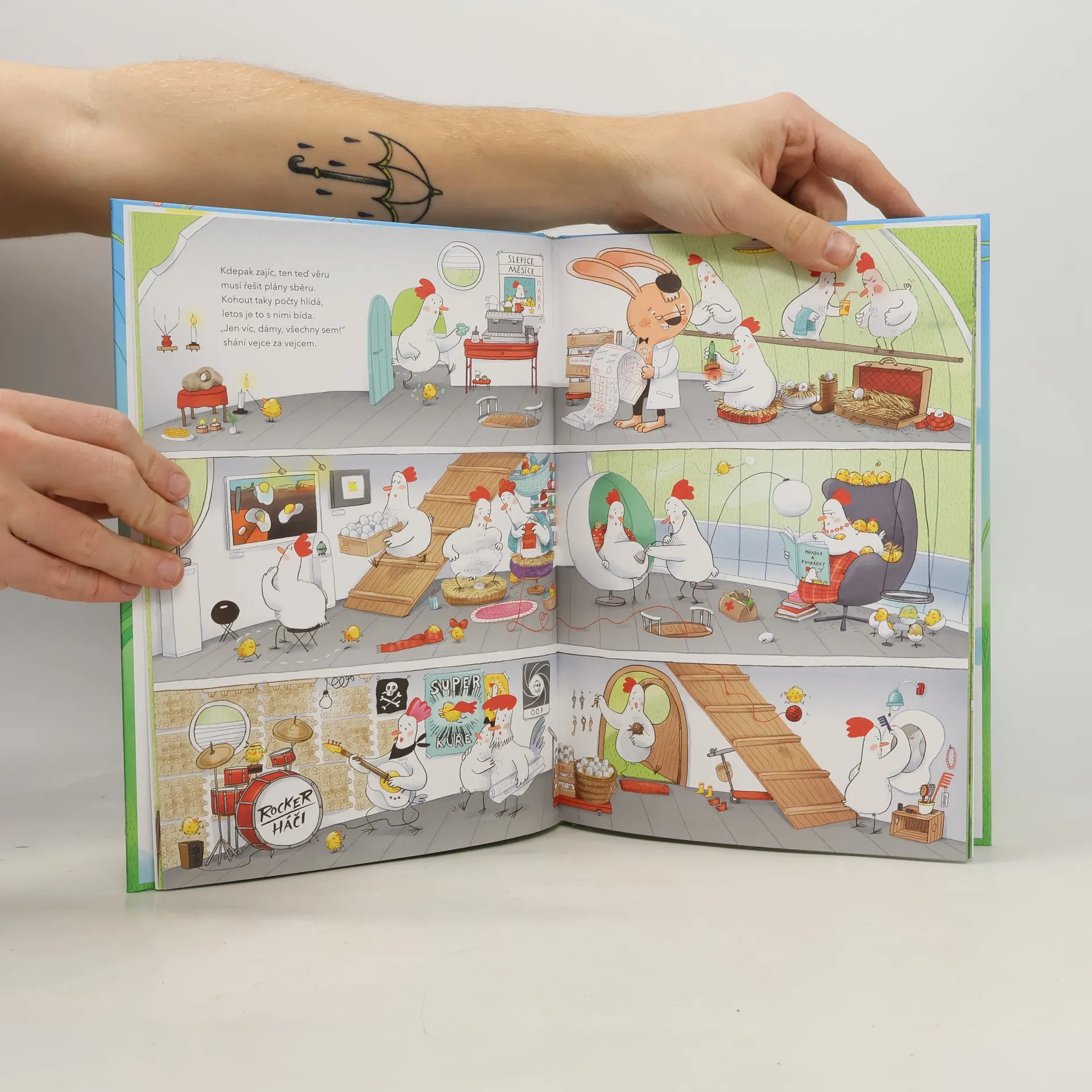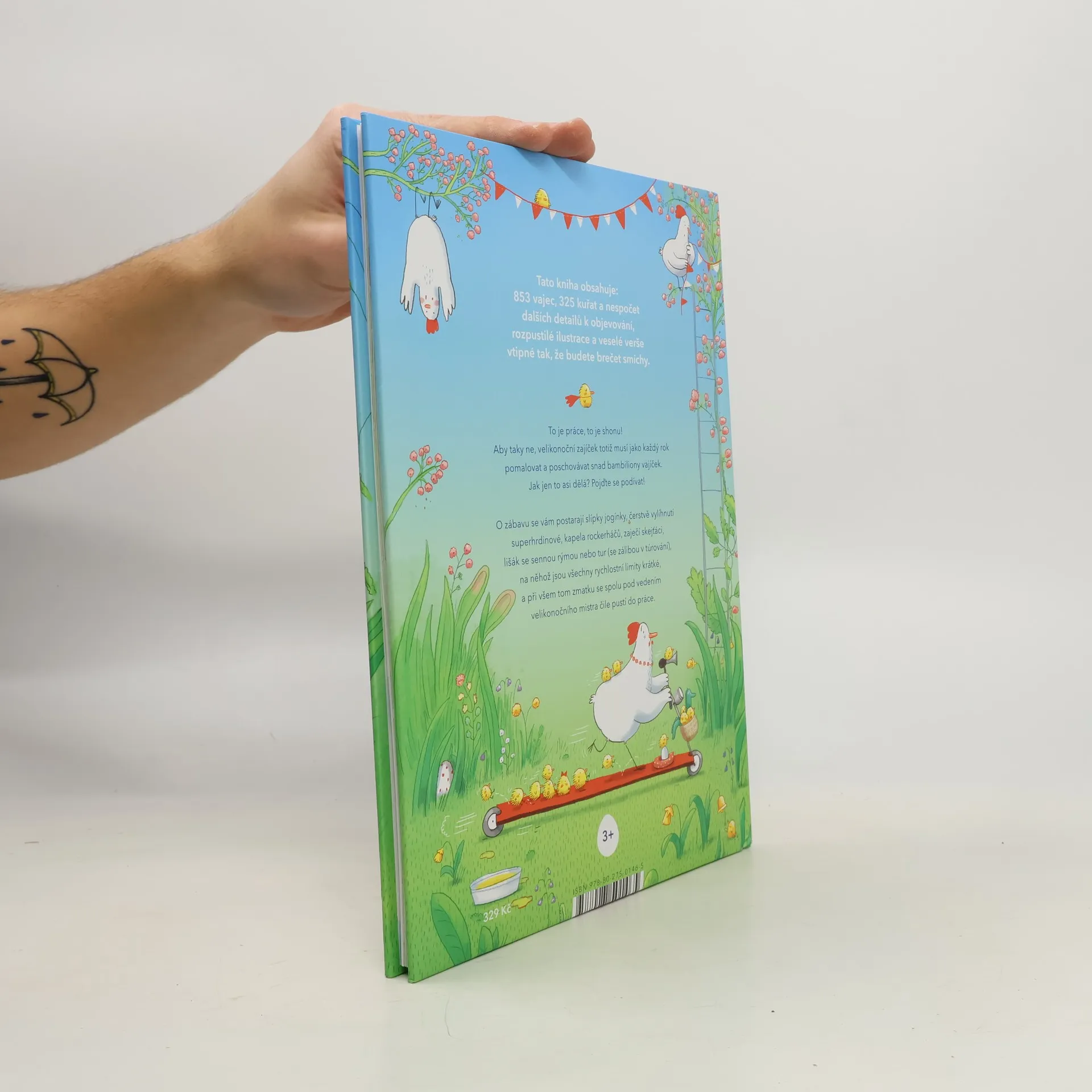 To je práce, to je shonu! Aby taky ne, velikonoční zajíček totiž musí jako každý rok pomalovat a poschovávat snad bambiliony vajíček. Jak jen to asi dělá? Jednoduše: má na to spoustu pomocnic a pomocníků. Čekáte snad kvočny na idylickém statku? Chyba lávky! Dneska už je všechno jinak. Slípky ve vile Na Kukani cvičí jógu, odpočívají při pletení a předhánějí se v soutěži o titul Slepice měsíce. A na malování vajíček už dávno nestačí štětec a barvy. V oddělení módního designu firmy Z.A.J.D.A. se vyvíjejí nové metody zdobení a najímají nové posily. Veselé ilustrace plné legračních detailů a komických scének skvěle doplňují vtipné verše: jedno i druhé spolu dokonale ladí a obojí zaručeně rozesměje malé i velké.