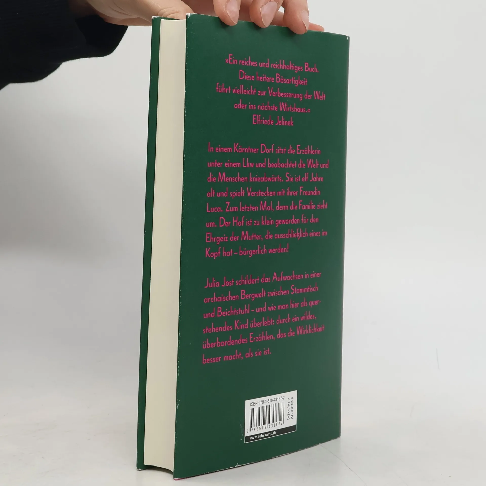 »Ein reiches und reichhaltiges Buch. Diese heitere Bösartigkeit führt vielleicht zur Verbesserung der Welt oder ins nächste Wirtshaus.« Elfriede Jelinek Es ist das Jahr 1994. In einem Kärntner Dorf am Fuß der Karawanken sitzt die Erzählerin unter einem Lkw und beobachtet die Welt und die Menschen knieabwärts. Sie ist elf Jahre alt und spielt Verstecken mit ihrer Freundin Luca aus Bosnien. Zum letzten Mal, denn die Familie zieht um. Der Hof ist zu klein geworden für den Ehrgeiz der Mutter, die ausschließlich eines im Kopf hat – bürgerlich werden! Nach und nach treffen immer mehr Nachbarsleute ein, um beim Umzug zu helfen, und das Kind in seinem Versteck beginnt zu erzählen: von seiner Angst, im Katzlteich ertränkt zu werden, weil es kurze Haare hat. Weil es Bubenjeans trägt. Weil es heimlich in Luca verliebt ist. Dabei ist sie nicht die Einzige, die etwas verbergen muss. Sie kennt Geschichten über die Ankommenden, die in tiefe Abgründe blicken lassen und doch auch Mitgefühl wecken. Julia Jost schildert in ihrem Debütroman das Aufwachsen in einer archaischen Bergwelt zwischen Stammtisch und Beichtstuhl – und wie man hier als querstehendes Kind überlebt und sich der vorgegebenen Ordnung widersetzt: dank einer zärtlichen Freundschaft und durch ein wildes, überbordendes Erzählen, das die Wirklichkeit besser macht, als sie ist.