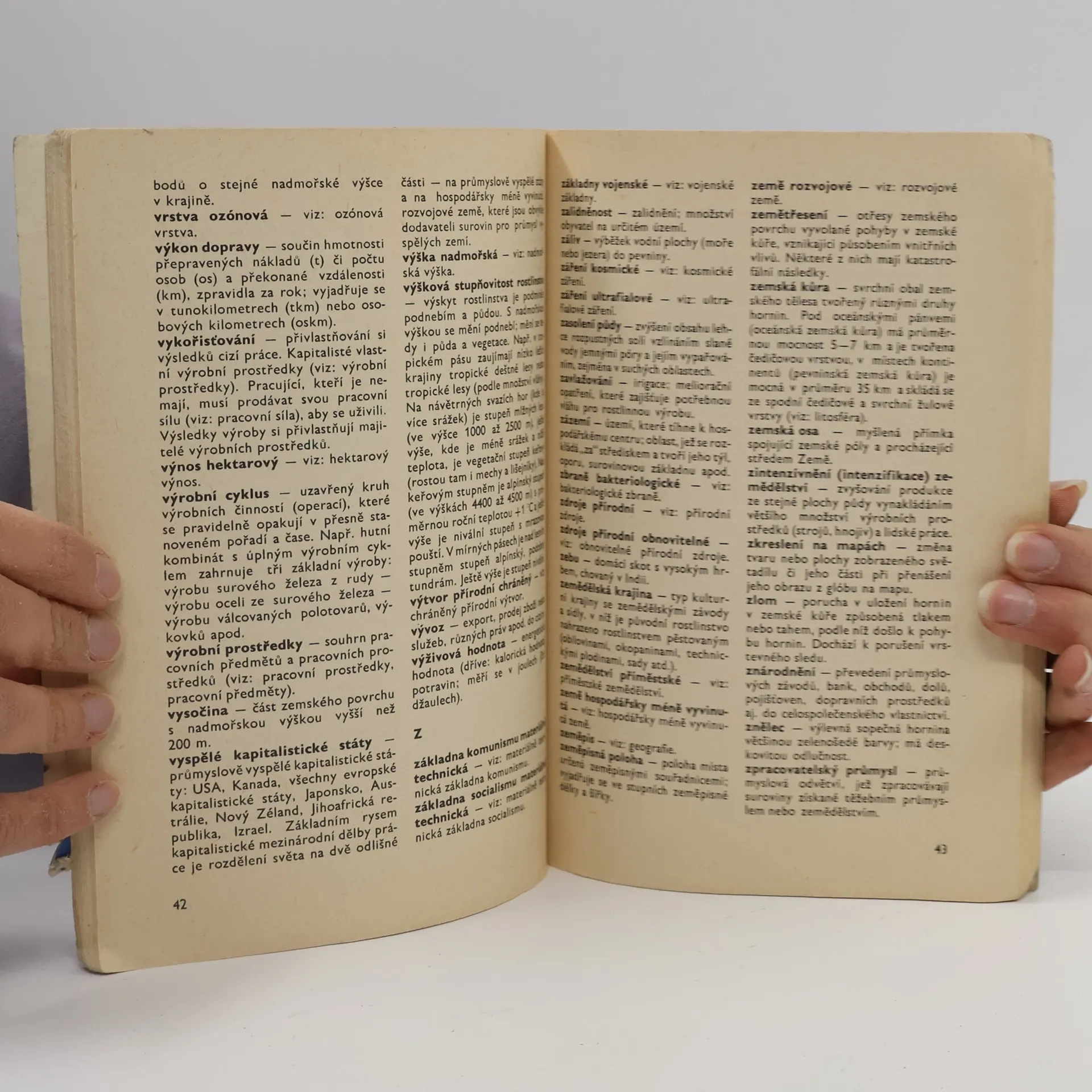 Kniha se hodí k učebnicím zeměpisu pro 5.-8. ročník základní školy. Slovníček obsahuje pojmy, které se vyskytují v učebnicích, a tyto pojmy vysvětluje /např. azimut, cyklón, OPEC, sultanát, nivelace, žďáření, mestic, konurbace, kasta...). Připojeny jsou v knize také tabulky s číselnýmiúdaji (např. rozloha kontinentů, rozloha států, obyvatelstvo, výška pohoří, státy a jejich hlavní města, data získání samostatnosti, produkce...).