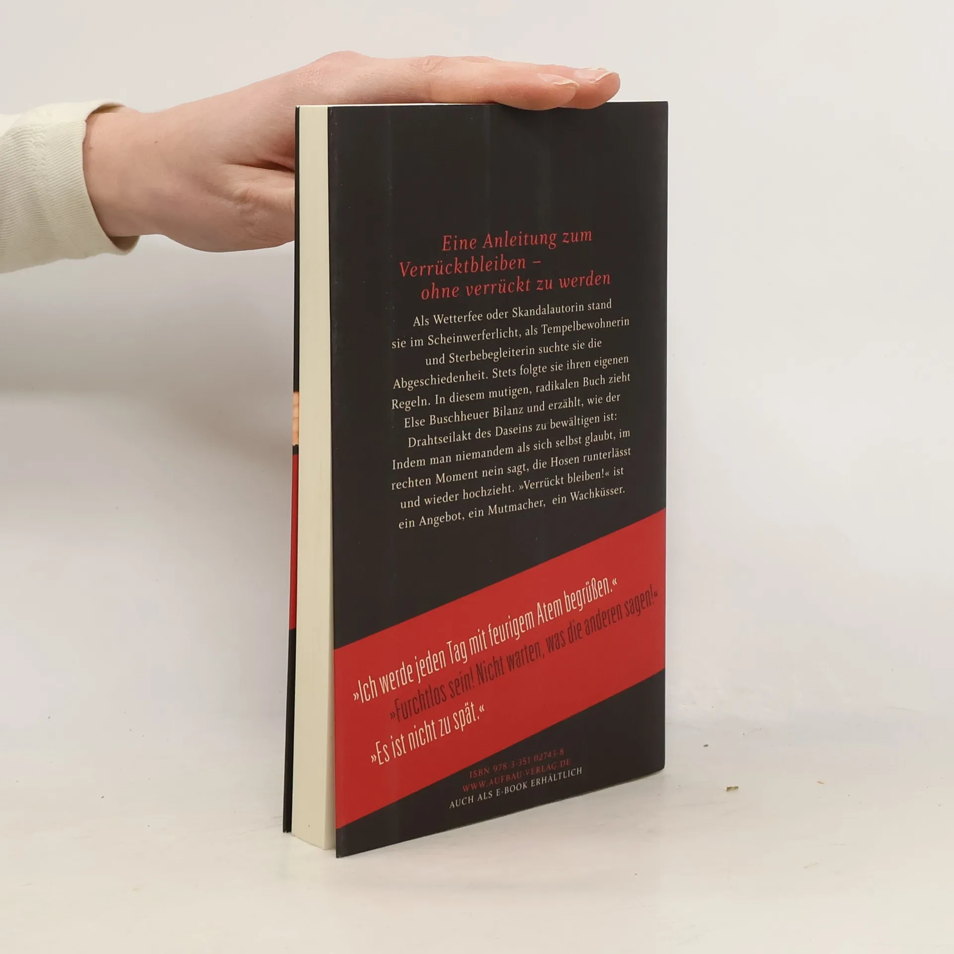 'Verrückt bleiben!' ist ein autobiographischer Ratgeber, ein sehr persönliches Buch, das den Leser an Else Buschheuers Schicksal teilhaben lässt. Naseweis und weise erklärt sie uns, wie der Drahtseilakt Leben zu bewältigen sei: Indem man selber denkt, sich von seinen Besitztümern befreit, hinfällt, wieder aufsteht, niemandem als sich selbst glaubt, im rechten Moment nein sagt, die Hosen runterlässt und wieder hochzieht. Ihr Buch ist ein Pamphlet wider die Lebensplanung, eine Ode an die Unzulänglichkeit, ein Mutmacher, ein Wachküsser, eine Anleitung zum Verrücktbleiben - ohne verrückt zu werden.