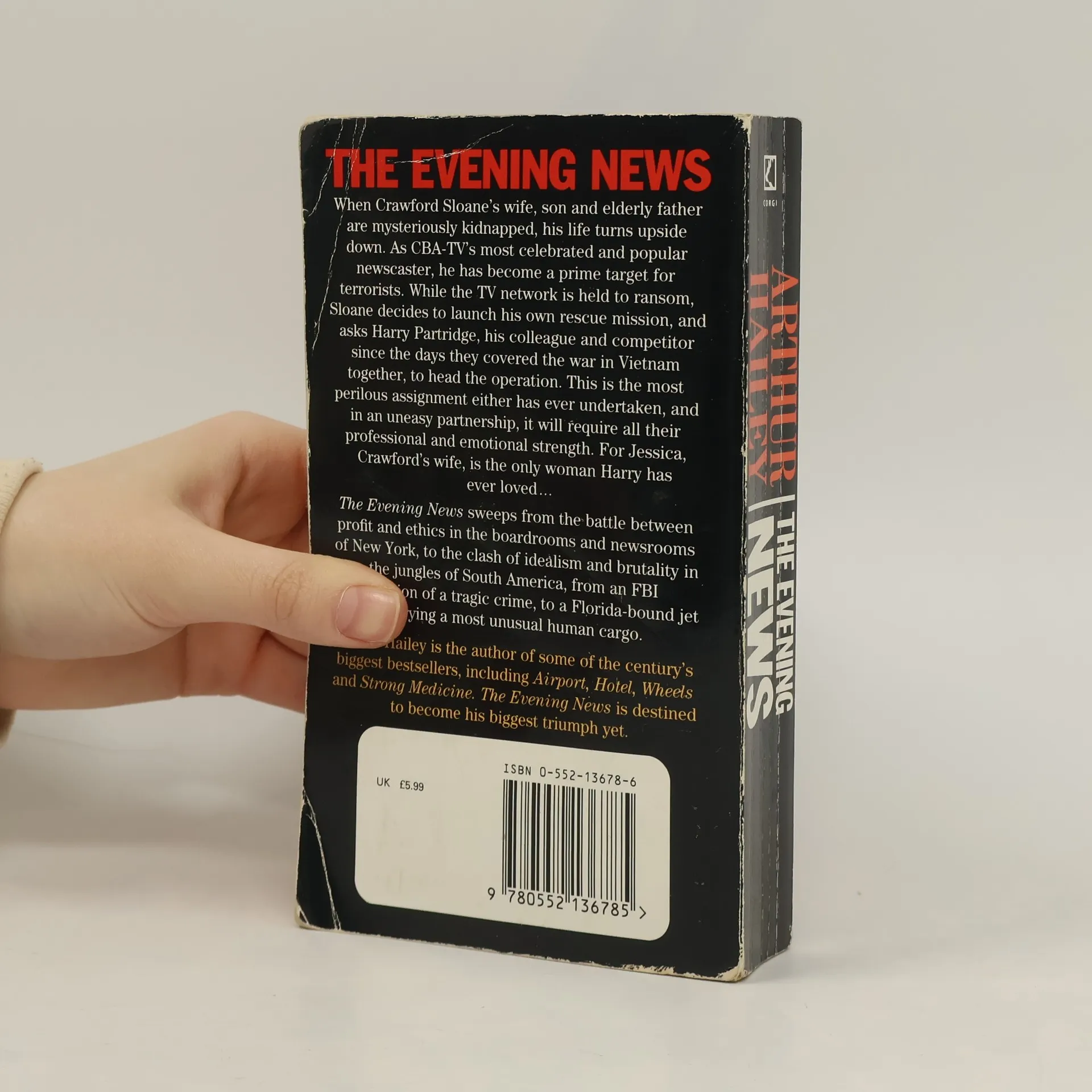 A newscaster's wife, son and father are kidnapped by terrorists and his TV network is held to ransom. The action moves from New York to the South American jungles and from an FBI investigation to a Florida-bound jet carrying a highly unusual cargo. The author also wrote Airport and Hotel.