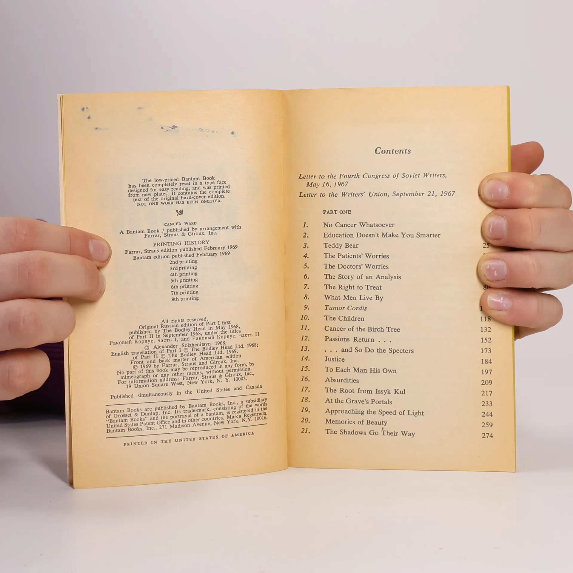 Cancer Ward examines the relationship of a group of people in the cancer ward of a provincial Soviet hospital in 1955, two years after Stalin's death. We see them under normal circumstances, and also reexamined at the eleventh hour of illness. Together they represent a remarkable cross-section of contemporary Russian characters and attitudes. The experiences of the central character, Oleg Kostoglotov, closely reflect the author's own: Solzhenitsyn himself became a patient in a cancer ward in the mid-1950s, on his release from a labor camp, and later recovered. Translated by Nicholas Bethell and David Burg.