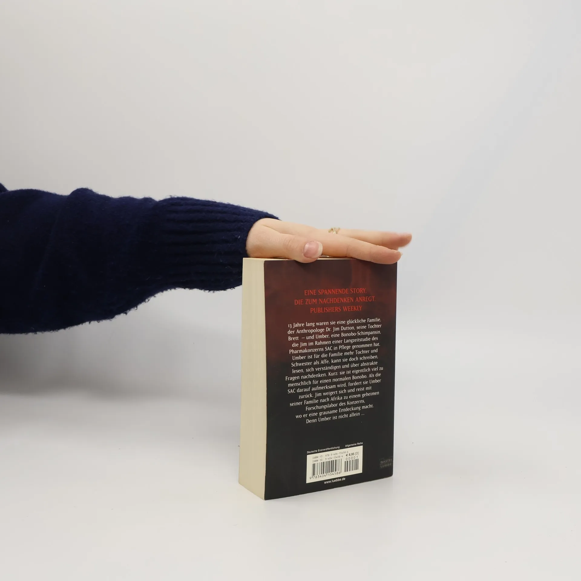 13 Jahre lang waren sie eine glückliche Familie: der Anthropologe Dr. Jim Dutton, seine Tochter Brett - und Umber, eine Bonobo-Schimpansin, die Jim im Rahmen einer Langzeitstudie des Pharmaziegiganten SAC in Pflege genommen hat. Umber ist für die Familie mehr Tochter und Schwester als Affe, kann sie doch schreiben, lesen, sich verständigen und über abstrakte Fragen nachdenken. Kurz: sie ist eigentlich viel zu menschlich für einen normalen Bonobo. Als die SAC darauf aufmerksam wird, fordert sie Umber zurück. Jim weigert sich und reist mit seiner Familie nach Afrika zu einem geheimen Forschungslabor des Konzerns, wo er eine grausame Entdeckung macht. Denn Umber ist nicht allein ...