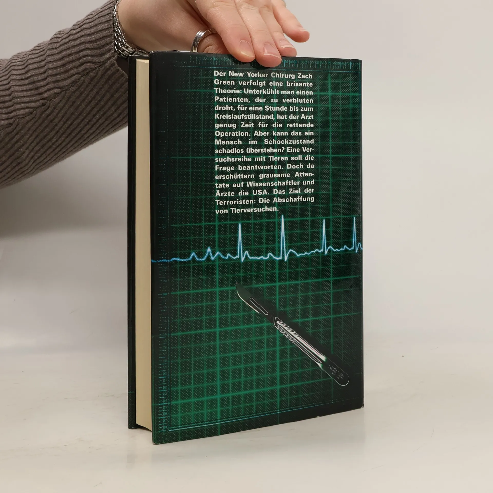 Zach Green ist ein erfahrener Unfallchirurg und leitet das größte Unfallkrankenhaus New Yorks. Er versucht, jeden Patienten zu retten, doch auch seine ärztliche Kunst versagt häufig bei starken Blutungen. Nur eine Möglichkeit bleibt: den Verletzten zu unterkühlen, um Zeit zu gewinnen für die rettende Operation. Doch kann ein Mensch im Schockzustand eine Stunde scheintot ohne Schäden überleben? Tierversuche sollen es zeigen. Doch da erschüttert eine Reihe grausamer Attentate die USA: Eine Gruppe von Tierrechtlern ermordet Wissenschaftler, überfällt Tierversuchslabore. Als Zach und sein bester Freund, der Chirurg Glen Brinkman im Fernsehen Tierversuche verteidigen, geraten sie ins Visier der Attentäter.§Brisante Themen, starke Charaktere, schnelle Dialoge - eine Höchstdosis, die einem das Blut in den Adern gefrieren lassen.§