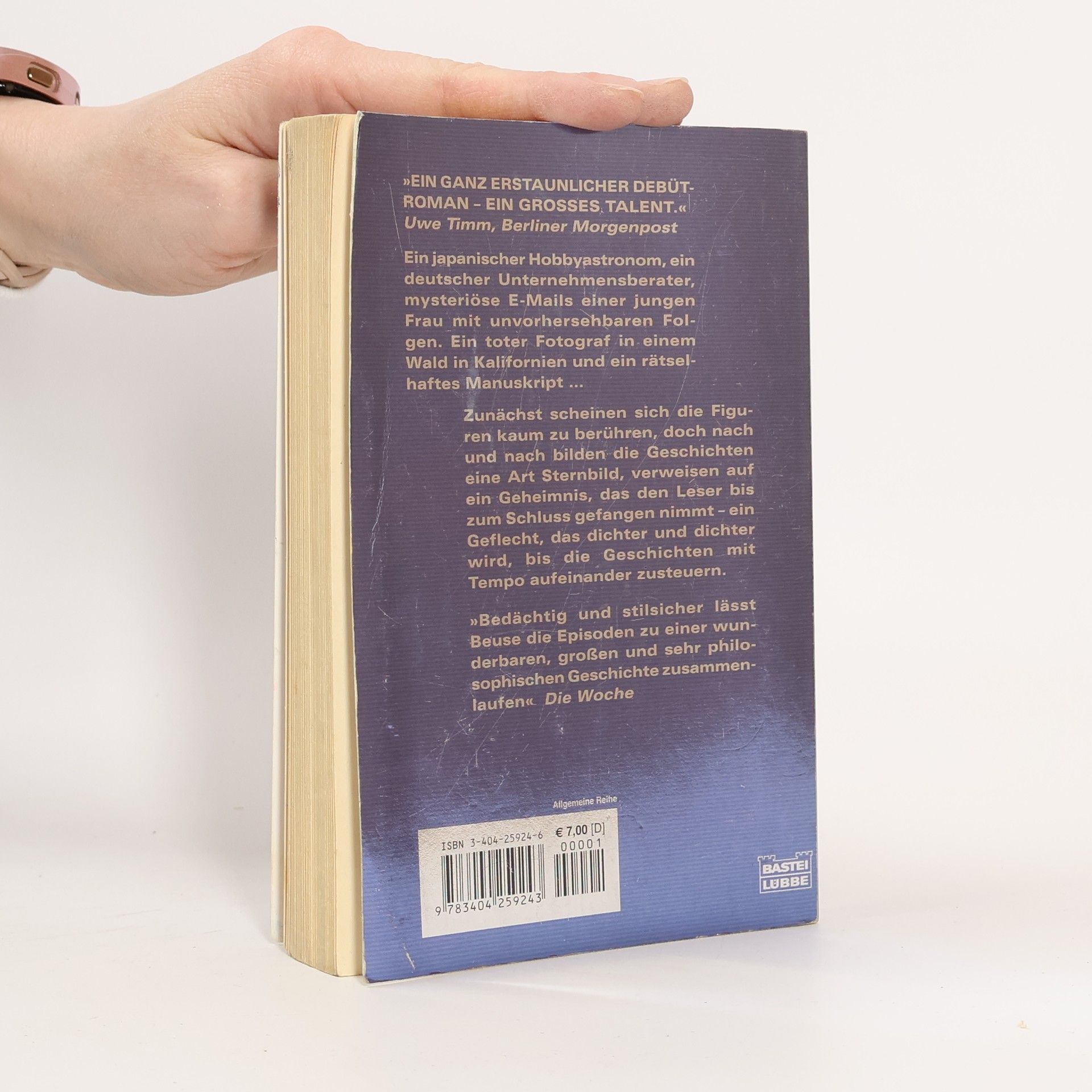 Während der japanische Hobbyastronom Hyakutake nachts auf einem Berg einen bis dahin unbekannten Kometen entdeckt, bereitet sich in einem anderen Teil der Welt der Unternehmensberater Jakob Leitner auf einen Empfang vor. Marie Lorenzo, die Freundin seiner Mitarbeiterin Kyra, schreibt E-mails nach Amerika mit merkwürdigen Fragen und unvorhersehbaren Folgen. Dann betritt sie im Internet den erotischen chatroom "Paradies" und verabredet sich zu einem "Black Date" im Stadtpark. Ein allmählich erblindender Fotograf, der die Welt, die er verlieren wird, noch einmal manisch festhalten will, folgt dem Angebot eines unheimlichen Amerikaners, mit ihm in einem Wald in Kalifornien zu leben. Später entdecken die Empfänger von Maries E-mails den toten Fotografen in einer Waldhütte und finden ein Manuskript, das viele Fragen beantwortet und noch mehr aufwirft. In Stefan Beuses erstem Roman umkreist der poetische Text seine Figuren, die sich nur flüchtig berühren. "Kometen" bildet mit seine n Geschichten und Episoden ein Sternbild, das auf ein Geheimnis verweist, das den Leser bis zum Schluss in Bann hält. Ein zeitgemäßer, spannender und rätselhaft schöner Roman über die Liebe und die Leere, den Verlust und den mystischen Moment der Erkenntnis.
