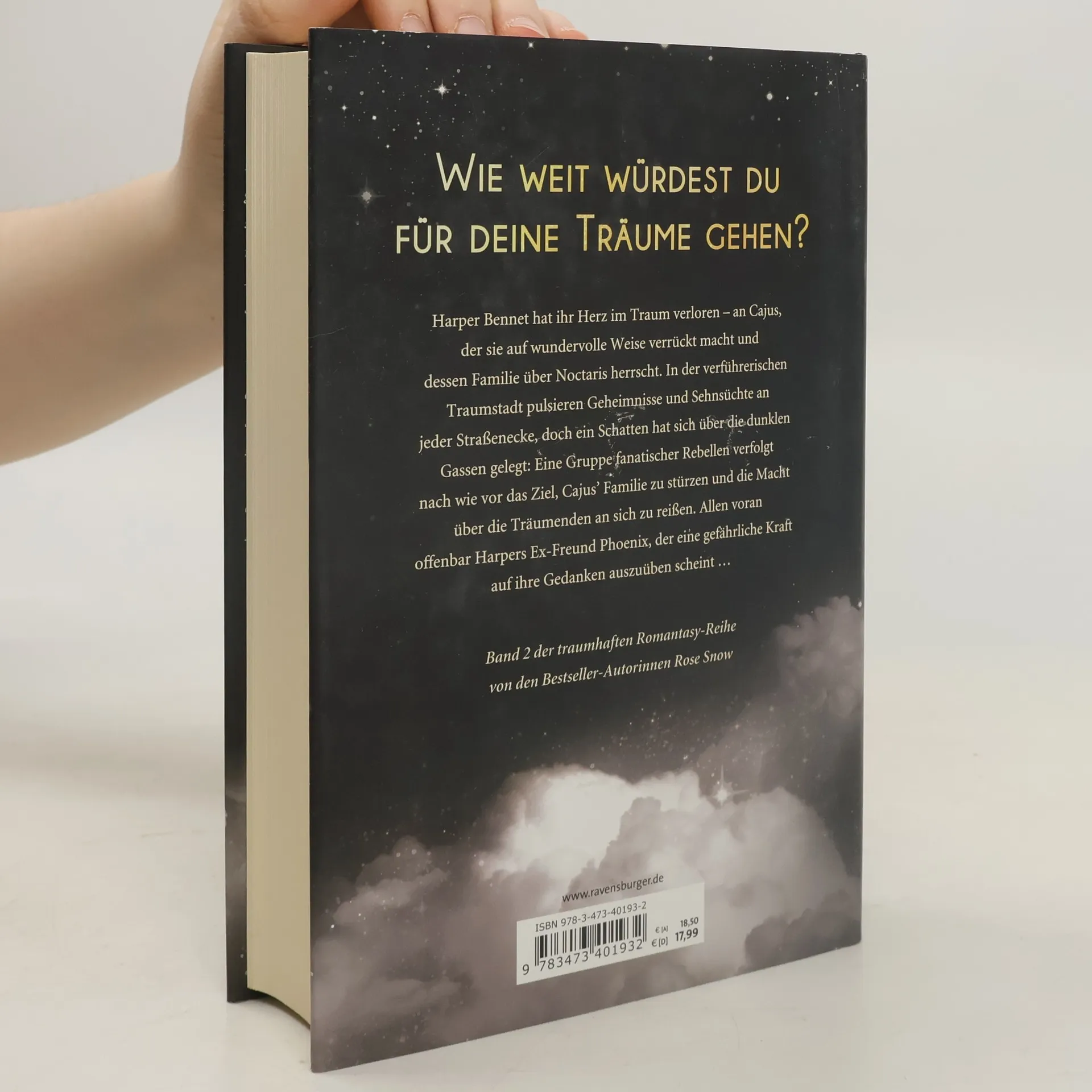 Wie weit würdest du für deine Träume gehen? Harper Bennet hat ihr Herz im Traum verloren – an Cajus, der sie auf wundervolle Weise verrückt macht und dessen Familie über Noctaris herrscht. In der Traumstadt pulsieren Geheimnisse und Sehnsüchte an jeder Straßenecke, doch ein Schatten hat sich über die Gassen gelegt: Eine Gruppe fanatischer Rebellen verfolgt nach wie vor das Ziel, die Macht über die Träumenden an sich zu reißen. Allen voran offenbar Harpers Ex-Freund Phoenix, der eine gefährliche Kraft auf ihre Gedanken auszuüben scheint … Band 2 der traumhaften Romantasy-Reihe von den Bestseller-Autorinnen Rose Snow *** Leseprobe *** „Es wird alles gut, Bennet.“ Seine geflüsterten Worte sollen mich trösten, tun sie aber nicht. Still und ungefragt beginnen meine Tränen zu fließen, tropfen in den Kragen seines Hemdes, wo sie den grünen Stoff durchnässen.„Ich liebe dich“, hauche ich erstickt. Ein Teil von mir hofft gegen jede Vernunft, dass er irgendeinen Plan hat. Dass unsere Situation nicht ganz so aussichtslos ist, wie sie gerade wirkt. Doch Cajus küsst mich einfach nur sanft auf den Hals. Und es fühlt sich nach einem Abschied an.