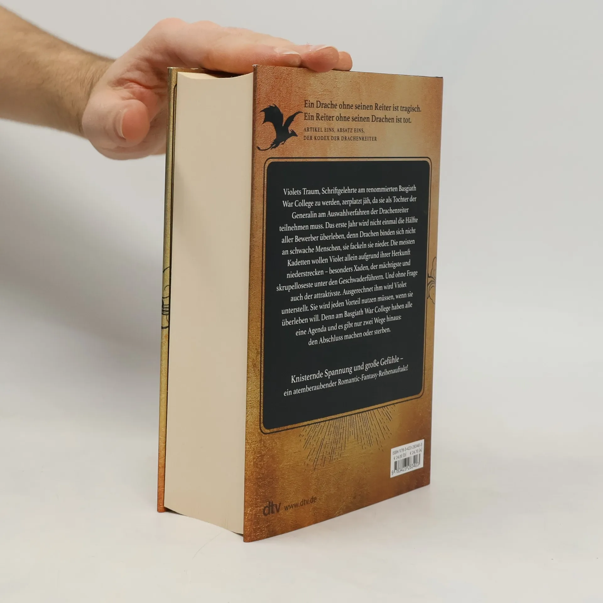 Ein Drache ohne seinen Reiter ist tragisch. Ein Reiter ohne seinen Drachen ist tot. In wunderschöner, hochwertiger Ausstattung mit aufwendig veredeltem Schutzumschlag, gestaltetem Einband und farbigen Karten im Innenteil. Knisternde Spannung und große Gefühle – ein atemberaubender Romantic-Fantasy-Reihenauftakt! Perfekt für alle Fans von Jennifer L. Armentrout, Naomi Novik und Sarah J. Maas. Violets Traum, Schriftgelehrte am renommierten Basgiath War College zu werden, zerplatzt jäh, da sie als Tochter der Generalin am Auswahlverfahren der Drachenreiter teilnehmen muss. Das erste Jahr wird nicht einmal die Hälfte aller Bewerber überleben, denn Drachen binden keine schwachen Menschen, sie fackeln sie nieder. Die meisten Kadetten wollen Violet allein aufgrund ihrer Herkunft niederstrecken – besonders Xaden, der mächtigste und skrupelloseste unter den Geschwaderführern. Und ohne Frage auch der attraktivste. Ausgerechnet ihm wird Violet unterstellt. Sie wird jeden Vorteil nutzen müssen, wenn sie überleben will. Denn am Basgiath War College haben alle eine Agenda und es gibt nur zwei Wege hinaus: den Abschluss machen oder sterben.