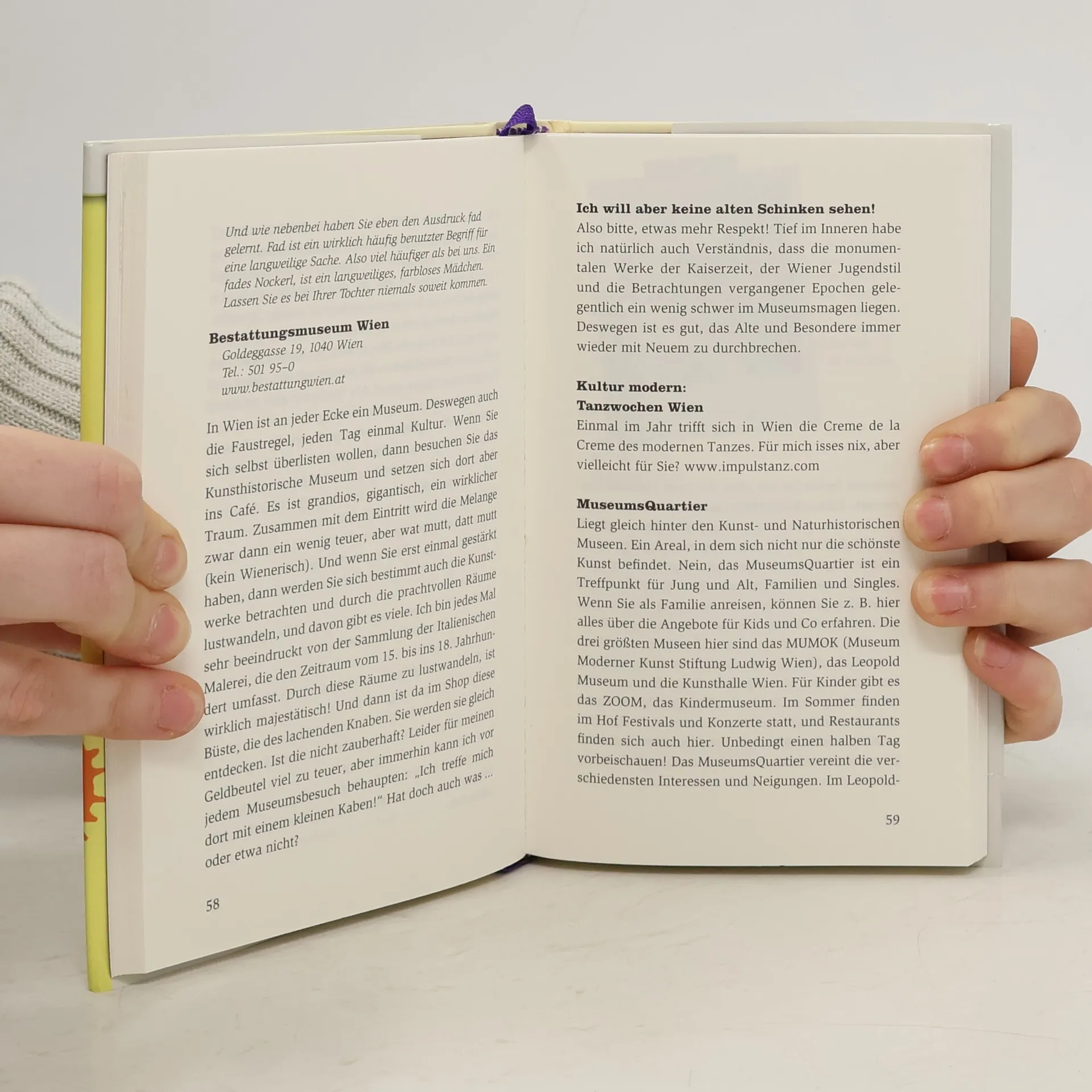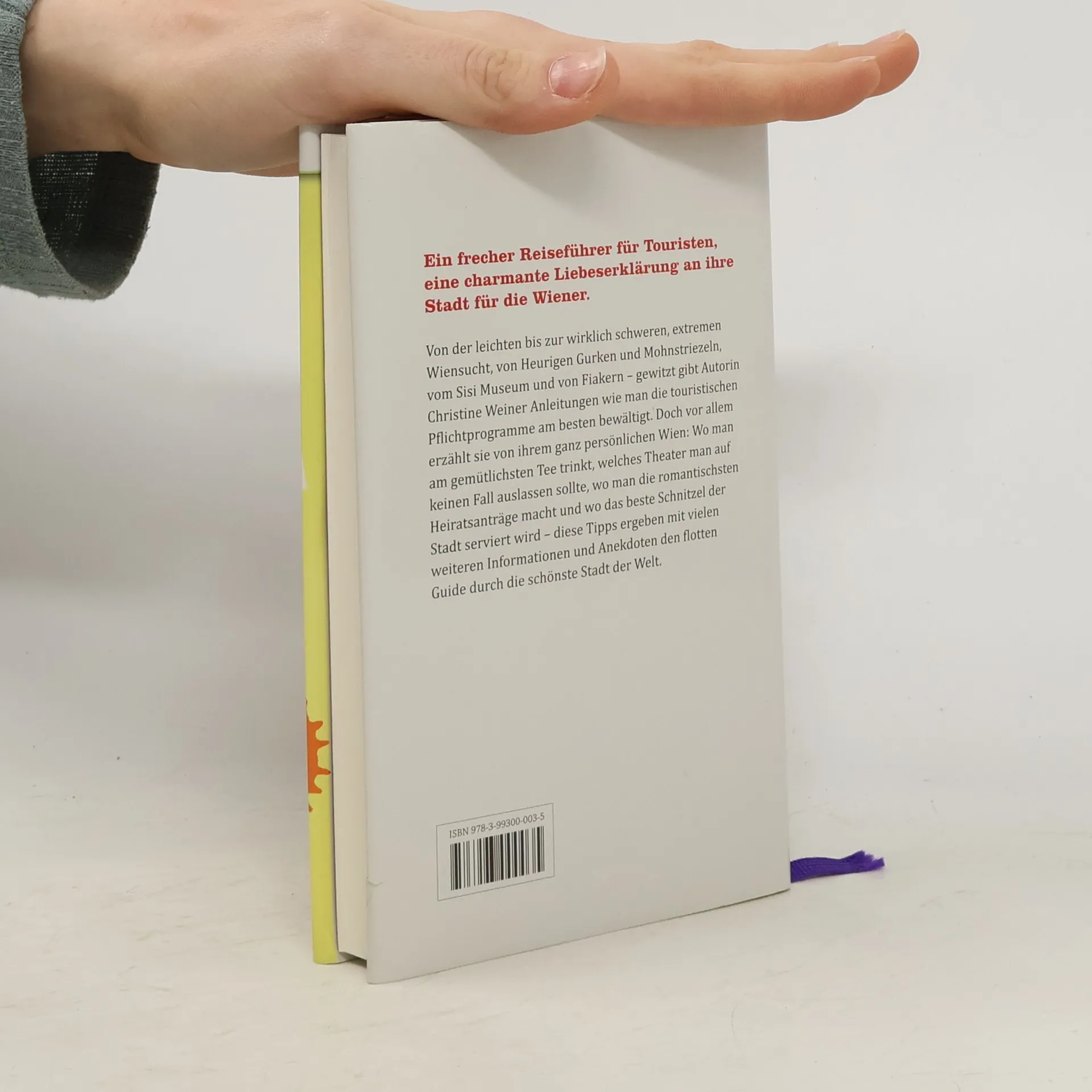 Christine Weiner hat sich in Wien verliebt. Vor über 20 Jahren ist sie zum ersten Mal gekommen, und seither lässt sie die Stadt nicht mehrlos. Längst ist aus der deutschen Touristin eine ständige Besucherin geworden, im Laufe der Zeit haben sich dabei interessante Beobachtungen und spannende Geschichten angesammelt. Neben dem touristischen Pflichtprogramm erforscht Christine Weiner die traditionellen, aber auch die schrägen Seiten der Stadt und gibt sie auf charmante und amüsante Weise zum Besten. Herausgekommen ist dabei kein gewöhnlicher Reiseführer, sondern ein Buch, das Wien und seine Bewohner mit all seinen Macken und Liebenswürdigkeiten vorstellt. - Schniek!