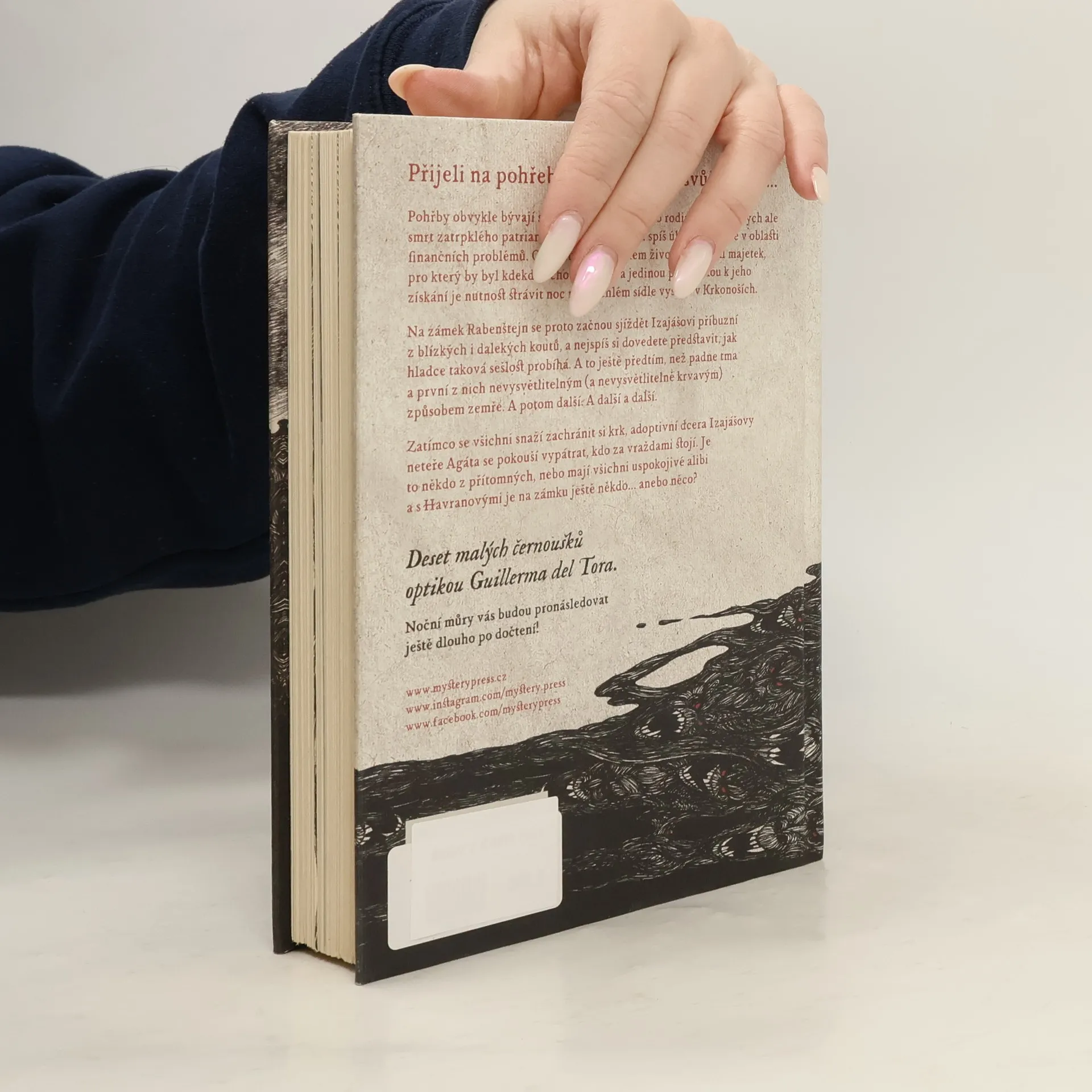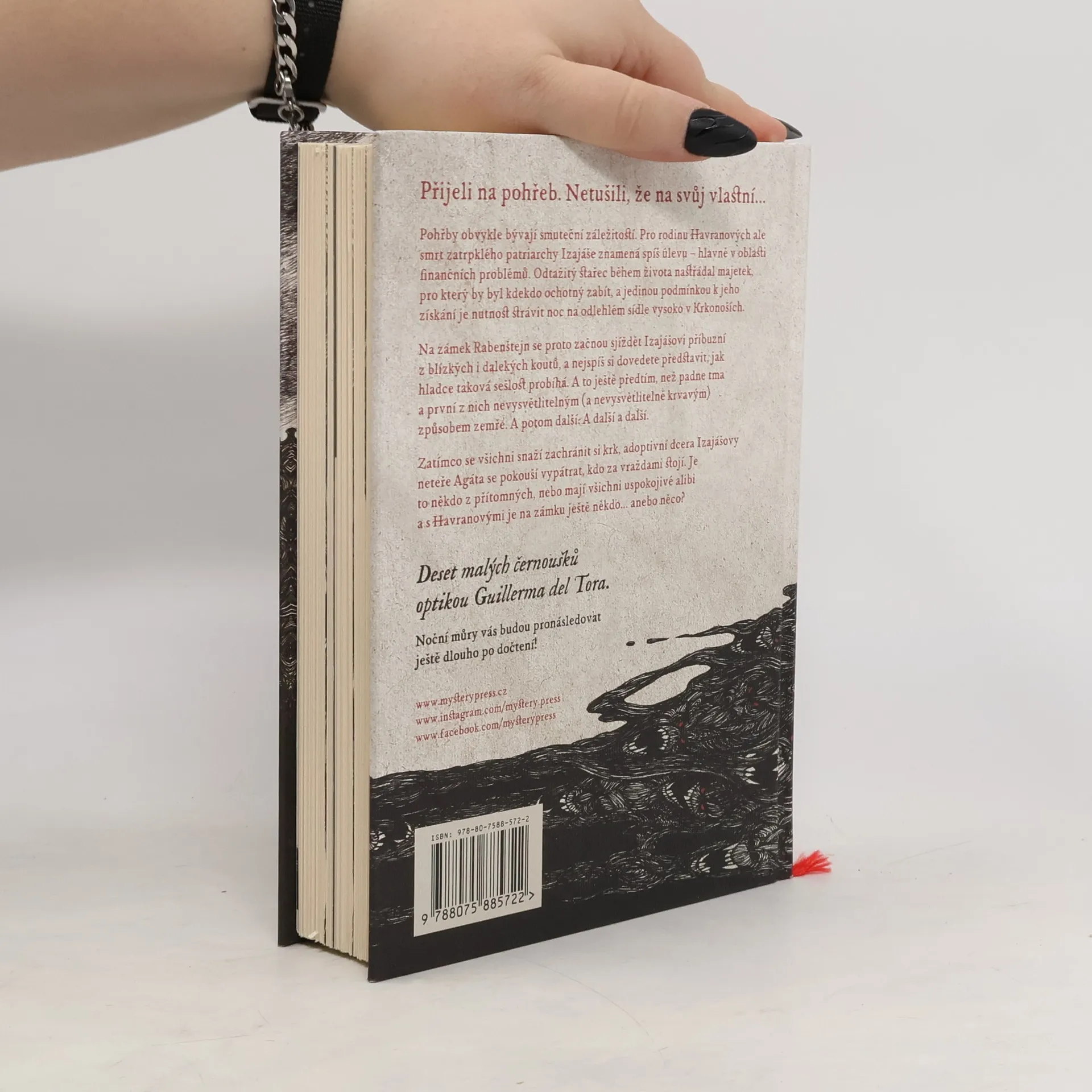 PŘIJELI NA POHŘEB. NETUŠILI, ŽE NA SVŮJ VLASTNÍ... Pohřby obvykle bývají smuteční záležitostí. Pro rodinu Havranových ale smrt zatrpklého patriarchy Izajáše znamená spíš úlevu – hlavně v oblasti finančních problémů. Odtažitý stařec během života nastřádal majetek, pro který by byl kdekdo ochotný zabít, a jedinou podmínkou k jeho získání je nutnost strávit noc na odlehlém sídle vysoko v Krkonoších. Na zámek Rabenštejn se proto začnou sjíždět Izajášovi příbuzní z blízkých i dalekých koutů, a nejspíš si dovedete představit, jak hladce taková sešlost probíhá. A to ještě předtím, než padne tma a první z nich nevysvětlitelným (a nevysvětlitelně krvavým) způsobem zemře. A potom další. A další a další. Zatímco se všichni snaží zachránit si krk, adoptivní dcera Izajášovy neteře Agáta se pokouší vypátrat, kdo za vraždami stojí. Je to někdo z přítomných a mají všechny logické vysvětlení, nebo je s Havranovými na zámku ještě někdo anebo něco? ____ Deset malých černoušků optikou Guillerma del Tora. Noční můry vás budou pronásledovat ještě dlouho po dočtení!