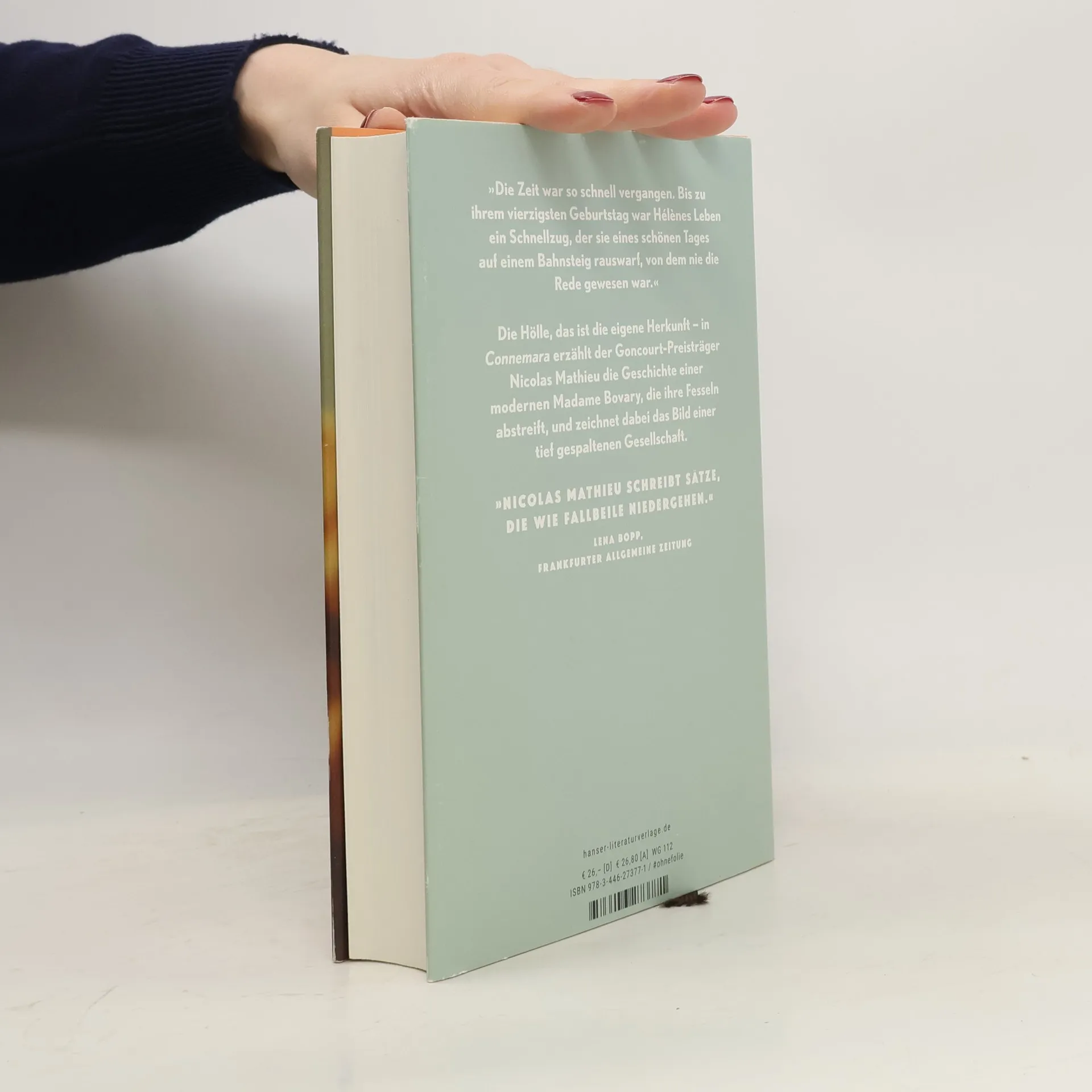 Nach dem Bestseller „Rose Royal“ schreibt Goncourt-Preisträger Nicolas Mathieu über eine moderne Madame Bovary, die ihre Fesseln abstreift. Hélène ist fast vierzig Jahre alt. Sie hat Karriere gemacht, geheiratet, zwei Töchter bekommen und lebt in einem Architektenhaus in der Nähe von Nancy. Sie hat sich den Traum ihrer Jugend erfüllt: abhauen, das Milieu wechseln, erfolgreich sein. Christophe hingegen hat die kleine Stadt im Osten Frankreichs, in dem er und Hélène aufgewachsen sind, nie verlassen. Er verkauft Hundefutter und führt ein unentschlossenes kleines Leben. Bis er Hélène wiedertrifft. „Connemara“ ist eine Geschichte über das tiefe Unbehagen der Klassenaufsteiger und über unsere moderne Arbeitswelt zwischen PowerPoint und Open Space. Es ist auch eine Geschichte über das Zittern in der Mitte des Lebens, und über die Sehnsucht, noch mal von vorne zu beginnen. Nur dass bei Nicolas Mathieu das Politische immer im Privaten verborgen liegt.