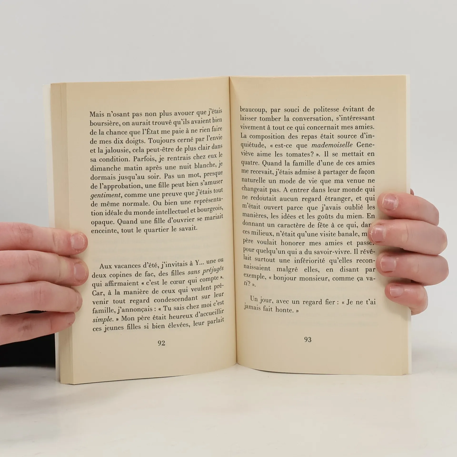 Il n'est jamais entré dans un musée, il ne lisait que Paris-Normandie et se servait de son Opinel pour manger. Ouvrier devenu petit commerçant, il espérait que sa fille, grâce aux études, serait mieux que lui. Cette fille, Annie Ernaux, refuse l'oubli des origines. Elle retrace la vie et la mort de celui qui avait conquis sa petite "place au soleil". Et dévoile aussi la distance, douloureuse, survenue entre elle, étudiante, et ce père aimé qui lui disait : "Les livres, la musique, c'est bon pour toi. Moi, je n'en ai pas besoin pour vivre." Ce récit dépouillé possède une dimension universelle.