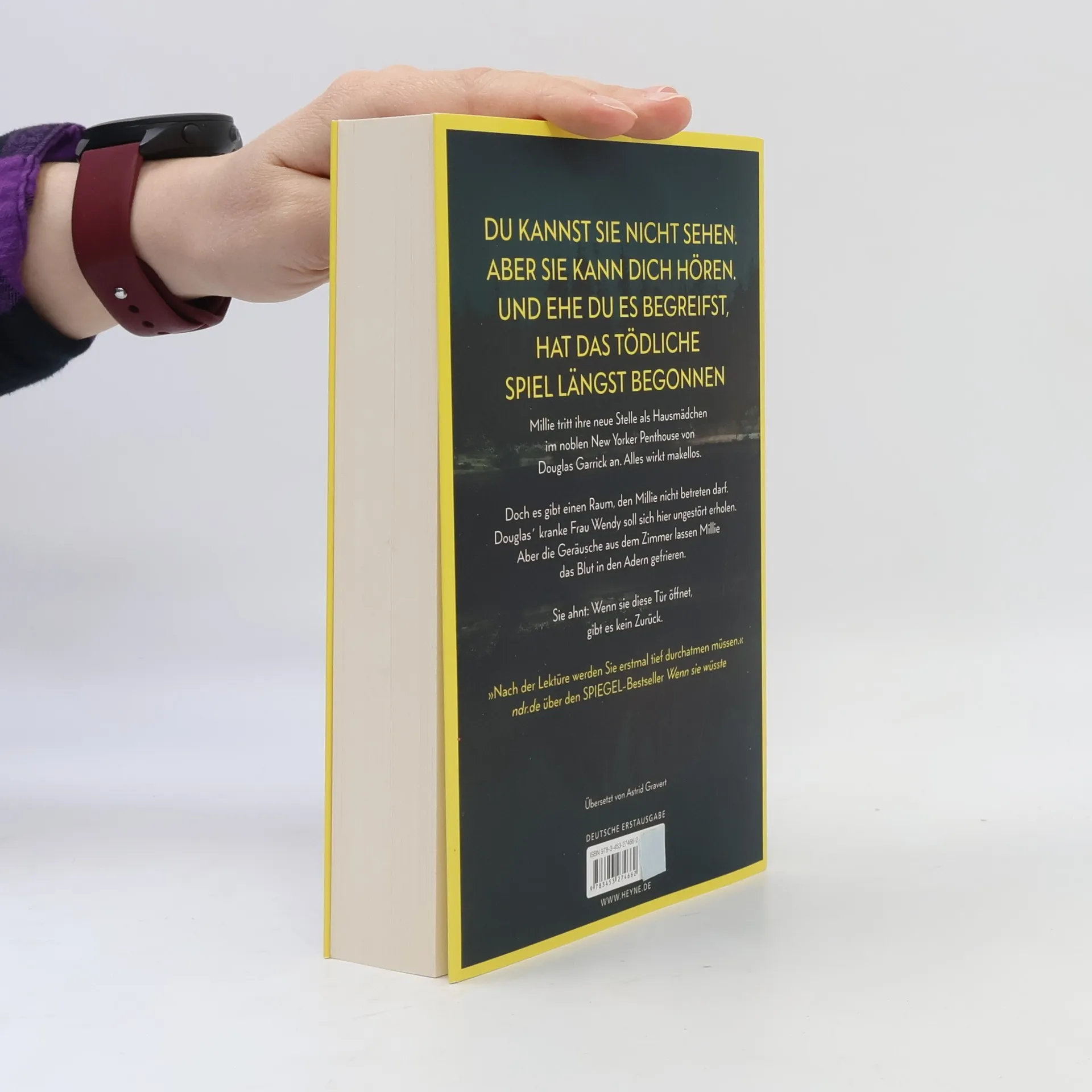 Du kannst sie nicht sehen. Aber sie kann dich hören. Und ehe du es begreifst, hat das tödliche Spiel längst begonnen Millie Calloway hat einen neuen Job. Um sich ihr Studium zu finanzieren, hilft sie einem reichen Paar aus Manhattan im Haushalt. Ihr Arbeitgeber Douglas Garrick wirkt nett, und zum Glück stellt er ihr nicht zu viele Fragen zu ihrer Vergangenheit. Doch warum darf Millie nicht mit seiner Frau Wendy sprechen? Was bedeuten das Weinen, das sie aus dem verschlossenen Zimmer hört, und die Blutflecke auf Wendys Kleidung? Ist Douglas in Wahrheit nicht der fürsorgliche Ehemann, der er vorgibt zu sein? Millie weiß nur eins: Sie muss Wendy helfen. Auch wenn sie damit riskiert, dass ihr dunkelstes Geheimnis doch noch ans Licht kommt.