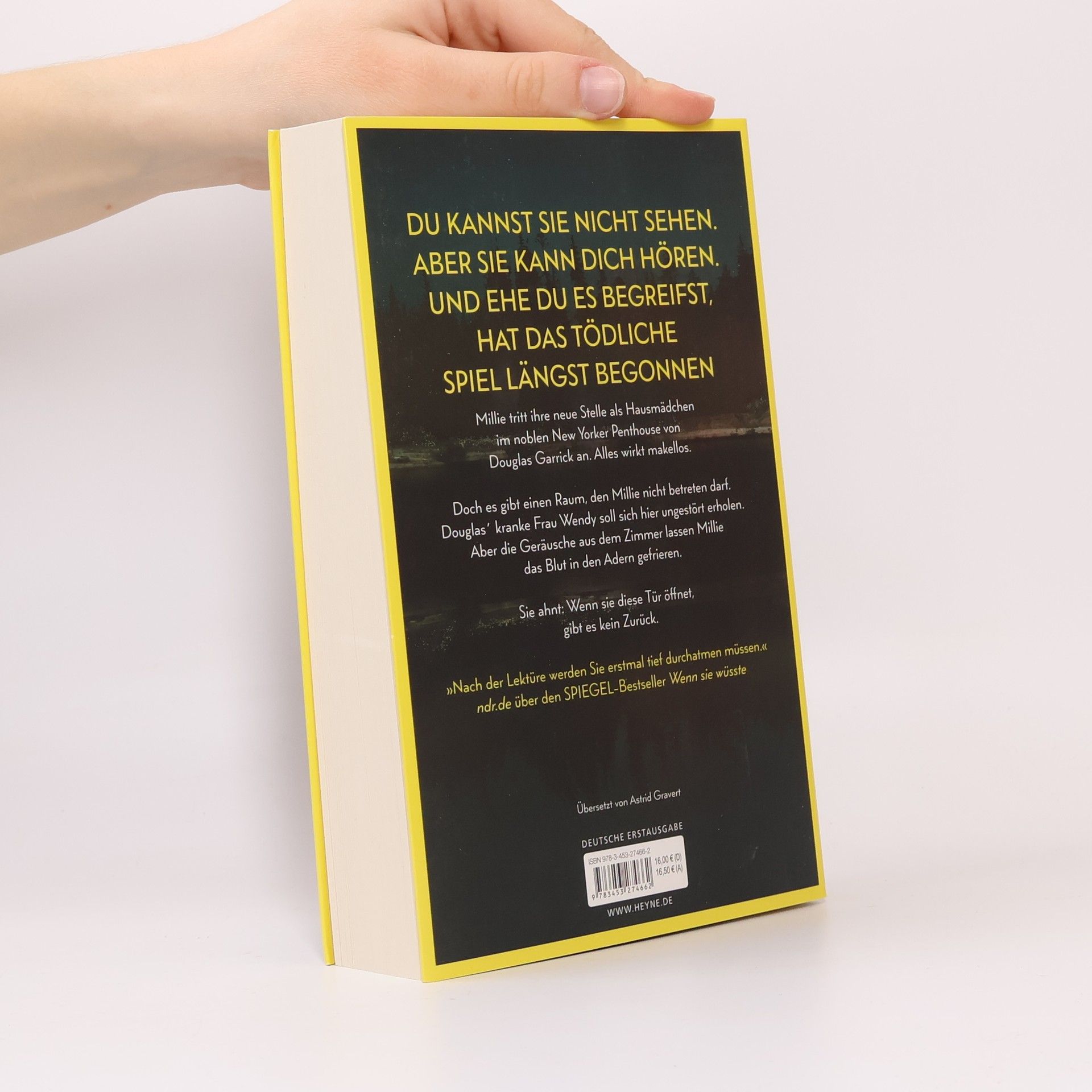 Du kannst sie nicht sehen. Aber sie kann dich hören. Und ehe du es begreifst, hat das tödliche Spiel längst begonnen Millie Calloway hat einen neuen Job. Um sich ihr Studium zu finanzieren, hilft sie einem reichen Paar aus Manhattan im Haushalt. Ihr Arbeitgeber Douglas Garrick wirkt nett, und zum Glück stellt er ihr nicht zu viele Fragen zu ihrer Vergangenheit. Doch warum darf Millie nicht mit seiner Frau Wendy sprechen? Was bedeuten das Weinen, das sie aus dem verschlossenen Zimmer hört, und die Blutflecke auf Wendys Kleidung? Ist Douglas in Wahrheit nicht der fürsorgliche Ehemann, der er vorgibt zu sein? Millie weiß nur eins: Sie muss Wendy helfen. Auch wenn sie damit riskiert, dass ihr dunkelstes Geheimnis doch noch ans Licht kommt.