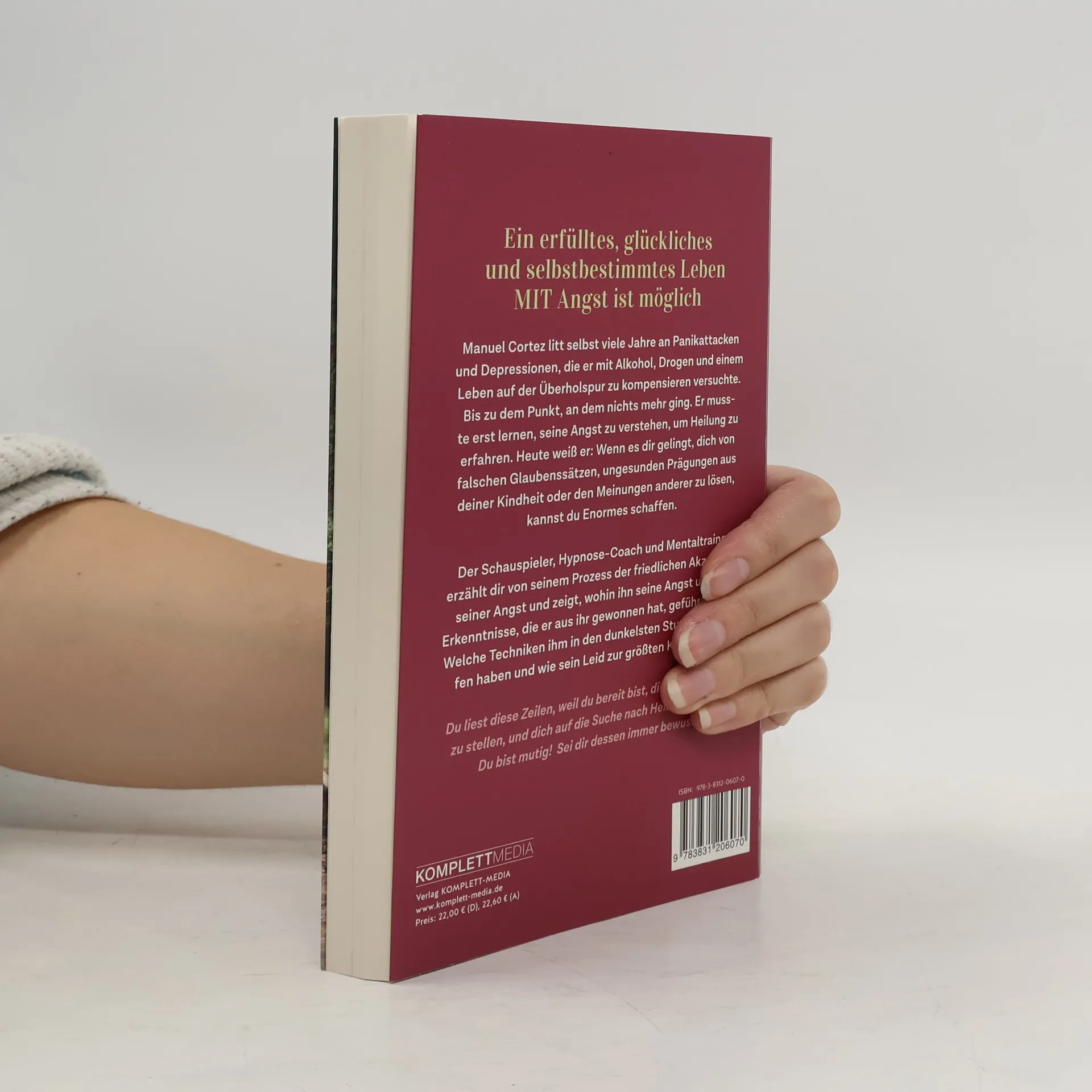 Panikattacken, große Selbstzweifel und Depressionen begleiten den Schauspieler und Künstler Manuel Cortez jahrelang. Ein Leben auf der Überholspur, im ständigen Schatten von Angststörungen und der Furcht zu versagen. Angst, dass alle merken könnten, welch zerbrechlicher Mensch hinter der selbstsicheren und coolen Maske steckt. Nach einem langen Weg der Selbsterkenntnis, des Hinfallens und wieder Aufstehens, der Therapie, Ausbildungen und Selbstheilung, veröffentlicht Manuel Cortez in »Angst im Gepäck« seine Erfahrungen und Techniken, die ihn von Ängsten und falschen Glaubenssätzen befreit haben. Die wichtigsten Erkenntnisse eines wilden und freien Lebens. Er nimmt den Leser/die Leserin mit zu den entscheidenden Etappen seines Lebens – zu seiner Kindheit unterwegs im Wohnwagen durch ganz Europa, zu den Dreharbeiten seiner bekannten Filme und Serien wie »Verliebt in Berlin«, zu seinem Sieg bei »Let’s Dance«, der privat zu seiner größten Herausforderung wurde. Dieses Buch zeigt, wie man trotz großer Angst und Selbstzweifel, ein erfolgreiches und glückliches Leben führen kann. Seine wichtigste Erkenntnis: Nicht alles, was glänzt, ist Gold, und nichts im Leben geschieht grundlos.