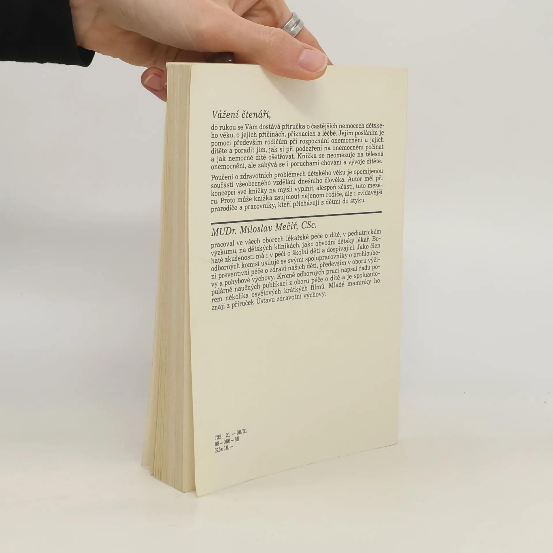 Je to příručka o častejších nemocech dětského věku,o jejich přičinách, příznacích a léčbě. Najdete tu rady na ošetření dítěte, podávání léků, křeče, hygiena, očkování, chřipka, spála, rány, jak vše ošetřit u dětí od narození až po školní období.