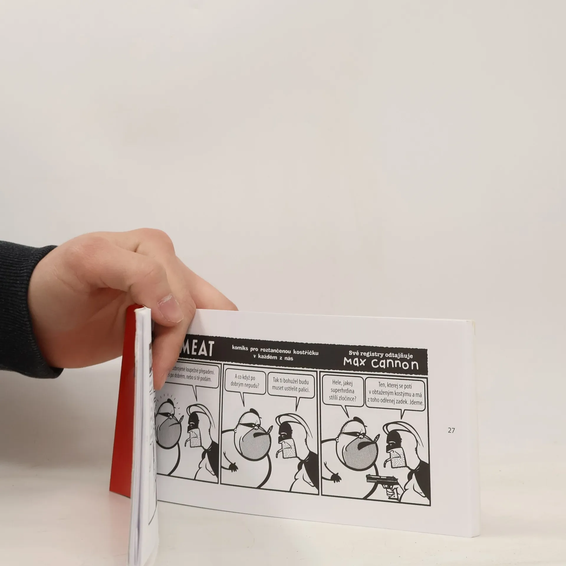 Kultovní komiks Red Meat se objevuje na stránkách amerického tisku už od roku 1989 a s nástupem internetu se stal kultem i u nás. Nakladatelství Albatros konečně nabízí knižní vydání prvního ze tří výborů, které připravil sám autor komiksu, Max Cannon. Na 110 stránkách pronikneme (možná hlouběji, než by bylo zdrávo) do autorova bizarního světa, plného černočerného humoru, kruté nadsázky, mrazivé ironie, psychopaticko-sadisticko-kriminologicko-laktačněautistického sarkasmu Red Meat je zkrátka, jak se vyjádřil jeden literární kritik,jediný americký komiks, který člověku polechtá bránici motorovou pilou. Je jen logické, že české vydání svou předmluvou do světa vypravil Petr Čtvrtníček, jehož humor se tomu Cannonovu dosti přibližuje.