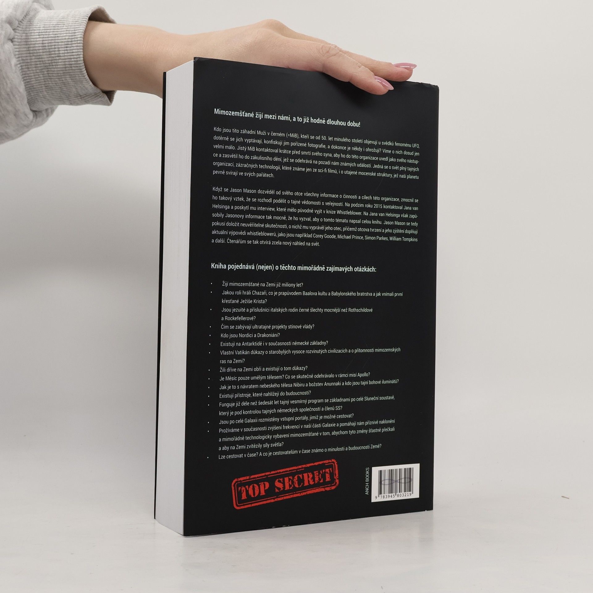Mimozemšťané žijí mezi námi, a to již hodně dlouhou dobu! Kdo jsou tito záhadní Muži v černém (MiB)? Od 50. let minulého století se objevují u fenoménu UFO, dotěrně se vyptávají svědků, konfiskují jim pořízené fotografie, a někdy je dokonce i ohrožují. Víme o nich dosud jen velmi málo. Jistý MiB kontaktoval krátce před smrtí svého syna, uvedl ho do této organizace jako svého nástupce a zasvětil do zákulisního dění, jež se odehrává na pozadí nám známých událostí. Jedná se o svět plný tajných organizací, zázračných technologií, které známe jen ze sci-fi filmů, i utajených mocenských struktur, jež naši planetu pevně svírají v pařátech. Když se Jason Mason dozvěděl od svého otce všechny informace o činnosti a cílech této organizace, zmocnil se ho takový vztek, že se rozhodl podělit o tajné vědomosti s veřejností. Na podzim roku 2015 kontaktoval Jana van Helsinga a poskytl mu interview, které mělo původně vyjít v knize Whistleblower!. Na Jana van Helsinga zapůsobily Jasonovy informace tak mocně, že ho vyzval, aby o tomto tématu napsal celou knihu. Jason Mason se tedy pokusil doložit neuvěřitelné skutečnosti, o nichž mu vyprávěl jeho otec, a jeho tvrzení i zjištění doplňují aktuální výpovědi whistleblowerů, například Coreye Goodea, Michaela Prince, Simona Parkese, Williama Tompkinse a dalších. Čtenářům se tak otvírá zcela nový náhled na svět.