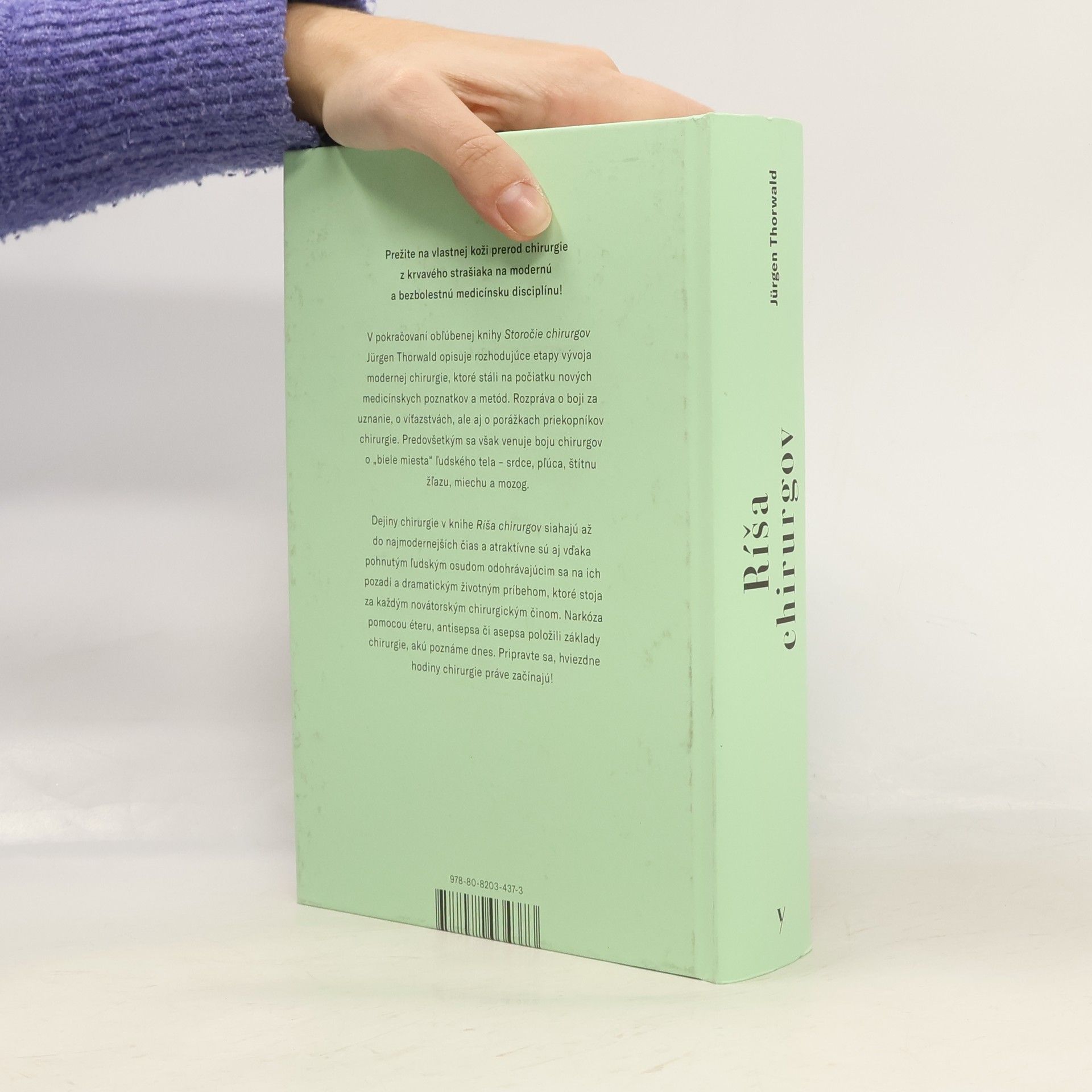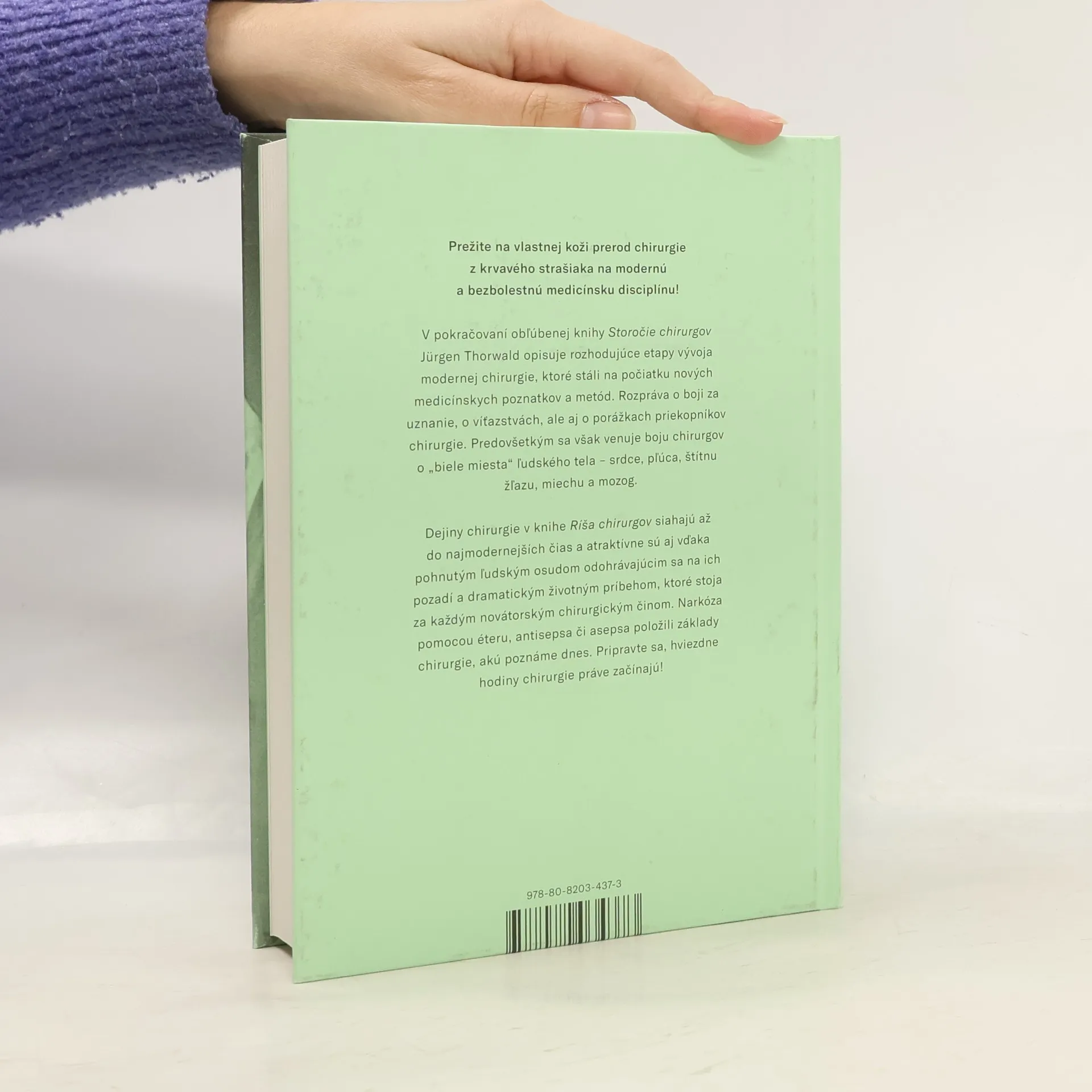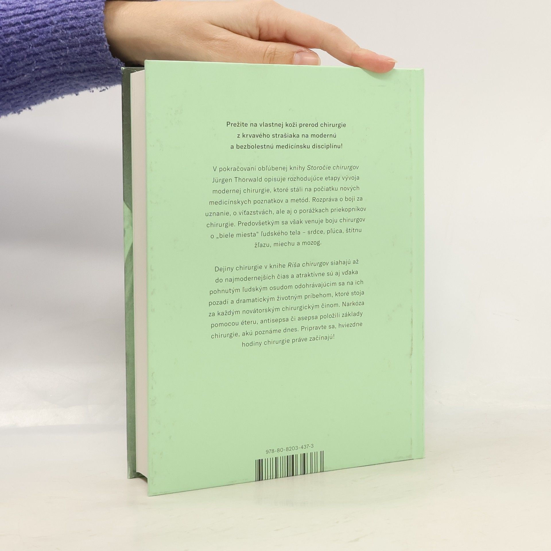 Prežite na vlastnej koži prerod chirurgie z krvavého strašiaka na modernú a bezbolestnú medicínsku disciplínu. Pokračovanie obľúbenej knihy Storočie chirurgov od Jürgena Thorwalda ponúka ďalšie príbehy pozoruhodných dejín medicíny. Šestnásteho októbra 1846 sa v Massachusetts General Hospital v Bostone uskutočnila prvá bezbolestná operácia pod narkózou, čo spustilo bezprecedentný vývoj modernej chirurgie. Thorwald opisuje rozhodujúce etapy prostredníctvom pôsobivých príhod, ktoré stáli na počiatku nových medicínskych poznatkov a metód. Rozpráva o boji za uznanie, víťazstvách a porážkach priekopníkov chirurgie. Knihy Jürgena Thorwalda predstavujú populárno-vedeckú literatúru v najlepšej podobe. S rozprávačským majstrovstvom nám približuje svety medicíny a kriminalistiky z nezvyčajných uhlov pohľadu. Ríša chirurgov, ktorá pôvodne vyšla v roku 1958, sa zaoberá bojom chirurgov o „biele miesta“ ľudského tela – srdce, pľúca, štítnu žľazu, miechu a mozog. Dejiny chirurgie siahajú až do najmodernejších čias a sú atraktívne vďaka pohnutým osudom a dramatickým životným príbehom, ktoré stoja za každým novátorským chirurgickým činom. Narkóza pomocou éteru, antisepsa či asepsa položili základy súčasnej chirurgie. Thorwald hovorí o ríši, ktorá vznikla z boja o život človeka, kde sú hrdinami lekári a lekárky.