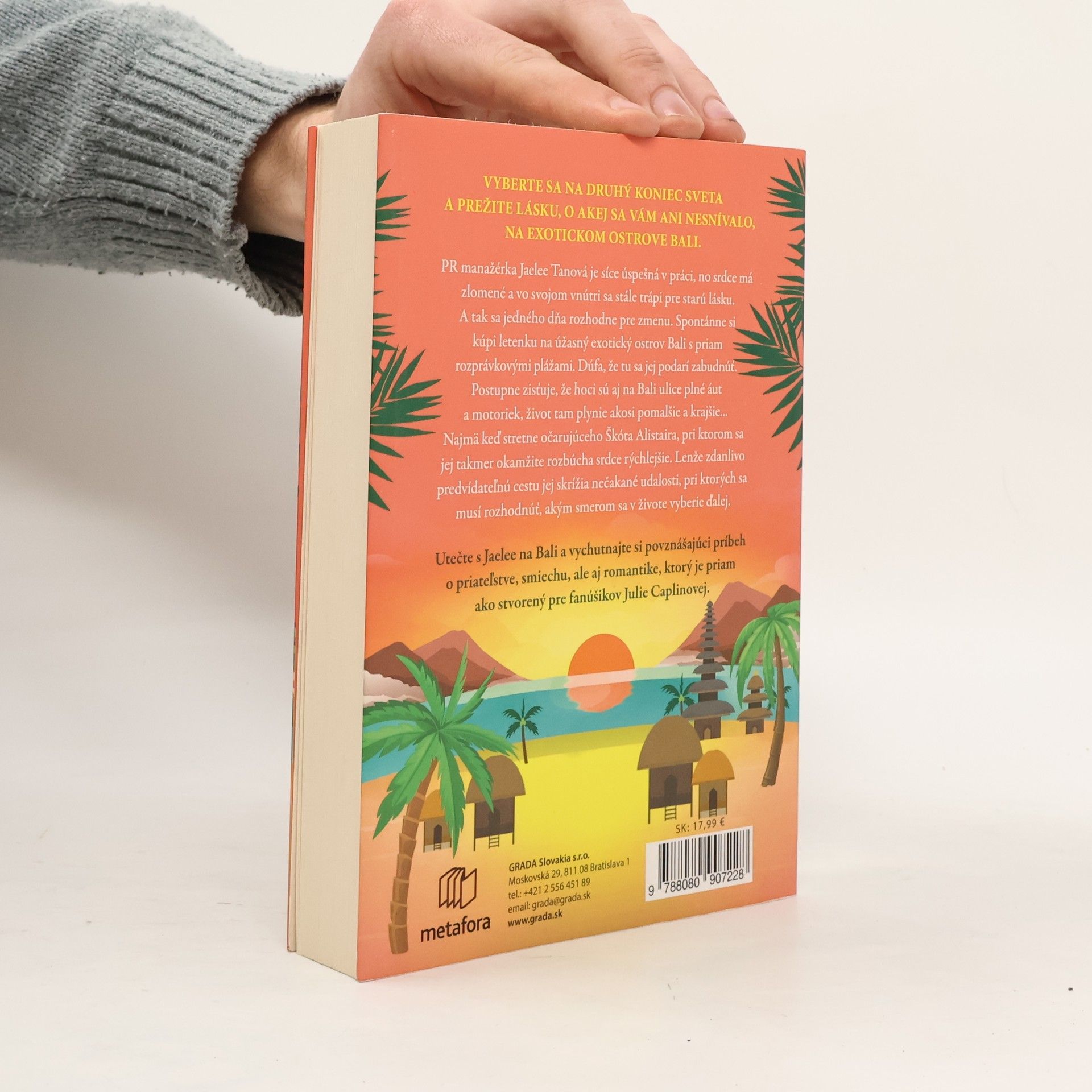 PR manažérka Jaelee Tanová je síce úspešná v práci, no srdce má zlomené a vo svojom vnútri sa stále trápi pre starú lásku. A tak sa jedného dňa rozhodne pre zmenu. Spontánne si kúpi letenku na úžasný exotický ostrov Bali s priam rozprávkovými plážami. Dúfa, že tu sa jej podarí zabudnúť. Postupne zisťuje, že hoci sú aj na Bali ulice plné áut a motoriek, život tam plynie akosi pomalšie a krajšie... Najmä, keď stretne očarujúceho Škóta Alistaira, pri ktorom sa jej takmer okamžite srdce rozbúcha rýchlejšie. Lenže zdanlivo predvídateľnú cestu jej skrížia nečakané udalosti, pri ktorých sa musí rozhodnúť, akým smerom sa v živote vyberie ďalej.
