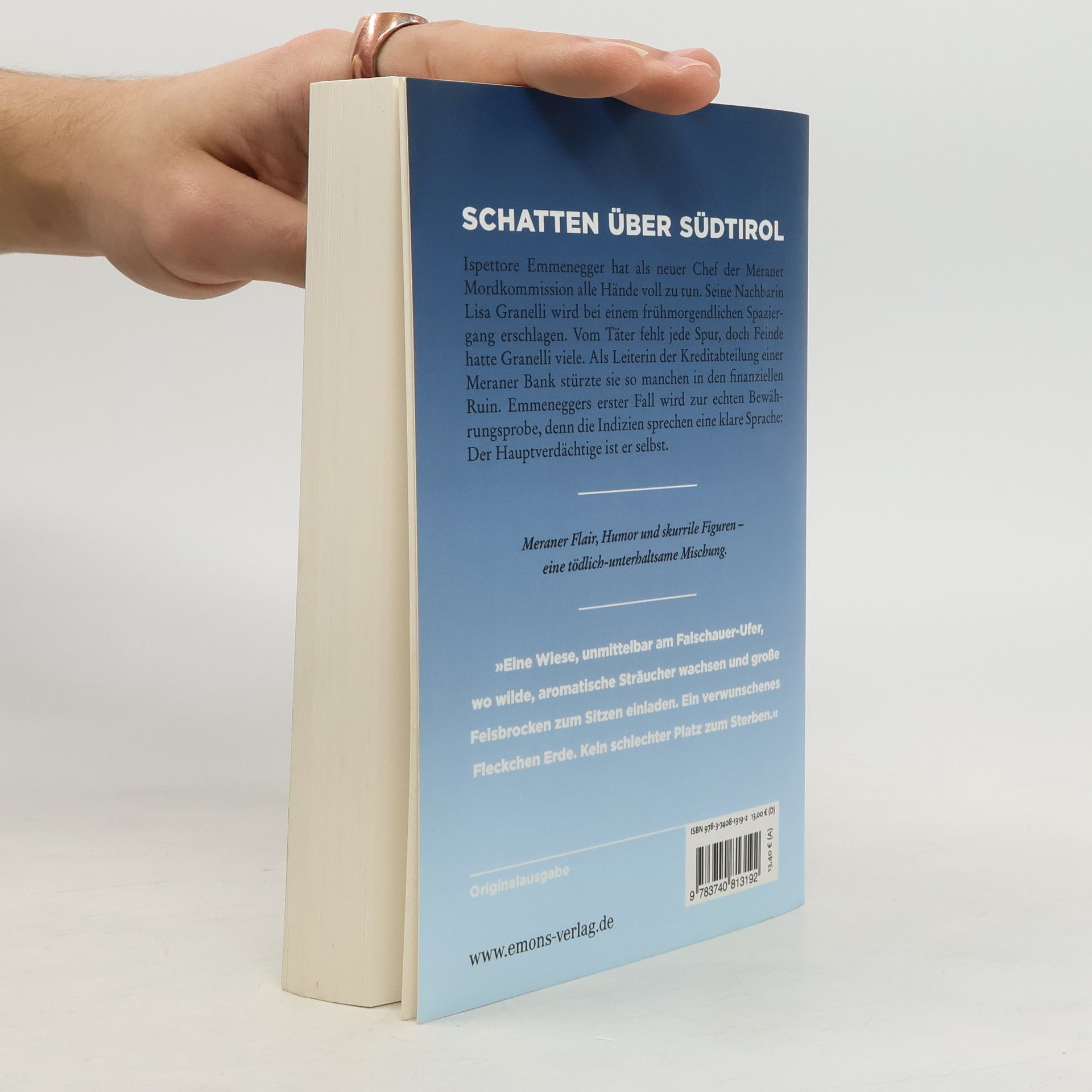 Meraner Atmosphäre, Humor und skurrile Figuren . . . eine tödlich-unterhaltsame Mischung. Ispettore Emmenegger hat als neuer Chef der Meraner Mordkommission alle Hände voll zu tun. Seine Nachbarin Lisa Granelli wird bei einer frühmorgendlichen Gassirunde erschlagen. Vom Täter fehlt jede Spur, und Feinde hatte Granelli viele. Als Leiterin der Kreditabteilung einer Meraner Bank stürzte sie so manchen in den finanziellen Ruin. Doch Emmeneggers erster Fall wird zur echten Bewährungsprobe, denn die Indizien sprechen eine klare Sprache: Der Hauptverdächtige ist er selbst.