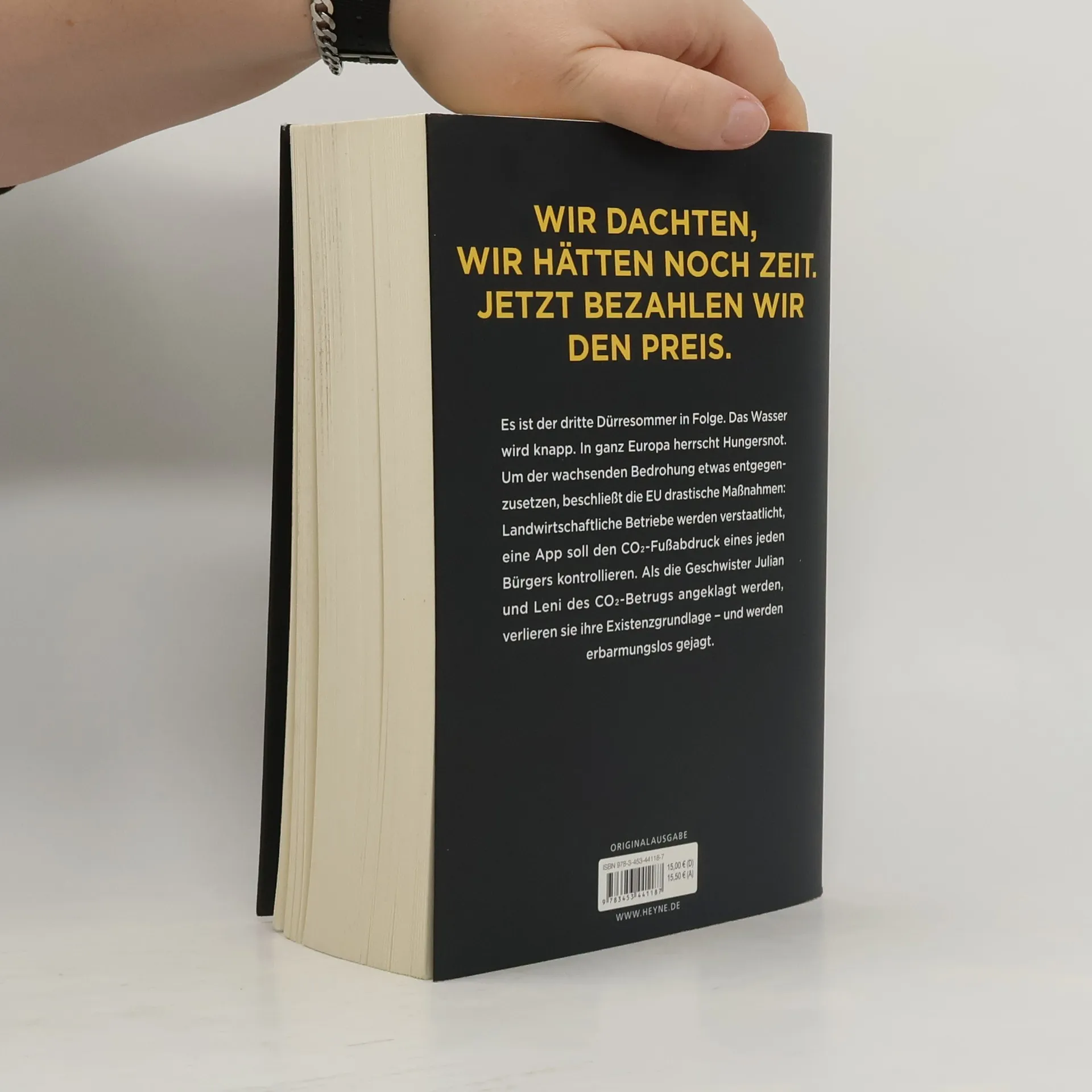 Wir dachten, wir hätten noch Zeit. Jetzt bezahlen wir den Preis. Der Klimawandel beschleunigt sich unaufhaltsam. Dürren und Ernteausfälle nehmen weltweit zu. In ganz Europa herrscht Hungersnot. Um der wachsenden Bedrohung etwas entgegenzusetzen, beschließen die Länder drastische Maßnahmen: Landwirtschaftliche Betriebe werden verstaatlicht, eine App soll den CO2-Fußabdruck eines jeden Bürgers kontrollieren. Als die Geschwister Julian und Leni des CO2-Betrugs angeklagt werden, verlieren sie ihre Existenzgrundlage – und werden erbarmungslos gejagt.