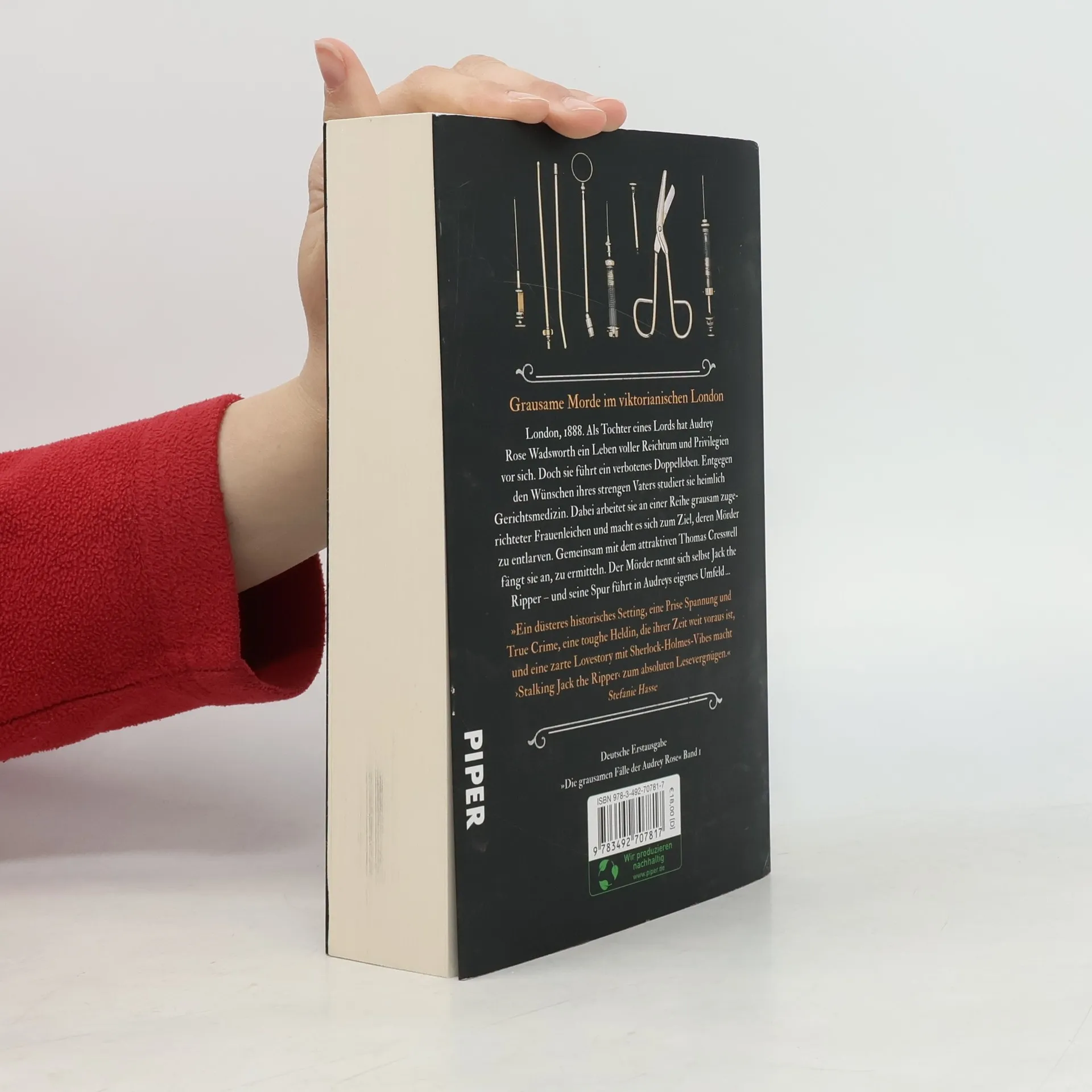 Die beliebte Debütreihe von Kerri Maniscalco endlich auf Deutsch – mit Farbschnitt in der 1. Auflage! London, im Jahr 1888. Audrey Rose Wadsworth ist die Tochter eines Lords und hat ein Leben voller Reichtum und Privilegien vor sich. Doch zwischen Teeverabredungen und Kleideranproben führt sie ein verbotenes Doppelleben. Entgegen den Wünschen ihres strengen Vaters und den Erwartungen der Gesellschaft schleicht sich Audrey oft in das Labor und den Hörsaal ihres Onkels, um Gerichtsmedizin zu studieren. Dabei arbeitet sie an einer Reihe grausam zugerichteter Leichen und stößt auf Ungereimtheiten. Gemeinsam mit dem attraktiven Thomas Cresswell fängt sie an zu ermitteln – schnell wird klar, dass sie sich auf der Spur des berüchtigten Serienmörders Jack the Ripper befinden. Die Suche nach Antworten führt Audrey zurück in ihr eigenes Umfeld … und zu einem furchtbaren Geheimnis. Das atemberaubend spannende Debüt der Spiegel-Bestsellerautorin Kerri Maniscalco – inspiriert von den Whitechapel-Morden rund um Jack the Ripper! Weitere Bände der Reihe: Stalking Jack the Ripper. Die Spur in den Schatten (Band 1) Hunting Prince Dracula. Die gefährliche Jagd (Band 2) Weitere Bände in Vorbereitung.