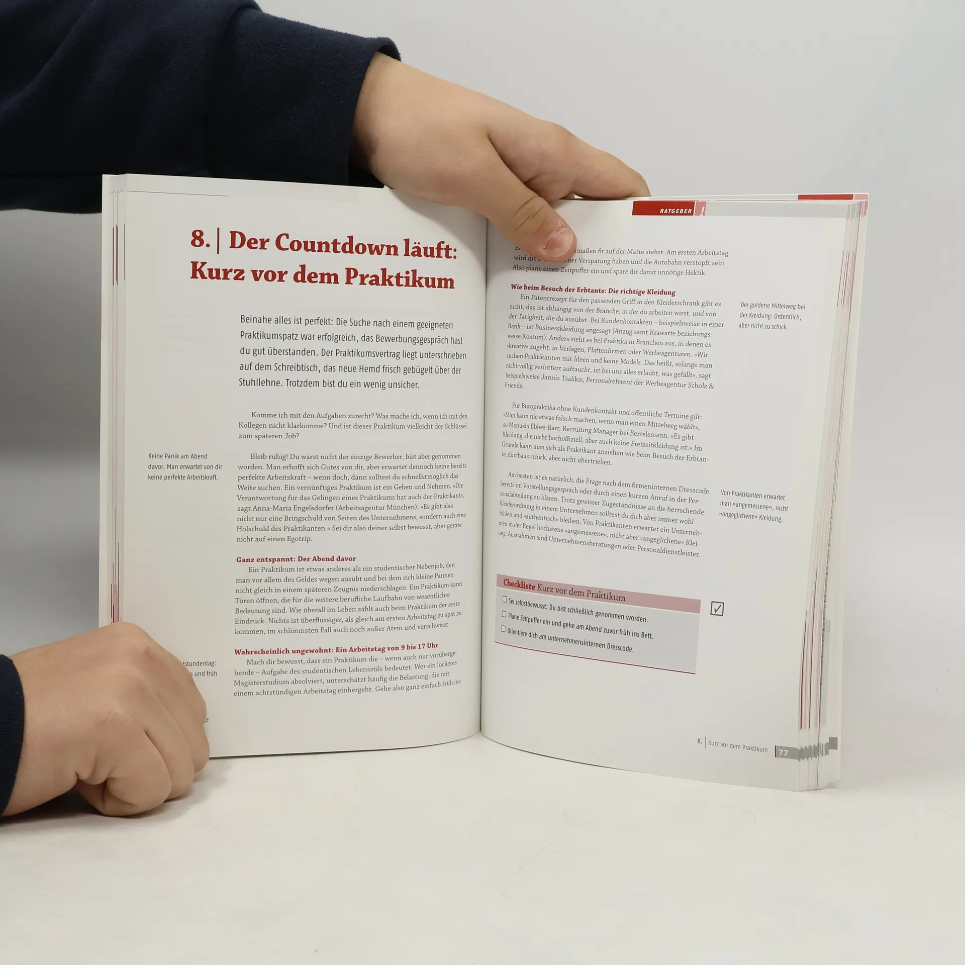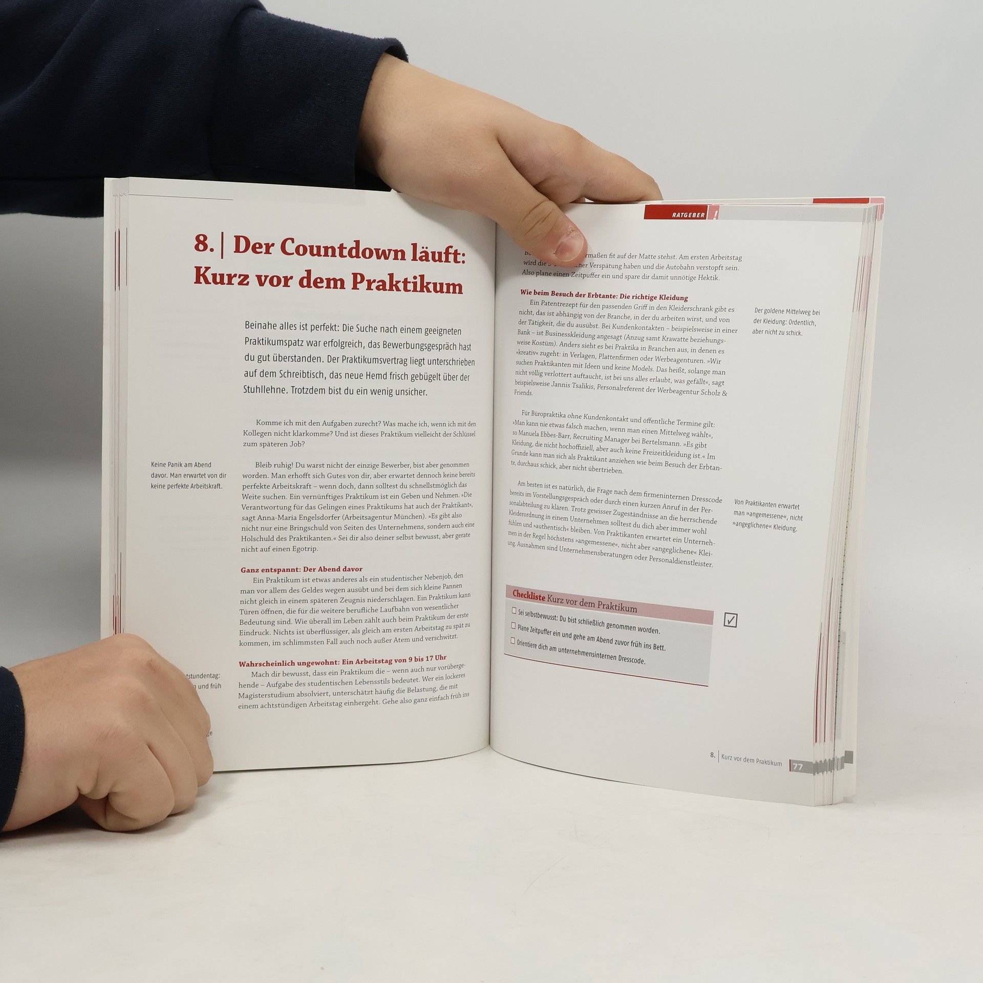 Einige Pressestimmen heben die wertvolle Aufbereitung der Themen hervor, die durch kleine grafische Elemente die Navigation erleichtern. Der PraktikumsKnigge bietet auf etwa 200 Seiten umfassende Informationen für Schulabgänger, Studenten und Absolventen, um Praktika als Karrierebaustein zu nutzen. Das Redaktionsteam des Münchner Studentenverlags hat zahlreiche eigene Erfahrungen und relevantes Wissen zusammengetragen. Es werden verschiedene Arten von Praktika behandelt und deren Auswirkungen auf Steuer, Versicherung, Arbeitsrecht und Bafög erklärt. Zudem wird die Kunst des Netzwerkens nach Unternehmensbesuchen thematisiert. Der Knigge vermittelt, wie man aus selbstkritischem Auftreten eine selbstbewusste Bewerbung entwickelt und beantwortet Fragen zu Verhaltensregeln am Arbeitsplatz. In 19 Kapiteln kommen Experten und Betroffene zu Wort, darunter Personalchefs, Professoren und Führungskräfte aus verschiedenen Branchen. Auch die Stimmen von (Ex-)Praktikanten sind wichtig, die von ihren persönlichen Erfahrungen berichten. Ein Sonderteil beleuchtet die Medienbranche, insbesondere Journalismus und Öffentlichkeitsarbeit, und bietet Einblicke von Arbeitgebern, Gewerkschaftern und PR-Experten, die die Herausforderungen und Anforderungen dieser Branche realistisch darstellen.