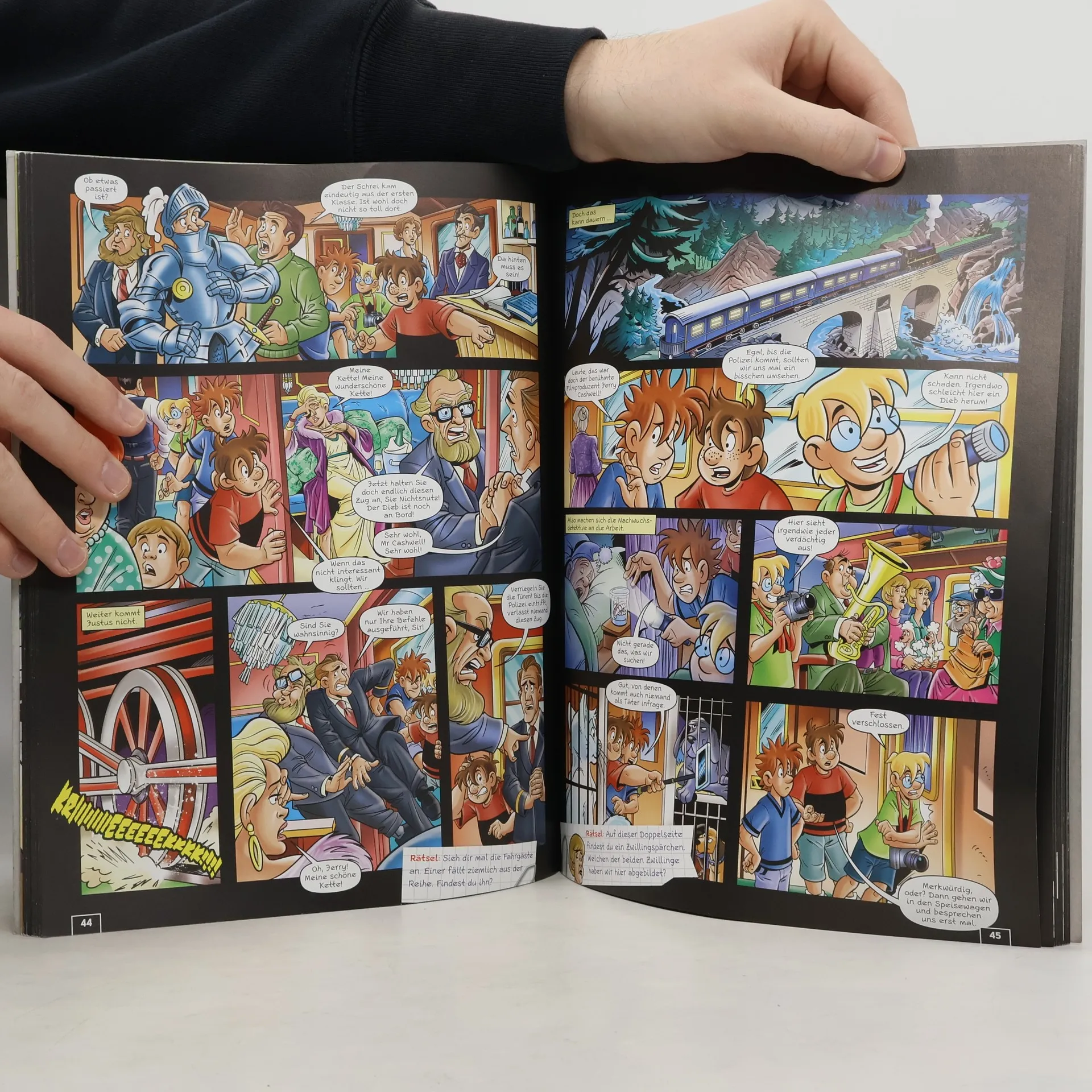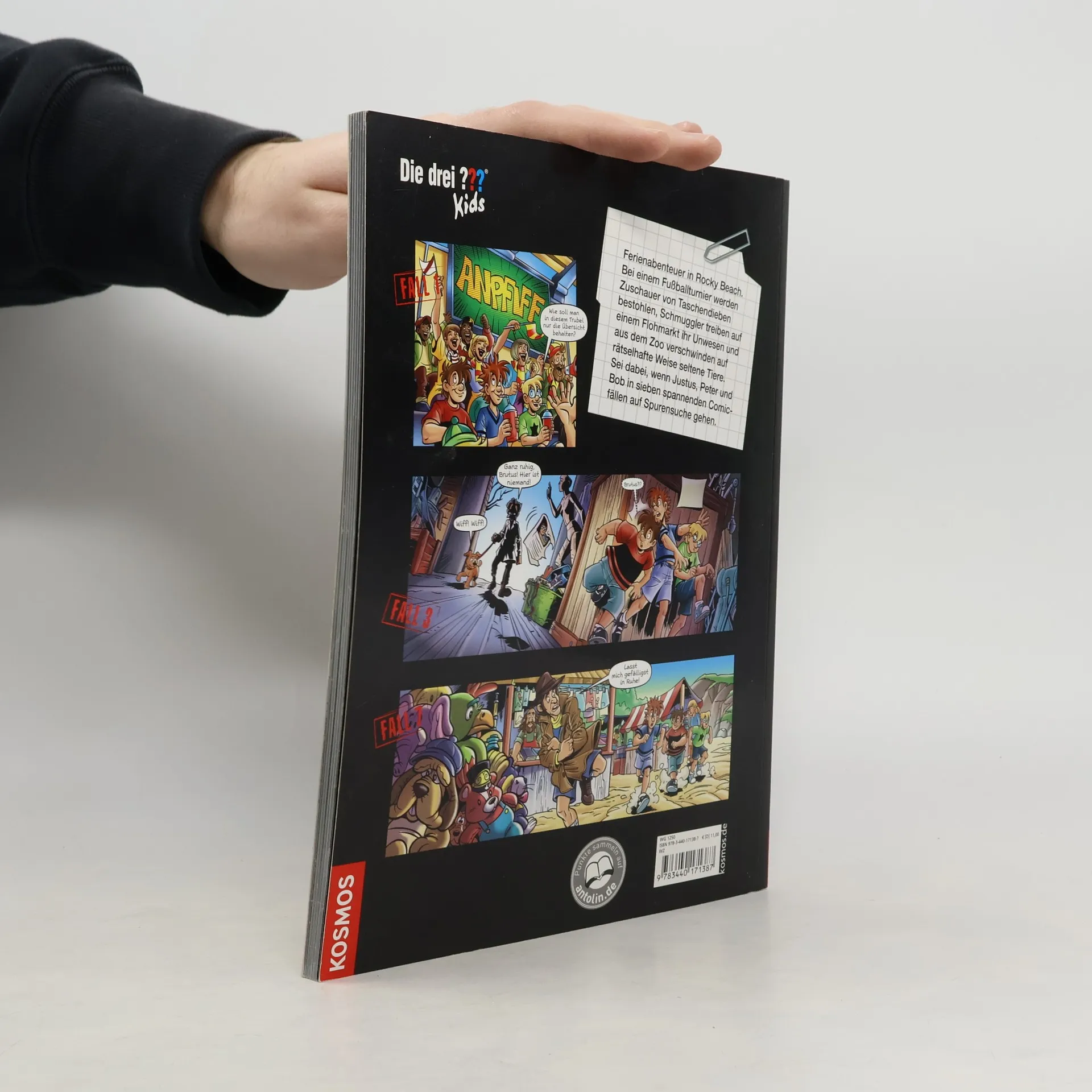 Justus, Peter und Bob sind beste Freunde und Detektive! Zusammen haben die drei ??? schon viele knifflige Fälle gelöst. Rocky Beach in Aufruhr! Bei einem Fußballturnier werden Zuschauer bestohlen, Schmuggler treiben auf einem Flohmarkt ihr Unwesen und aus dem Zoo verschwinden auf rätselhafte Weise seltene Tiere. Nur Justus, Peter und Bob können Licht ins Dunkel bringen! Die sieben coolen Cartoons, kombiniert mit spannenden Knobeleien, begeistern alle Kids, die Comics lieben.