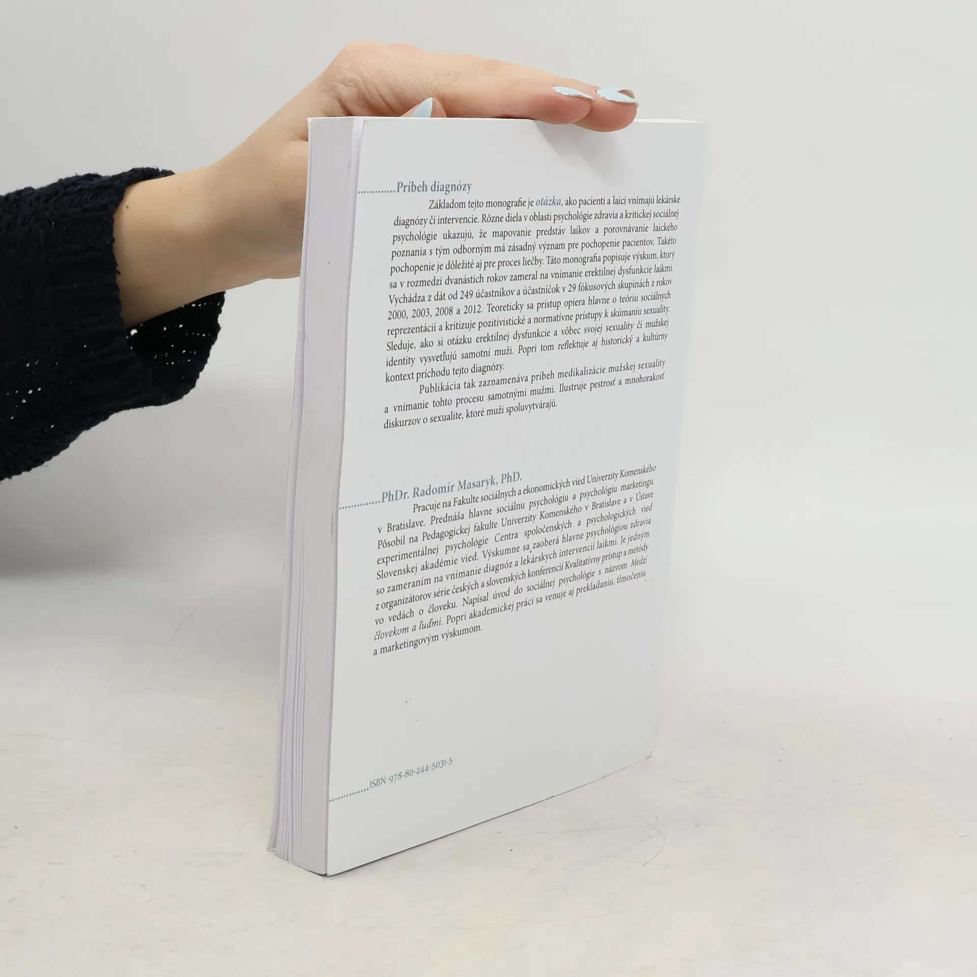 Základom tejto monografie je otázka, ako pacienti a laici vnímajú lekárske diagnózy ci intervencie. Rôzne diela v oblasti psychológie zdravia a kritickej sociálnej psychológie ukazujú, že mapovanie predstáv laikov a porovnávanie laického poznania s tým odborným má zásadný význam pre pochopenie pacientov. Takéto pochopenie je dôležité aj pre proces liečby. Táto monografia popisuje výskum, ktorý sa v rozmedzí dvanástich rokov zameral na vnímanie erektilnej dysfunkcie laikmi. Vychádza z dát od 249 účastníkov a účastníčok v 29 fókusových skupinách z rokov 2000, 2003, 2008 a 2012. Teoreticky sa prístup opiera hlavne o teóriu sociálnych reprezentácií a kritizuje pozitivistické a normatívne prístupy k skúmaniu sexuality. Sleduje, ako si otázku erektilnej dysfunkcie a vôbec svojej sexuality ci mužskej identity vysvetľujú samotní muži. Popri tom reflektuje aj historický a kultúrny kontext príchodu tejto diagnózy. Publikácia tak zaznamenáva príbeh medikalizácie mužskej sexuality a vnímanie tohto procesu samotnými mužmi. Ilustruje pestrosť a mnohorakosť diskurzov o sexualite, ktoré muži spoluvytvárajú.