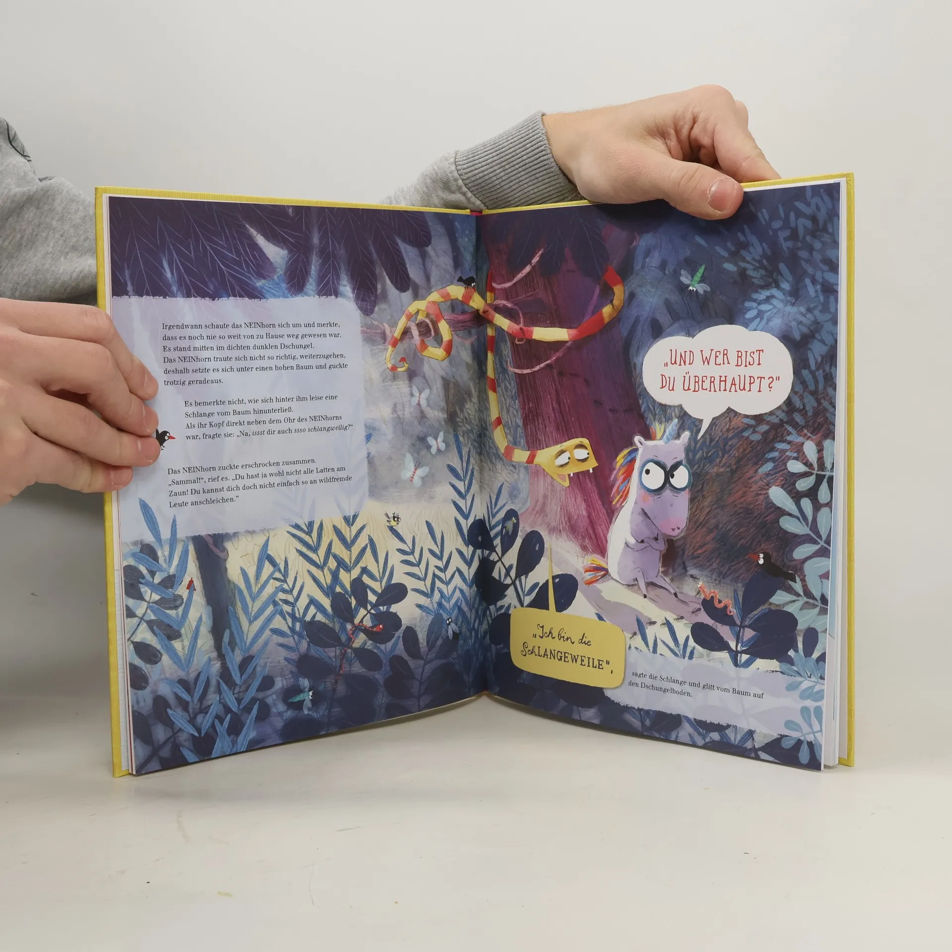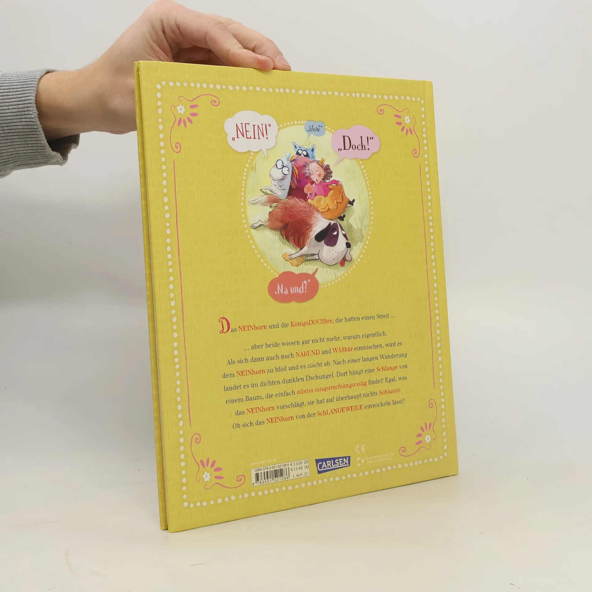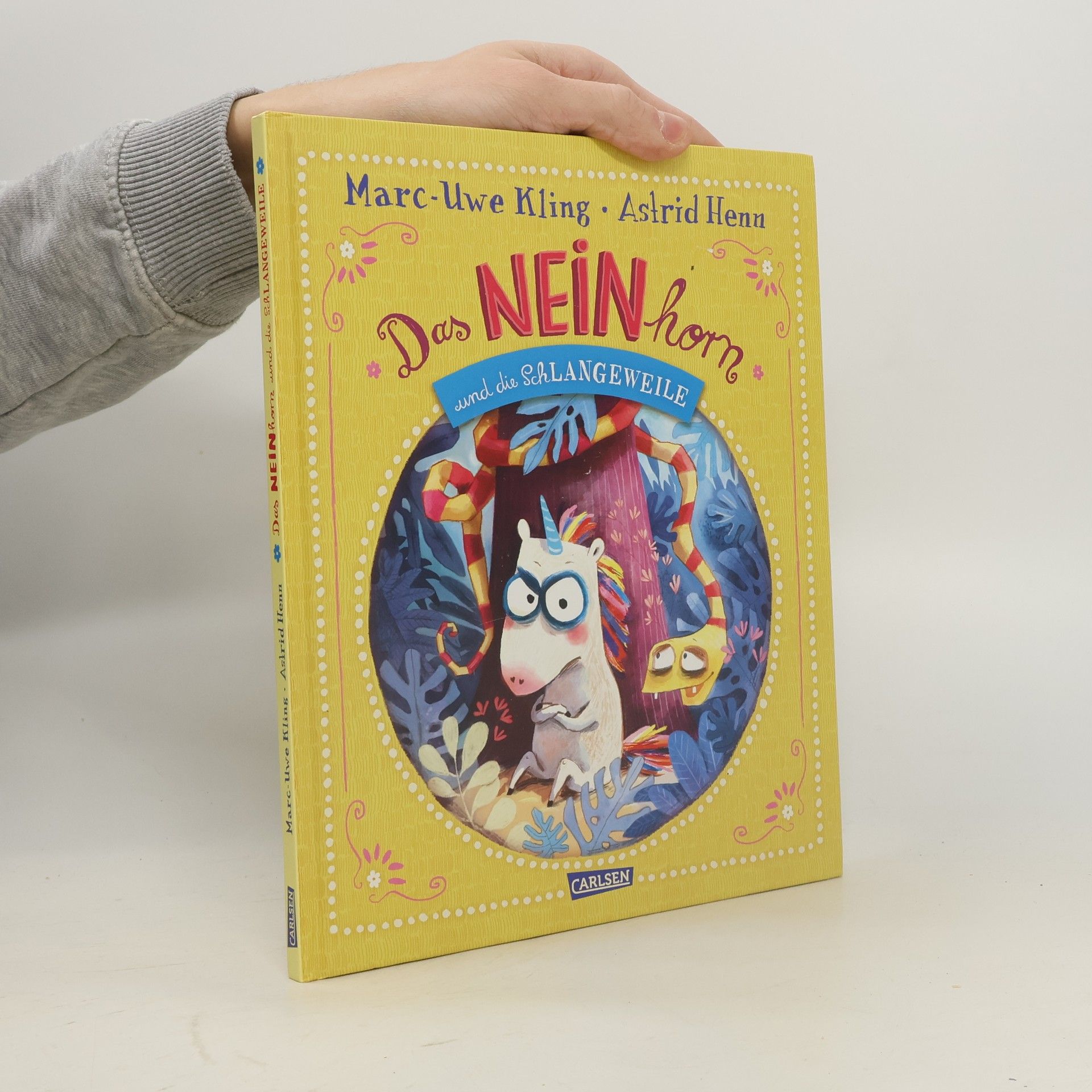 Das NEINhorn und die KönigsDOCHter, die hatten einen Streit ... ... aber beide wissen nicht mehr, worum es geht. Als sich der NAhUND zum Erzieher aufspielt, wird es dem NEINhorn zu blöd und es zischt ab. Nach einer langen Wanderung landet es im dichten dunklen Dschungel, wo die SchLANGEWEILE von einem Assst runterhängt und allesss sssuper schlangweilig findet! Egal, was das NEINhorn vorschlägt, sie hat keine Schlussst darauf. Ob sich das NEINhorn von der SchLANGEWEILE einwickeln lässt? Mit phänomenaler Panorama-Ausklappseite Mit Schleiterspiel für noch mehr Spaß Mit Eintragseite zum Mitmachen Und mit vielen weiteren witzigen Tieren Eine neue witzige Geschichte von Marc-Uwe Kling über das schnickeldischnuckelig süße NEINhorn und seinen Umgang mit der SchLANGEWEILE – zum Vorlesen, Selbstlesen, Lachen und Entdecken. Großartig illustriert von Astrid Henn.